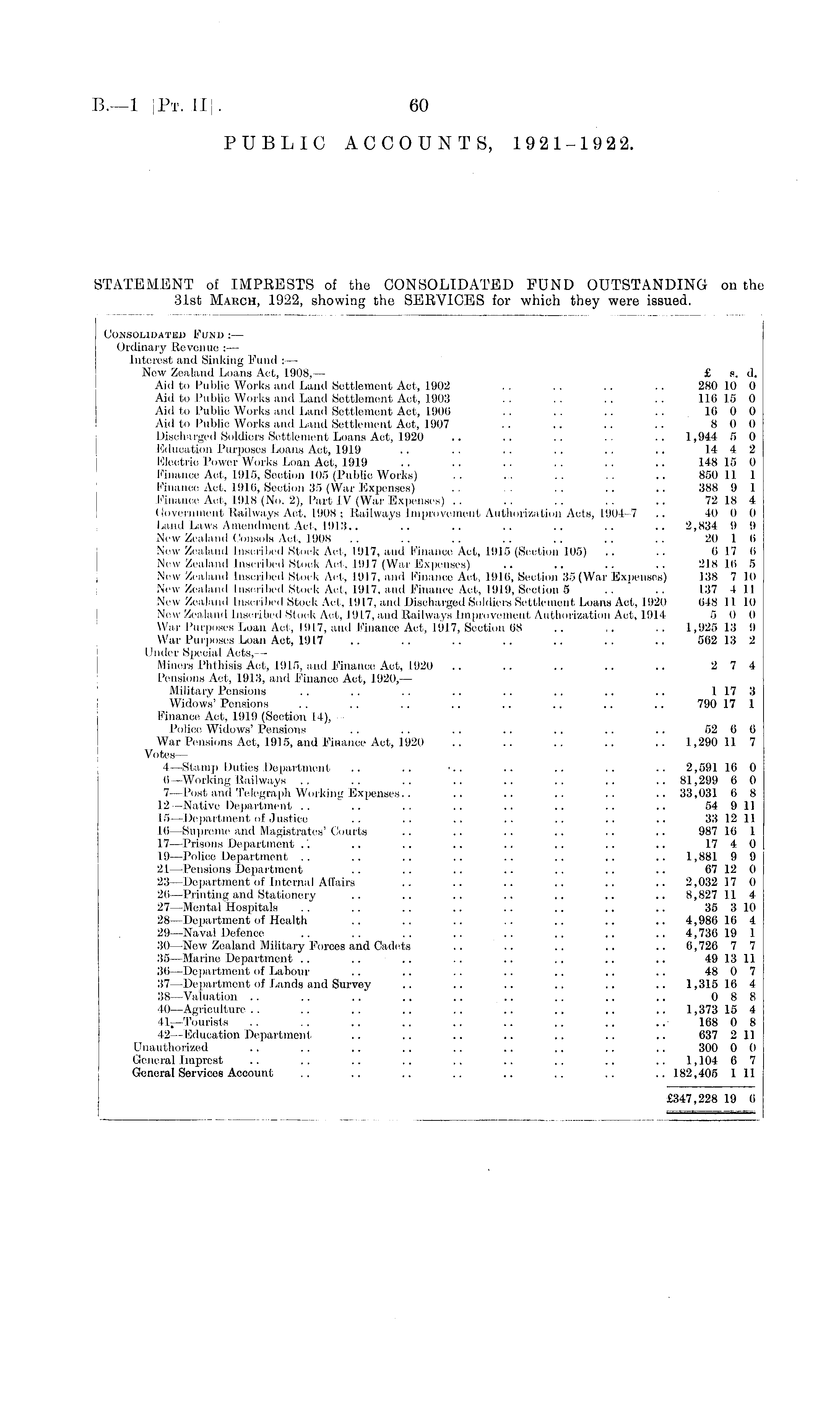 Consolidated Fund :— Ordinary Revenue :— Interest and Sinking Fund : — New Zealand Loans Act, 1908, — £ s. d. Aid to Public Works and Land Settlement Act, 1902 .. .. .. .. 280 10 0 Aid to Public Works and Land Settlement Act, 1903 .. .. .. .. 116 15 0 Aid to Publio Works and Land Settlement Act, 1906 .. .. .. .. 16 0 0 Aid to Public Works and Lund Settlement Act, 1907 .. .. .. .. 8 0 0 Discharged Soldiers Settlement Loans Aot, 1920 .. .. .. .. .. 1,944 5 0 Education Purposes Loans Act, 1919 .. . . . . . . . . .. 14 4 2 Eleotrie Power Works Loan Aot, 1919 .. .. .. .. .. .. 148 15 0 Finance Aot, 1915, Seotion 105 (Publio Works) .. ... .. .. .. 850 11 1 Finance Act. 1916, Section 35 (War Expenses) .. . . . . .. .. 388 9 1 Finance Aot, 1918 (No. 2), Part IV (War Expenses) .. .. .. .. .. 72 18 4 Government Railways Aot, 1908: Railways Improvement Authorization Acts, 1904-7 .. 40 0 0 Land Laws Amendment Aot, 1913.. .. .. .. .. .. .. 2,834 9 9 New Zealand Consols Aot, 1908 .. .. .. .. .. .. .. 20 1 6 New Zealand Inscribed Stuck Act, 1917, and Finance Act, 1915 (Section 105) . . .. 6 17 6 New Zealand Inscribed Stock Aot, 1917 (War Expenses) .. .. .. .. 218 16 5 New Zealand [nsoribed Stock Art, 1917, and Finance Act, 1916, Section 35(War Expenses) 138 7 10 New Zealand Inscribed Stock Act, 1917, and Finance Act, 1919, Section 5 .. .. 137 411 New Zealand Inscribed Stock Act, 1917, ami Discharged Soldiers Settlement Loans Act, 1920 648 11 10 New Zealand Inscribed Stuck Act, 1917, and Railways Improvement Authorization Act, 1914 5 0 0 War Purposes Loan Act, 1917, and Finance Act, 1917, Seotion 68 .. .. .. 1,925 13 9 War Purposes Loan Act, 1917 .. .. .. .. .. .. .. 562 13 2 Under Special Acts, — Miners Phthisis Act, 1915, and Finance Act, 1920 .. .. .. .. .. 2 7 4 Pensions Act, 1913, and Finance Act, 1.920, — Military Pensions . . . . .. .. .. .. .. .. 1 17 3 Widow's' Pensions . . . . .. .. .. .. .. .. 790 17 1 Finance Act, 1919 (Section 14),— Police Widows' Pensions . . .. .. . . .. .. .. 52 6 6 War Pensions Act, 1915, and Finance Act, 1920 .. .. .. .. .. 1,290 11 7 Votes— 4—.Stamp Duties Department .. .. •.. .. .. .. .. 2,59116 0 o—Working Railways .. .. .. .. .. .. .. .. 81,299 6 0 7—Post and Telegraph Working Expenses.. .. .. .. .. .. 33,031 6 8 12—Native Department .. .. .. .. .. .. .. .. 54 9 11 15—Department of Justice .. .. .. .. .. .. .. 33 12 11 16—Supreme and Magistrates' Courts .. .. .. .. .. .. 987 16 1 17 —Prisons Department .'. .. .. .. .. .. .. .. 17 4 0 19—Police Department .. .. .. .. .. .. .. .. 1,881 9 9 21—Pensions Department . . .. .. .. .. .. .. 07 12 0 23—Department of Internal Affairs .. .. .. .. .. .. 2,032 17 0 26—Printing and Stationery .. .. .. .. .. .. .. 8,827 11 4 27—Mental Hospitals . . .. .. .. . . .. .. .. 35 310 28—Department of Health .. .. .. .. .. .. .. 4,986 16 4 29—Naval Defence .. .. .. .. .. .. .. .. 4,736 19 1 30 —New Zealand Military Forces and Cadets .. .. .. .. .. 0,726 7 7 35 —Marine Department .. .. .. .. .. .. .. .. 49 13 11 36—Department of Labour .. .. .. .. .. .. .. 48 0 7 37 —Department of Lands and Survey .. .. .. .. .. .. 1,315 16 4 38—Valuation .. .. .. .. .. .. .. .. .. 088 40—Agriculture .. .. .. .. .. .. .. .. .. 1,373 15 4 41—Tourists .. .. .. .. .. .. .. .. .. 168 0 8 42—Education Department .. .. .. .. .. .. .. 637 211 Unauthorized .. .. .. .. .. .. .. .. .. 300 0 0 General Imprest .. .. .. .. .. .. .. .. .. 1,104 0 7 General Services Account .. .. .. .. .. .. .. .. 182,405 1 11 £347,228 19 0