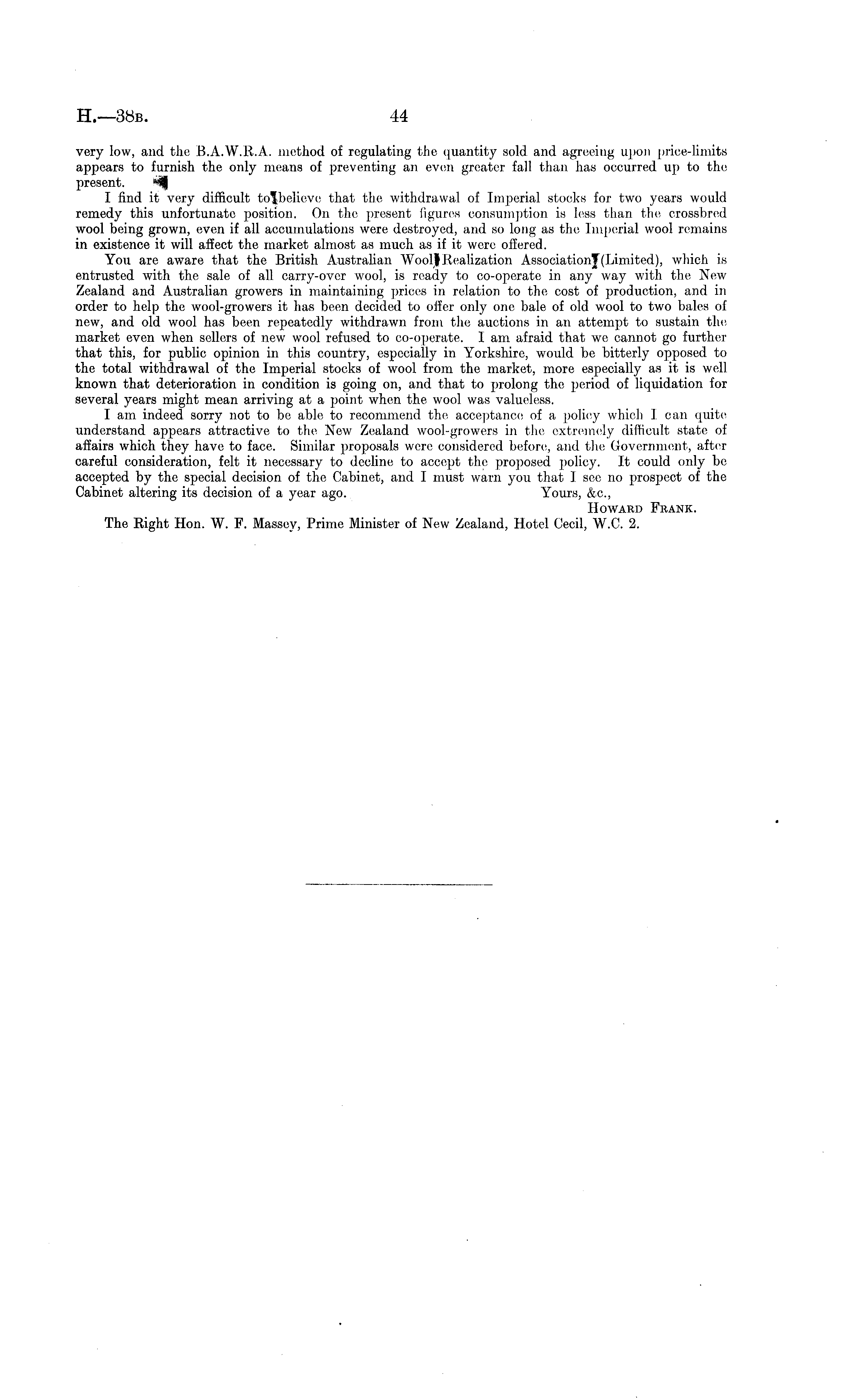 very low, and the B.A.W.R.A. method of regulating the quantity sold and agreeing upon price-limits appears to furnish the only means of preventing an even greater fall than has occurred up to the present. '"If I. find it very difficult tofbelieve that the withdrawal of Imperial stocks for two years would remedy this unfortunate position. On the present figures consumption is loss than the crossbred wool being grown, even if all accumulations were destroyed, and so long as the Imperial wool remains in existence it will affect the market almost as much as if it were offered. You are aware that the British Australian Wool}Realization Association|"(Limited), which is entrusted with the sale of all carry-over wool, is ready to co-operate in any way with the New Zealand and Australian growers in maintaining prices in relation to the cost of production, and in order to help the wool-growers it has been decided to offer only one bale of old wool to two bales of new, and old wool has been repeatedly withdrawn from the auctions iti an attempt to sustain the market even when sellers of new wool refused to co-operate. lam afraid that we cannot go further that this, for public opinion in this country, especially in Yorkshire, would be bitterly opposed to the total withdrawal of the Imperial stocks of wool from the market, more especially as it is well known that deterioration in condition is going on, and that to prolong the period of liquidation for several years might mean arriving at a point when the wool was valueless. I am indeed sorry not to be able, to recommend the acceptance of a policy which I can quite understand appears attractive to the. New Zealand wool-growers in tin: extremely difficult state of affairs which they have to face. Similar proposals were considered before, and the Government, after careful consideration, felt it necessary to decline to accept the proposed policy. It could only be accepted by the special decision of tho Cabinet, and I must warn you that I sec no prospect of the Cabinet altering its decision of a year ago. Yours, &c., Howard Frank. The Right Hon. W. F. Massey, Prime Minister of New Zealand, Hotel Cecil, W.C. 2.