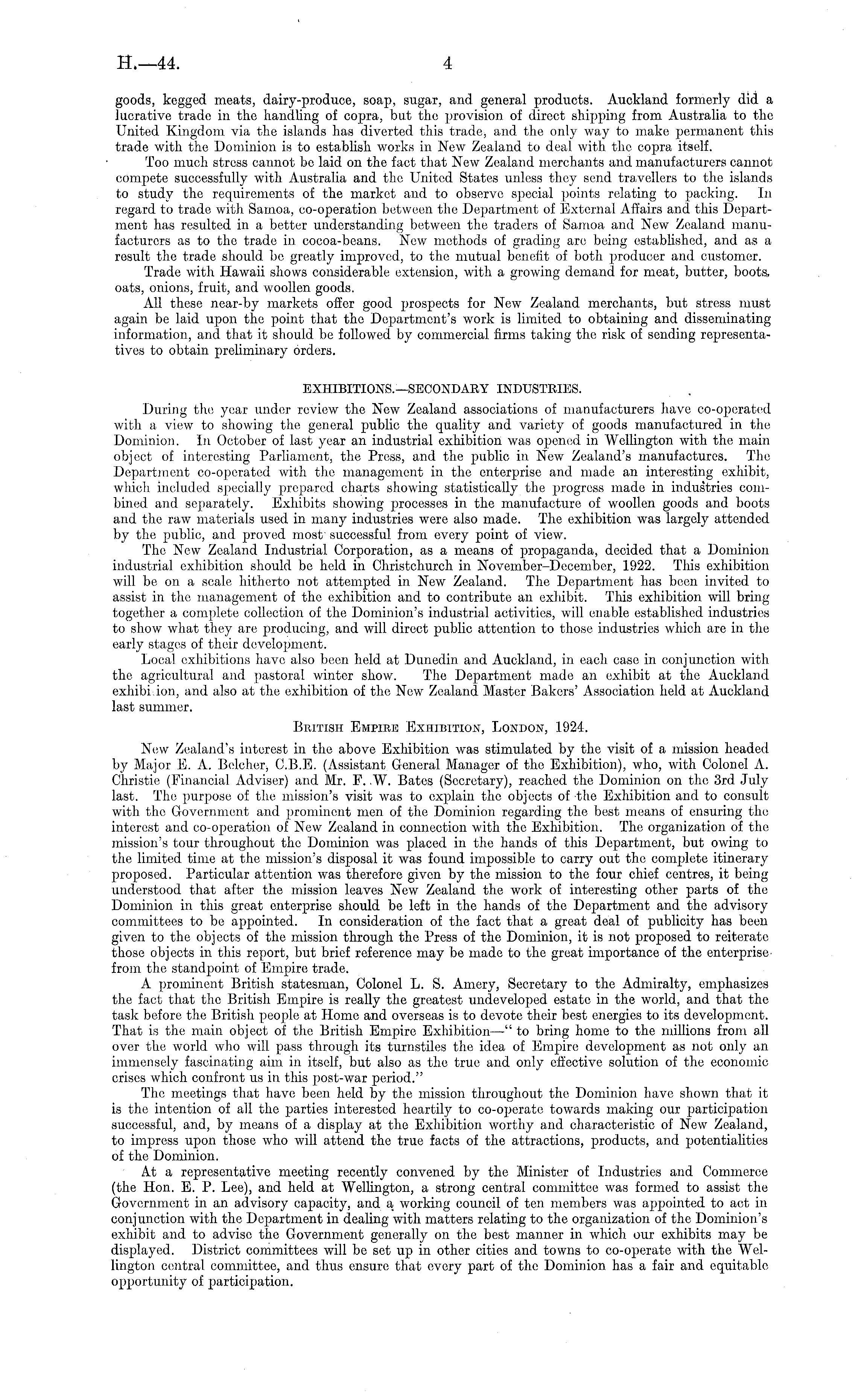 goods, kcgged meats, dairy-produce, soap, sugar, and general products. Auckland formerly did a lucrative trade in the handling of copra, but the provision of direct shipping from Australia to the United Kingdom via the islands has diverted this trade, and the only way to make permanent this trade with the Dominion is to establish works in New Zealand to deal with the copra itself. Too much stress cannot be laid on the fact that New Zealand merchants and manufacturers cannot compete successfully with Australia and the United States unless they send travellers to the islands to study the requirements of the market and to observe special points relating to packing. In regard to trade with Samoa, co-operation between the Department of External Affairs and this Department has resulted in a better understanding between the traders of Samoa and New Zealand manufacturers as to the trade in cocoa-beans. New methods of grading are being established, and as a result the trade should be greatly improved, to the mutual benefit of both producer and customer. Trade with Hawaii shows considerable extension, with a growing demand for meat, butter, boots, oats, onions, fruit, and woollen goods. All these near-by markets offer good prospects for New Zealand merchants, but stress must again be laid upon the point that the Department's work is limited to obtaining and disseminating information, and that it should be followed by commercial firms taking the risk of sending representatives to obtain preliminary orders. EXHIBITIONS.—SECONDARY INDUSTRIES. During the year under review the Now Zealand associations of manufacturers have co-operated with a view to showing the general public the quality and variety of goods manufactured in the Dominion. In October of last year an industrial exhibition was opened in Wellington with the main object of interesting Parliament, the Press, and the public in. New Zealand's manufactures. The Department co-operated with the management in the enterprise and made an interesting exhibit, which included specially prepared charts showing statistically the progress made in industries combined, and separately. Exhibits showing processes in the manufacture of woollen goods and boots and the raw materials used in many industries were also made. The exhibition was largely attended by the public, and proved most successful from every point of view. The New Zealand Industrial Corporation, as a means of propaganda, decided that a Dominion industrial exhibition should be held in Christchurch in November-December, 1922. This exhibition will be on a scale hitherto not attempted in New Zealand. The Department has been invited to assist in the management of the exhibition and to contribute an exhibit. This exhibition will bring together a complete collection of the Dominion's industrial activities, will enable established industries to show what they are producing, and will direct public attention to those industries which are in the early stages of their development. Local exhibitions have also been held at Dunedin and Auckland, in each case in conjunction with the agricultural and pastoral winter show. The Department made an exhibit at the Auckland exhibition, and also at the exhibition of the New Zealand Master Bakers' Association held at Auckland last summer. British Empieb Exhibition, London, 1924. New Zealand's interest in the above Exhibition was stimulated by the visit of a mission headed by Major E. A. C.B.E. (Assistant General Manager of the Exhibition), who, with Colonel A. Christie (Financial Adviser) and Mr. F. .W. Bates (Secretary), reached the Dominion on the 3rd July last. The purpose of the mission's visit was to explain the objects of the Exhibition and to consult with the Government and prominent men of the Dominion regarding the best means of ensuring the interest and co-operation of New Zealand in connection with the Exhibition. The organization of the mission's tour throughout the Dominion was placed in the hands of this Department, but owing to the limited time at the mission's disposal it was found impossible to carry out the complete itinerary proposed. Particular attention was therefore given by the mission to the four chief centres, it being understood that after the mission leaves New Zealand the work of interesting other parts of the Dominion in this great enterprise should be left in the hands of the Department and the advisory committees to be appointed. In consideration of the fact that a great deal of publicity has been given to the objects of the mission through the Press of the Dominion, it is not proposed to reiterate those objects in this report, but brief reference may be made to the groat importance of the enterprise from the standpoint of Empire trade. A prominent British statesman, Colonel L. S. Amery, Secretary to the Admiralty, emphasizes the fact that the British Empire is really the greatest undeveloped estate in the world, and that the task before the British people at Home and overseas is to devote their best energies to its development. That is the main object of the British Empire Exhibition —" to bring home to the millions from all over the world who will pass through its turnstiles the idea of Empire development as not only an immensely fascinating aim in itself, but also as the true and only effective solution of the economic crises which confront us in this post-war period." The meetings that have been held by the mission throughout the Dominion have shown that it is the intention of all the parties interested heartily to co-operate towards making our participation successful, and, by means of a display at the Exhibition worthy and characteristic of New Zealand, to impress upon those who will attend the true facts of the attractions, products, and potentialities of the Dominion. At a representative meeting recently convened by the Minister of Industries and Commerce (the Hon. E. P. Lee), and held at Wellington, a strong central committee 