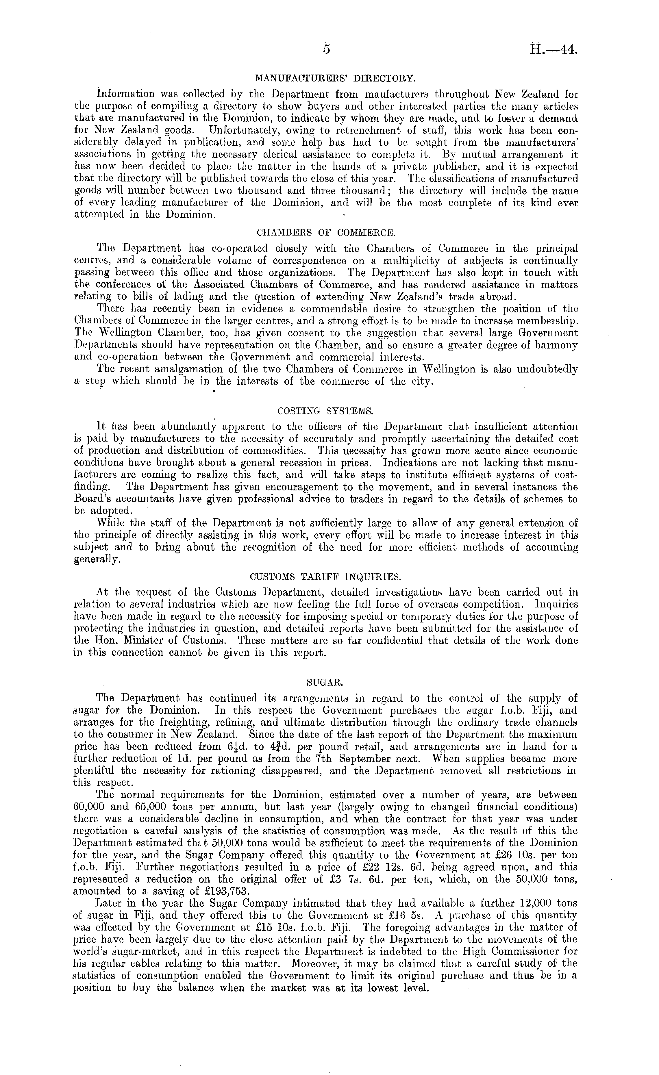MANUFACTURERS' DIRECTORY. Information was collected by the Department from maufacturcrs throughout New Zealand for the purpose of compiling a directory to show buyers and other interested parties the many articles that are manufactured in the Dominion, to indicate by whom they are made, and to foster a demand for New Zealand goods. Unfortunately, owing to retrenchment of staff, this work has been considerably delayed in publication, and some help has had to be sought from the manufacturers' associations in getting the necessary clerical assistance; to complete it. By mutual arrangement it has now been decided to place; the matter in the hands of a private publisher, and it is expected that the directory will be published towards the close of this year. The classifications of manufactured goods will number between two thousand and three thousand; the directory will include the name of every leading manufacturer of the Dominion, and will be the most complete of its kind ever attempted in the Dominion. CHAMBERS OF COMMERCE. The Department has co-operated closely with the Chambers of Commerce in the principal centres, and a considerable volume of correspondence on a multiplicity of subjects is continually passing between this office and those organizations. The Department has also kept in touch with the conferences of the Associated Chambers of Commerce, and has rendered assistance in matters relating to bills of lading and the question of extending New Zealand's trade abroad. There has recently been in evidence a commendable desire to strengthen the position of the Chambers of Commerce in the larger centres, and a strong effort is to be made to increase membership. The Wellington Chamber, too, has given consent to the suggestion that several large Government Departments should have representation on the Chamber, and so ensure a greater degree of harmony and co-operation between the Government and commercial interests. The recent amalgamation of the two Chambers of Commerce in Wellington is also undoubtedly a step which should be in the interests of the commerce of the city. COSTING SYSTEMS. It has been abundantly apparent to the officers of the Department that insufficient attention is paid by manufacturers to the necessity of accurately and promptly ascertaining the detailed cost of production and distribution of commodities. This necessity has grown more acute since economic conditions have brought about a general recession in prices. Indications are not lacking that manufacturers are coming to realize this fact, and will take steps to institute efficient systems of costlinding. The Department has given encouragement to the movement, and in several instances the Board's accountants have given professional advice to traders in regard to the details of schemes to be adopted. While the staff of the Department is not sufficiently large to allow of any general extension of the principle of directly assisting in this work, every effort will be made to increase interest in this subject and to bring about the recognition of the need for more efficient methods of accounting generally. CUSTOMS TARIFF INQUIRIES. At the request of the Customs Department, detailed investigations have been carried out in relation to several industries which are now feeling the full force of overseas competition, inquiries have been made in regard to the necessity for imposing special or temporary duties for the purpose of protecting the industries in question, and. detailed reports have been submitted for the assistance of the Hon. Minister of Customs. These matters are so far confidential that details of the work done in this connection cannot be given in this report. SUGAR. The Department has continued its arrangements in regard to the control of the supply of sugar for the Dominion. In this respect the Government purchases the sugar f.o.b. Fiji, and arranges for the freighting, refining, and ultimate distribution through the ordinary trade channels to the consumer in New Zealand. Since the date of the last report of the Department the maximum price has been reduced from 6|d. to 4fd. per pound retail, and arrangements are in hand for a further reduction of Id. per pound as from the 7th September next. When supplies became more plentiful the necessity for rationing disappeared, and the Department removed all restrictions in this respect. The normal requirements for the Dominion, estimated over a number of years, are between 60,000 and 65,000 tons per annum, but last year (largely owing to changed financial conditions) there was a considerable decline in consumption, and when the contract for that year was under negotiation a careful analysis of the statistics of consumption was made. As the result of this the Department estimated thj t 50,000 tons would be sufficient to meet the requirements of the Dominion for the year, and the Sugar Company offered this quantity to the Government at £26 10s. per ton f.o.b. Fiji. Further negotiations resulted in a price of £22 12s. 6d. being agreed upon, and this represented a reduction on the original offer of £3 7s. 6d. per ton, which, on the 50,000 tons, amounted to a saving of £193,753. Later in the year the Sugar Company intimated that they had available a further 12,000 tons of sugar in Fiji, and they offered this to the Government at £16 ss. A purchase of this quantity was effected by the Government at £15 10s. f.o.b. Fiji. The foregoing advantages in the matter of price have been largely due to the close attention paid by the Department to the movements of the world's sugar-market, and in this respect the Department is indebted to the High Commissioner for his regular cables relating to this matter. Moreover, it may be claimed that a careful study of the statistics of consumption enabled the Government to limit its original purchase and thus be in a position to buy the balance when the market was at its lowest level.