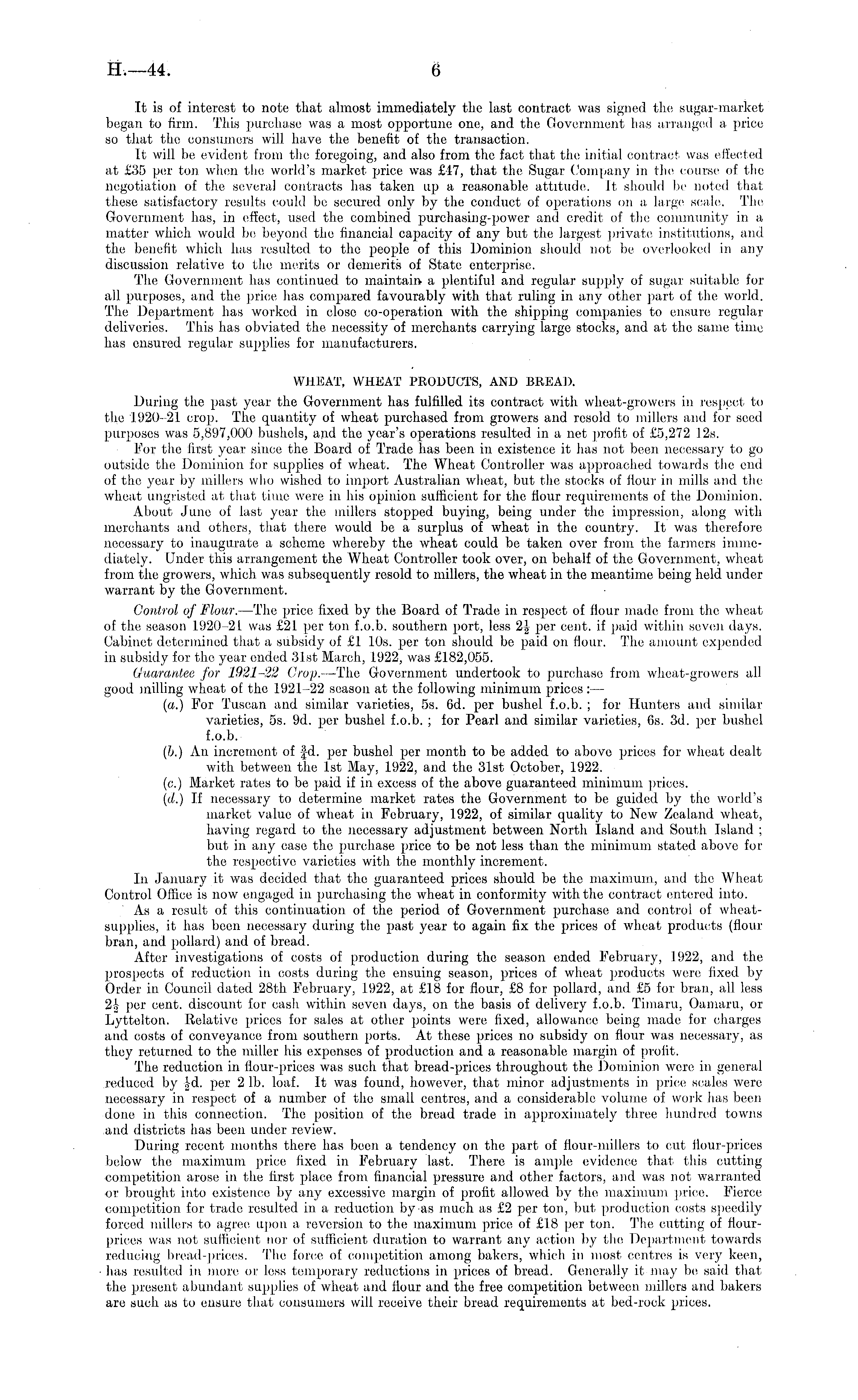 It is of interest to note that almost immediately the last contract was signed the sugar-market began to firm. Tins purchase was a most opportune one, and the Government has arranged a price so that the consumers will have the benefit of the transaction. It will be evident from the foregoing, and also from the fact that the initial contract was effected at £35 per ton when the world's market price was £17, that the Sugar Company in the course of the negotiation of the several contracts has taken up a reasonable attitude. It should be noted that these satisfactory results could be secured only by the conduct of operations on a large , scale;. The Government has, in effect, used the combined purchasing-power and credit of the community in a matter which, would be beyond the financial capacity of any but the largest private institutions, and the benefit which has resulted to the people of this Dominion should not be overlooked in any discussion relative to the merits or demerits of State enterprise. The Government has continued to maintain, a plentiful and regular supply of sugar suitable for all purposes, and the price has compared favourably with that ruling in any other part of the world. The Department has worked in close co-operation with the shipping companies to ensure regular deliveries. This has obviated the necessity of merchants carrying large stocks, and at the same time has ensured regular supplies for manufacturers. WHEAT, WHEAT PRODUCTS, AND BREAD. During the past year the Government has fulfilled its contract with wheat-growers in respect to the 1920-21 crop. The quantity of wheat purchased from growers and resold to millers and for seed purposes was 5,897,000 bushels, and the year's operations resulted in a net profit of £5,272 12s. For the first year since the Board of Trade has been in existence it has not been necessary to go outside the Dominion for supplies of wheat. The Wheat Controller was approached towards the end of the year by millers who wished to import Australian wheat, but the stocks of flour in mills and the wheat ungristed at that time were in his opinion sufficient for the flour requirements of the Dominion. About June of last year the millers stopped buying, being under the impression, along with merchants and others, that there would be a surplus of wheat in the country. It was therefore necessary to inaugurate a scheme whereby the wheat could be taken over from the farmers immediately. Under this arrangement the Wheat Controller took over, on behalf of the Government, wheat from the growers, which was subsequently resold to millers, the wheat in the meantime being held under warrant by the Government. Control of Flour. —The price fixed by the Board of Trade in respect of flour made from the wheat of the season 1920-2 L was £21 per ton f.o.b. southern port, less 2| per cent, if paid within seven days. Cabinet determined that a subsidy of £1 10s. per ton should be paid on flour. The amount expended in subsidy for the year ended 31st March, 1922, was £182,055. Guarantee for 1921-22 Crop. —The Government undertook to purchase from wheat-growers all good milling wheat of the 1921-22 season at the following minimum prices : — (a.) For Tuscan and similar varieties, ss. 6d. per bushel f.o.b. ; for Hunters and similar varieties, ss. 9d. per bushel f.o.b. ; for Pearl and similar varieties, 6s. 3d. per bushel f.o.b. (b.) An increment of |d. per bushel per month to be added to above prices for wheat dealt with between the Ist May, 1922, and the 31st October, 1922. (<;.) Market rates to be paid if in excess of the above guaranteed minimum prices. (d.) If necessary to determine market rates the Government to be guided by the world's market value of wheat in February, 1922, of similar quality to New Zealand wheat, having regard to the necessary adjustment between North Island and South Island ; but in any case the purchase price to be not less than the minimum stated above for the respective varieties with the monthly increment. In January it was decided that the guaranteed prices should be the maximum, and the Wheat Control Office is now engaged In purchasing the wheat in conformity with the contract entered into. As a result of this continuation of the period of Government purchase and control of wheatsupplies, it has been necessary during the past year to again fix the prices of wheat products (flour bran, and pollard) and of bread. After investigations of costs of production during the season ended February, 1922, and the prospects of reduction in costs during the ensuing season, prices of wheat products were fixed by Order in Council dated 28th February, 1922, at £18 for flour, £8 for pollard, and £5 for bran, all less 21 per cent, discount for cash within seven days, on the basis of delivery f.o.b. Tiinaru, Oamaru, or Lyttelton. Relative prices for sales at other points were fixed, allowance being made for charges and costs of conveyance from southern ports. At these prices no subsidy on flour was necessary, as they returned to the miller his expenses of production and a reasonable margin of profit. The reduction in flour-prices was such that bread-prices throughout the Dominion were in general reduced by id. per 2 lb. loaf. It was found, however, that minor adjustments in price scales were necessary in respect of a number of the small centres, and a considerable volume of work has been done in this connection. The position of the bread trade in approximately three hundred towns and districts has been under review. During recent months there has been a tendency on the part of flour-millers to cut flour-prices below the maximum price fixed in February last. There is ample evidence that this cutting competition arose in the first place from financial pressure and other factors, and was not warranted or brought into existence by any excessive margin of profit allowed by the maximum price. Fierce competition for trade resulted in a reduction by as muc