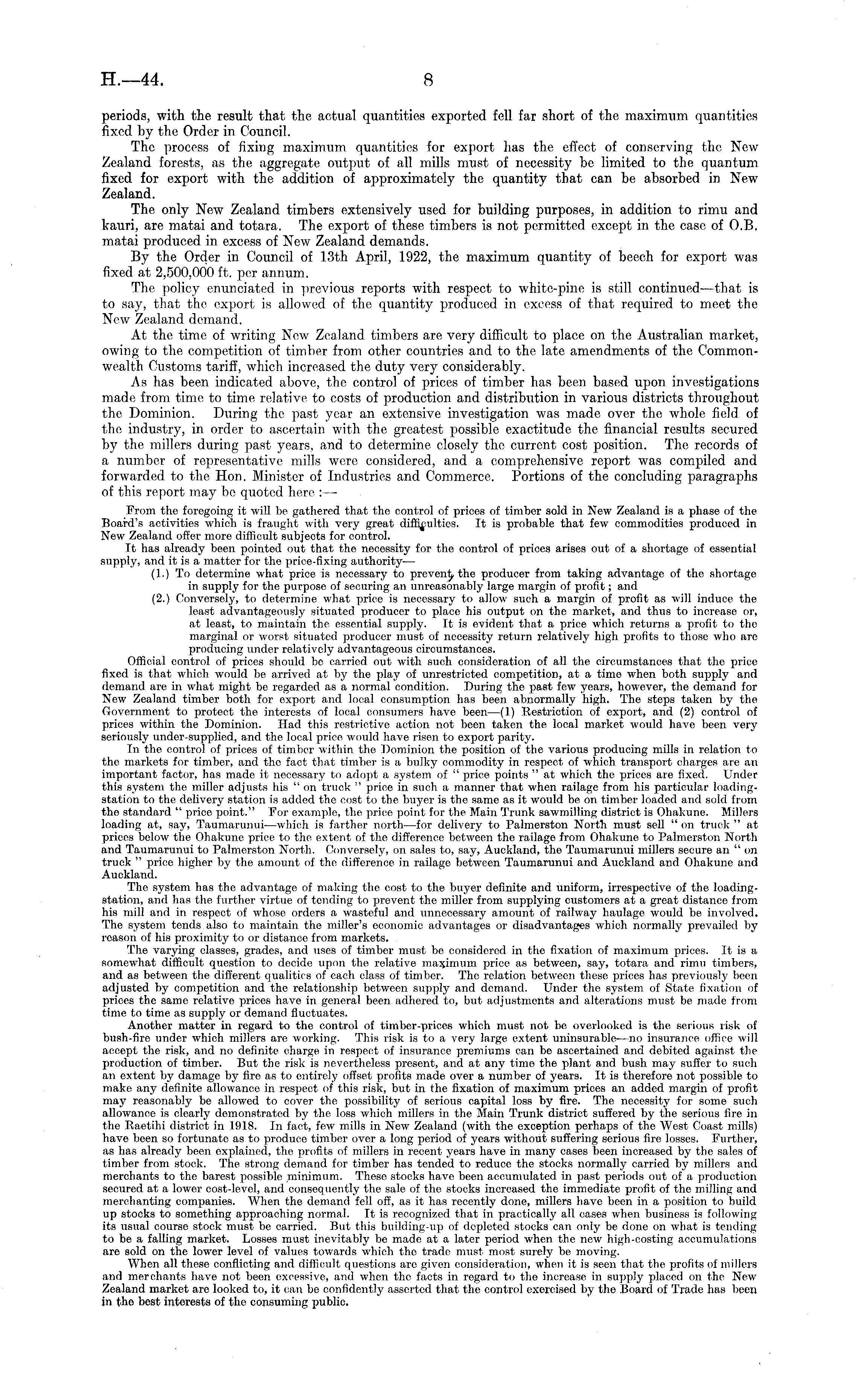 periods, with the result that the actual quantities exported fell far short of the maximum quantities fixed by the Order in Council. The process of fixing maximum quantities for export has the effect of conserving the New Zealand forests, as the aggregate output of all mills must of necessity be limited to the quantum fixed for export with the addition of approximately the quantity that can be absorbed in New Zealand. The only New Zealand timbers extensively used for building purposes, in addition to rimu and kauri, are matai and totara. The export of these timbers is not permitted except in the case of 0.8. matai produced in excess of New Zealand demands. By the Order in Council of 13th April, 1922, the maximum quantity of beech for export was fixed at 2,500,000 ft. per annum. The policy enunciated in previous reports with respect to white-pine is still continued—that is to say, that the export is allowed of the quantity produced in excess of that required to meet the New Zealand demand. At the time of writing New Zealand timbers are very difficult to place on the Australian market, owing to the competition of timber from other countries and to the late amendments of the Commonwealth Customs tariff, which increased the duty very considerably. As has been indicated above, the control of prices of timber has been based upon investigations made from time to time relative to costs of production and distribution in various districts throughout the Dominion. During the past year an extensive investigation was made over the whole field of the industry, in order to ascertain with the greatest possible exactitude the financial results secured by the millers during past years, and to determine closely the current cost position. The records of a number of representative mills were considered, and a comprehensive report was compiled and forwarded to the Hon. Minister of Industries and Commerce. Portions of the concluding paragraphs of this report may bo quoted here : — From the foregoing it will be gathered that the control of prices of timber sold in New Zealand is a phase of the Board's activities which is fraught with very great difficulties. Tt is probable that few commodities produced in New Zealand offer more difficult subjects for control. It has already been pointed out that the necessity for the control of prices arises out of a shortage of essential supply, and it is a matter for the price-fixing authority— (1.) To determine what price is necessary to the producer from taking advantage of the shortage in supply for the purpose of securing an unreasonably large margin of profit; and (2.) Conversely, to determine what price is necessary to allow such a margin of profit as will induce the least advantageously situated producer to place his output on the market, and thus to increase or, at least, to maintain the essential supply. It is evident that a price which returns a profit to the marginal or worst situated producer must of necessity return relatively high profits to those who are producing under relatively advantageous circumstances. Official control of prices should bo carried out with such consideration of all the circumstances that the price fixed is that which would be arrived at by the play of unrestricted competition, at a time when both supply and demand are in what might be regarded as a normal condition. During the past few years, however, the demand for New Zealand timber both for export and local consumption has been abnormally high. The steps taken by the Government to protect the interests of local consumers have been —(!) Restriction of export, and (2) control of prices within the Dominion. Had this restrictive action not been taken the local market would have been very seriously under-supplied, and the local price would have risen to export parity. In the control of prices of timber within the Dominion the position of the various producing mills in relation to the markets for timber, and the fact that timber is a bulky commodity in respect of which transport charges are an important factor, has made it necessary to adopt a system of " price points "at which the prices are fixed. Under this system the miller adjusts his " on truck " price in such a manner that when railage from his particular loadingstation to the delivery station is added the cost to the buyer is the same as it would be on timber loaded and sold from the standard " price point." For example, the price point for the Main Trunk sawmilling district is Ohakune. Millers loading at, say, Taumarunui —which is farther north—for delivery to Palmerston North must sell " on truck " at prices below the Ohakune price to the extent of the difference between the railage from Ohakune to Palmerston North and Taumarunui to Palmerston North. Conversely, on sales to, say, Auckland, the Taumarunui millers secure an "on truck " price higher by the amount of the difference in railage between Taumarunui and Auckland and Ohakune and Auckland. The system has the advantage of making the cost to the buyer definite and uniform, irrespective of the loadingstation, and has the further virtue of tending to prevent the miller from supplying customers at a great distance from his mill and in respect of whose orders a wasteful and unnecessary amount of railway haulage would be involved. The system tends also to maintain the miller's economic advantages or disadvantages which normally prevailed by reason of his proximity to or distance from markets. The varying classes, grades, and uses of timber must be considered in tho fixation of maximum prices. It is a somewhat difficult question to decide upon the relative maximum price as between, say, totara and rimu timbers, and as between the different qualities of each class of timber. The relation between these prices has previously been adjusted by competition and the relationship between supply and demand. Under the system of State fixation of prices the same relative prices have i