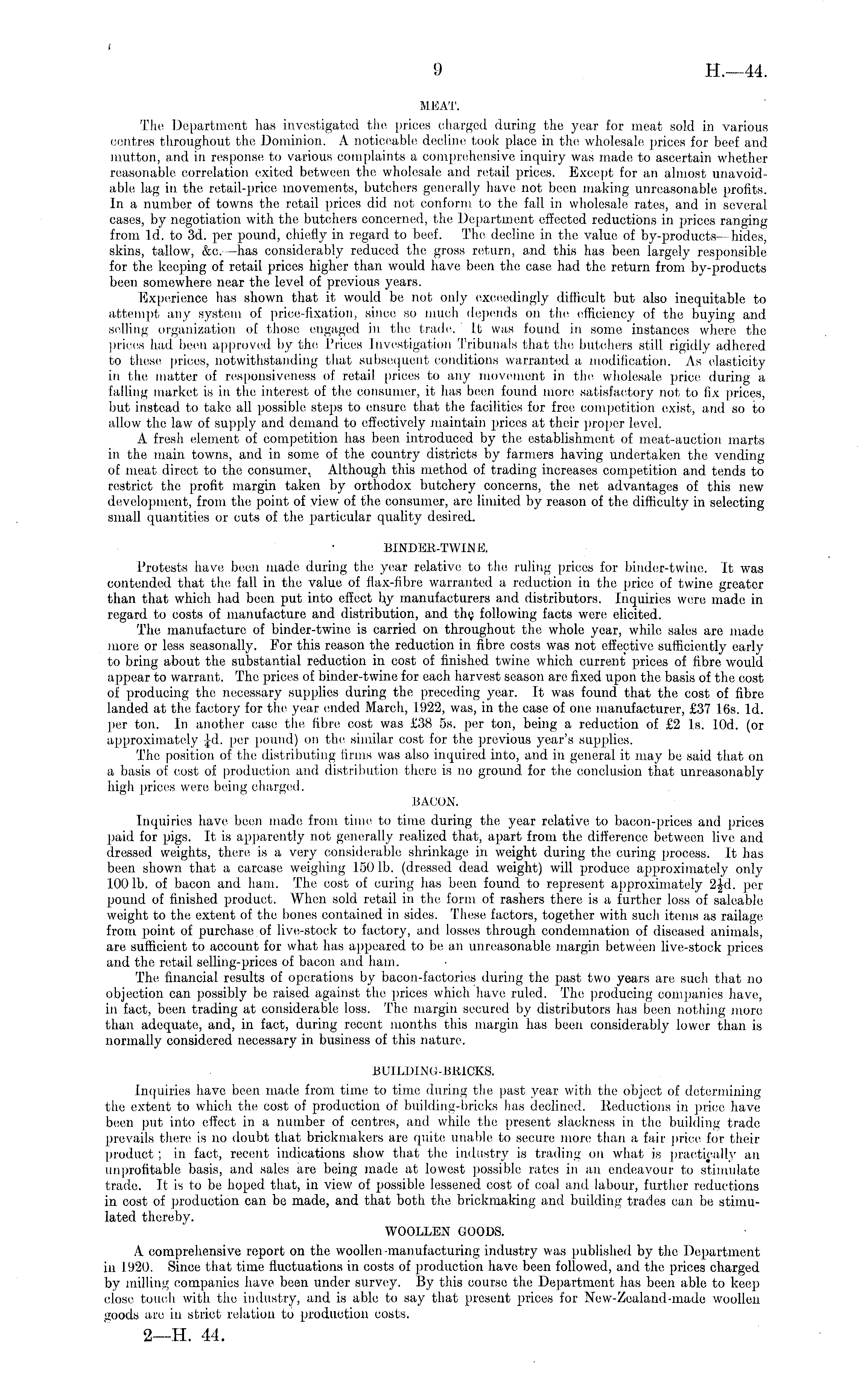MEAT. The Department has investigated the prices charged during the year for meat sold in various centres throughout the Dominion. A noticeable decline took place in the wholesale prices for beef and mutton, and in response to various complaints a comprehensive inquiry was made to ascertain whether reasonable correlation exited between the wholesale and retail prices. Except for an almost unavoidable lag in the retail-price movements, butchers generally have not been making unreasonable profits. In a number of towns the retail prices did not conform to the fall in wholesale rates, and in several cases, by negotiation with the butchers concerned, the Department effected reductions in prices ranging from Id. to 3d. per pound, chiefly in regard to beef. The decline in the value of by-products-- hides, skins, tallow, &c. —has considerably reduced the gross return, and this has been largely responsible for the keeping of retail prices higher than would have been the case had the return from by-products been somewhere near the level of previous years. Experience has shown that it would be not only exceedingly difficult but also inequitable to attempt any system of price-fixation, since so much depends on the efficiency of the buying and soiling organization of those engaged in the trade. It was found in some instances where the prices had been approved by the Prices Investigation Tribunals that this butchers still rigidly adhered to these prices, notwithstanding that subsequent conditions warranted a modification. As elasticity in the matter of responsiveness of retail prices to any movement in the wholesale price during a falling market is in the interest of the consumer, it lias been found more satisfactory not to fix prices, but instead to take all possible steps to ensure that the facilities for free competition exist, and so to allow the law of supply and demand to effectively maintain prices at their proper level. A fresh element of competition has been introduced by the establishment of meat-auction marts in the main towns, and in some of the country districts by farmers having undertaken the vending of meat direct to the consumer. Although this method of trading increases competition and tends to restrict the profit margin taken by orthodox butchery concerns, the net advantages of this new development, from the point of view of the consumer, are limited by reason of the difficulty in selecting small quantities or cuts of the particular quality desired. BINDER-TWIN E. Protests have been made during the year relative to the ruling prices for binder-twine. It was contended that the fall in the value of flax-fibre warranted a reduction in the price of twine greater than that which had been put into effect by manufacturers and distributors, inquiries were made in regard to costs of manufacture and distribution, and the, following facts were elicited. The manufacture of binder-twine is carried on throughout the whole year, while sales are made more or less seasonally. For this reason the reduction in fibre costs was not effective sufficiently early to bring about the substantial reduction in cost of finished twine which current prices of fibre would appear to warrant. The prices of binder-twine for each harvest season are fixed upon the basis of the cost of producing the necessary supplies during the preceding year, it was found that the cost of fibre landed at the factory for the year ended March, 1922, was, in the case of one manufacturer, £37 16s. Id. per ton. In another case the fibre cost was £38 ss. per ton, being a reduction of £2 Is. 10d. (or approximately |d. per pound) on the similar cost for the previous year's supplies. The position of the distributing firms was also inquired into, and in general it may be said that on a basis of cost of production and distribution there is no ground for the conclusion that unreasonably high prices were being charged. I3ACON. Inquiries have been made from time to time during the year relative to bacon-prices and prices paid for pigs. It is apparently not generally realized that, apart from the difference between live and dressed weights, there is a very considerable shrinkage in weight during the curing process. It has been shown that a carcase weighing 1501b. (dressed dead weight) will produce approximately only 1001b. of bacon and ham. The cost of curing has been found to represent approximately 2-Jd. per pound of finished product. When sold retail in the form of rashers there is a further loss of saleable weight to the extent of the bones contained in sides. These factors, together with such items as railage from point of purchase of live-stock to factory, and losses through condemnation of diseased animals, are sufficient to account for what has appeared to be an unreasonable margin between live-stock prices and the retail selling-prices of bacon and ham. The financial results of operations by bacon-factories during the past two years are such that no objection can possibly be raised against the prices which have ruled. The producing companies have, in fact, been trading at considerable loss. The margin secured by distributors has been nothing more than adequate, and, in fact, during recent months this margin has been considerably lower than is normally considered necessary in business of this nature. BUILDJNG-BIUCKS. Inquiries have been made from time to time during the past year with the object of determining the extent to which the cost of production of building-bricks has declined. Reductions in price, have been put into effect in a number of centres, and while the present slackness in the building trade' prevails there is no doubt that brickmakers are quite unable to secure more than a fair price for their product ; in fact, recent indications show that the industry is trading on what is practically an unprofitable basis, and sales are being made at lowest possible rates in an endeavour to stimulate trade. It is to be hoped that, in