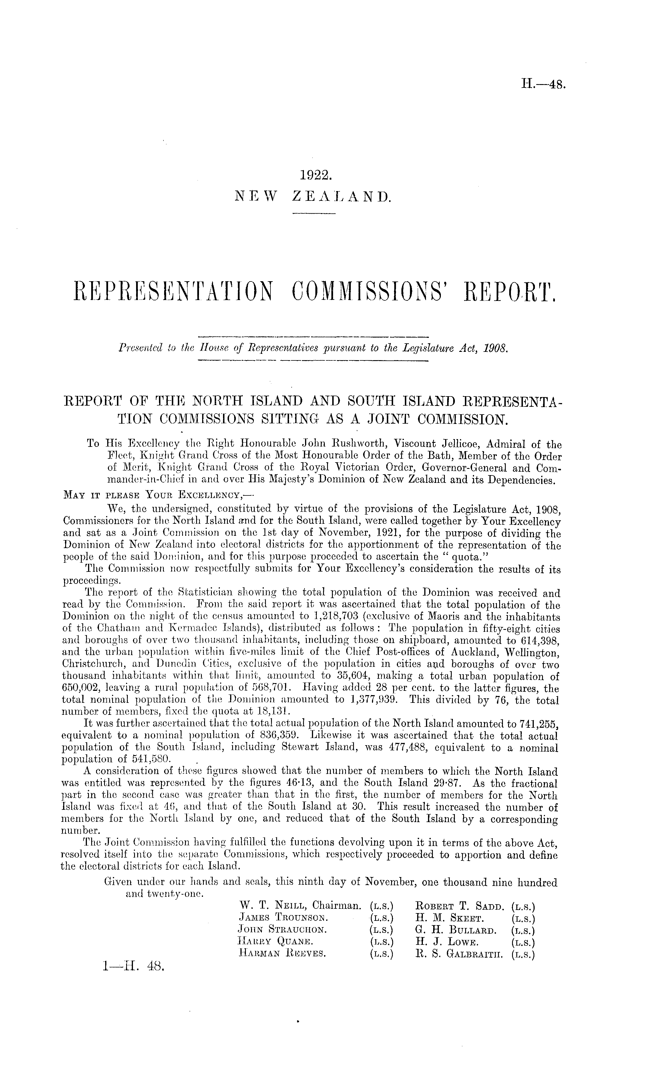 REPORT OF THE NORTH ISLAND AND SOUTH ISLAND REPRESENTATION COMMISSIONS SITTING AS A JOINT COMMISSION. To His Excellency the Right Honourahle John Rushworth, Viscount Jellicoe, Admiral of the Fleet, Knight Grand Cross of the Most Honourable Order of the Bath, Member of the Order of Merit, Knight Grand Cross of the Royal Victorian Order, Governor-General and Com-mander-in-Chief in and over His Majesty's Dominion of Now Zealand and its Dependencies. May it please Yode Excellency,— We, the undersigned, constituted by virtue of the provisions of the Legislature Act, 1908, Commissioners for the North Island and for the South Island, were called together by Your Excellency and sat as a Joint Commission on the Ist day of November, 1921, for the purpose of dividing the Dominion of New Zealand, into electoral districts for the apportionment of the representation of the people of the said Dominion, and for this purpose proceeded to ascertain the " quota." The Commission now respectfully submits for Your Excellency's consideration the results of its proceedings. The report of the Statistician showing the total population of the Dominion was received and read by the Commission. From the said report it was ascertained that the total population of the Dominion on the night of the census amounted to 1,218,703 (exclusive of Maoris and the inhabitants of the Chatham and Kermadcc Islands), distributed as follows : The population in fifty-eight cities and boroughs of over two thousand inhabitants, including those on shipboard, amounted to 614,398, and the urban population within five-miles limit of the Chief Post-offices of Auckland, Wellington, Christchurcb, and Dunedin Cities, exclusive of the population in cities and boroughs of over two thousand inhabitants within that limit, amounted to 35,604, making a total urban population of 650,002, leaving a rural population of 568,701. Having added 28 per cent, to the latter figures, the total nominal population of the Dominion amounted to 1,377,939. This divided by 76, the total number of members, fixed the quota at 18,131. It was further ascertained that the total actual population of the North Island amounted to 741,255, equivalent to a nominal population of 836,359. Likewise it was ascertained that the total actual population of the South Island, including Stewart Island, was 477,488, equivalent to a nominal population of 541,580. A consideration of these figures showed that the number of members to which the North Island was entitled was represented by the figures 46-13, and the South Island 29-87. As the fractional part in the second case was greater than that in the first, the number of members for the North Island was fixed at 46, and that of the South Island at 30. This result increased the number of members for the North Island by one, and reduced that of the South Island by a corresponding number. The Joint Commission having fulfilled the functions devolving upon it in terms of the above Act, resolved itself into the separate Commissions, which respectively proceeded to apportion and define the electoral districts for each Island. Given under our hands and seals, this ninth day of November, one thousand nine hundred and twenty-one. W. T. Neill, Chairman, (1.5.) Robert T. Sadd. (1.5.) James Tbounson. (1.5.) H. M. Skeet. (1.5.) John Steauchon. (1.5.) G. H. Bullabd. (1.5.) Harry Quane. (1.5.) H. J. Lowe. (1.5.) Haeman Reeves. (1.5.) R. S. Galbeaitii. (1.5.)