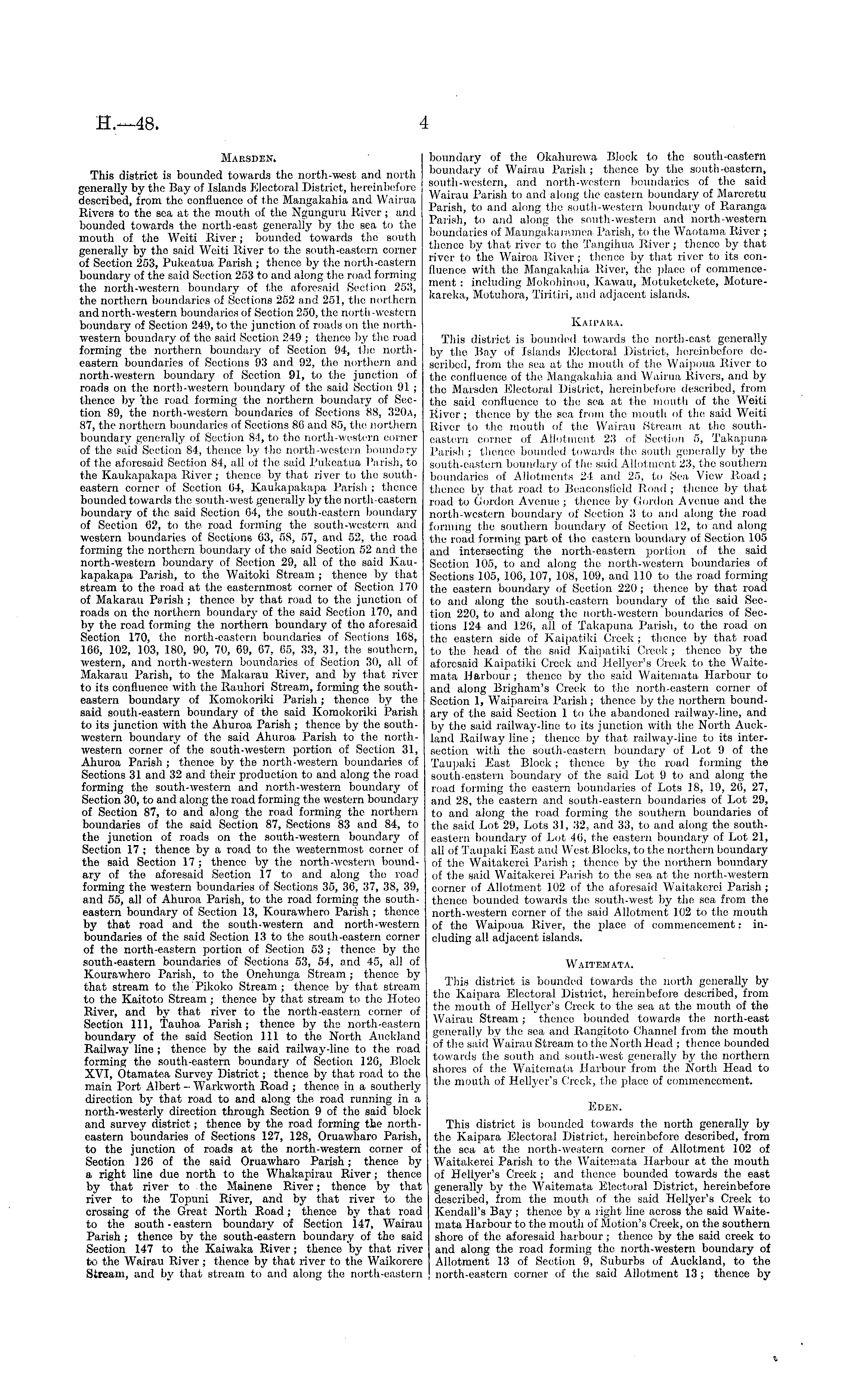 boundary of the Okahurcwa Block to the south-eastern boundary of Wairau Parish ; thence by the south-eastern, south-western, and north-western boundaries of the said Wairau Parish to and along the eastern boundary of Marcretu Parish, to and along the south-western boundary of Raranga Parish, to and along the south-western and north-western boundaries of Maungakaramea Parish, to the Waotama River ; thence by that river to tho Tangihua River ; thence by that river to the Wairoa River; thence by that river to its confluence with the Mangakahia River, the place of commencement : including Mokohinou, Kawau, Motukctckete, Moturekareka, Motuhora, Tiritiri, and adjacent islands. Kaipara. This district is bounded towards the north-east generally by the Bay of Islands Eleotoral District, hereinbefore described, from the sea at the mouth of the Waipoua River to tho confluence of the Mangakahia and Wairua Rivers, and by the Marsden Electoral District, hereinbefore described, from the said confluence to the sea at the mouth of the Weiti River; thence by the sea from the mouth of the said Weiti River to the mouth of the Wairau Stream at the southeastern corner of Allotment 23 of Section 5, Takapuna Parish; thence bounded towards the south generally by the south-eastern boundary of the said Allotment 23, the southern boundaries of Allotments 24 and 25, to Sea View Road ; thence by that road to Beaoonsfield Road ; thence by that road to Gordon Avenue ; thence by Gordon Avenue and tho north-western boundary of Section 3 to and along the road forming the southern boundary of Section 12, to and along the road forming part ol: (hi- eastern boundary of Section 105 and intersecting the north-eastern portion of the said Section 105, to and along the north-western boundaries of Sections 105, 106, 107, 108, 109, and 110 to the road forming the eastern boundary of Section 220 ; thence by that road to and along the south-eastern boundary of the said Section 220, to and along the north-western boundaries of Sections 124 and 120, all of Takapuna Parish, to the road on the eastern side of Kaipatiki Creek; thence by that road to the head of the said Kaipatiki Creek ; thonco by the aforesaid Kaipatiki Creek and Hellyer's Creek to the Waitemata Harbour; thence by tho said Waitemata Harbour to and along Brigham's Creek to the north-eastern corner of Section 1, Waipareira Parish ; thence by the northern boundary of the said Section 1 to the abandoned railway-line, and by the said railway-line to its junction with the North Auckland Railway line ; thence by that railway-line to its intersection with the south-eastern boundary of Lot 9 of the Taupaki East Block; thence by the road forming the south-eastern boundary of the said Lot 9 to and along the road forming the eastern boundaries of Lots 18, 19, 20, 27, and 28, the eastern and south-eastern boundaries of Lot 29, to and along the road forming the southern boundaries of the said Lot 29, Lots 31, 32, and 33, to and along the southeastern boundary of Lot 46, the eastern boundary of Lot 21, all of Taupaki East and West Blocks, to the northern boundary of the Waitakerei Parish ; thence by the northern boundary of the said Waitakerei Parish to the sea at the north-western corner of Allotment 102 of the aforesaid Waitakerei Parish ; thence bounded towards the south-west by the sea from the north-western corner of the said Allotment 102 to the mouth of the Waipoua River, the place of commencement.- including all adjacent islands. Waitemata. This district is bounded towards the north generally by the Kaipara Electoral District, hereinbefore described, from the mouth of Hellyer's Creek to the sea at the mouth of the Wairau Stream; thence bounded towards the north-east generally by the sea and Rangitoto Channel from the mouth of the said Wairau Stream to the North Head ; thence bounded towards the south and south-west generally by the northern shores of the Waitemata Harbour from the North Head to the mouth of Hellyer's Creek, the place of commencement. Eden. This district is bounded towards the north generally by the Kaipara Electoral District, hereinbefore described, from the sea at the north-western corner of Allotment 102 of Waitakerei Parish to the Waitemata Harbour at the mouth of Hellyer's Creek ; and thence bounded towards the east • generally by the Waitemata Electoral District, hereinbefore i described, from the mouth of the said Hellyer's Creek to Kendall's Bay ; thence by a right line across the said Waitei mata Harbour to the mouth of Motion's Creek, on the southern I shore of the aforesaid harbour ; thence by the said creek to ' and along the road forming the north-western boundary of i Allotment 13 of Section 9, Suburbs of Auckland, to the i north-eastern corner of the said Allotment 13 ; thence by