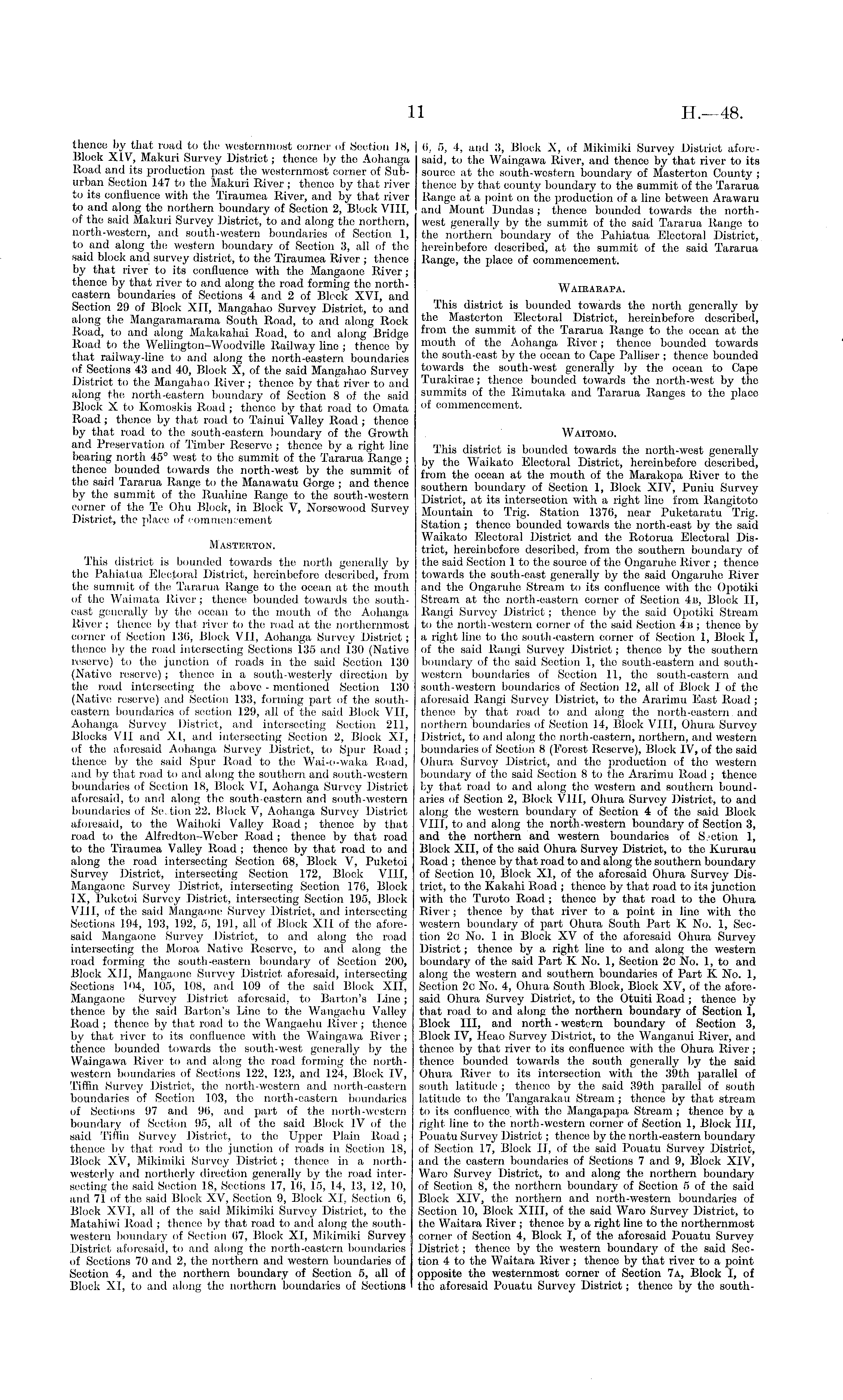 0, 5, 4, and 3, Block X, of Mikimiki Survey District aforesaid, to the Waingawa River, and thence by that river to its source at the south-western boundary of Masterton County ; thence by that county boundary to the summit of the Tararua Range at a point on the production of a lino between Arawaru and Mount Dundas ; thence bounded towards the northwest generally by the summit of the said Tararua Range to the northern boundary of the Pahiatua Electoral District, hereinbefore described, at tho summit of the said Tararua Range, the place of commencement. Wairarapa. This district is bounded towards the north generally by the Masterton Electoral District, hereinbefore described, from the summit of the Tararua Range to the ocean at the mouth of the Aohanga River; thence bounded towards tho south-east by the ocean to Cape Palliser ; thence bounded towards the south-west generally by the ocean to Cape Turakirae; thence bounded towards the north-west by tho summits of the Rimutaka and Tararua Ranges to the place of commencement. Waitomo. This district is bounded towards the north-west generally by the Waikato Electoral District, hereinbefore described, from the ocean at the mouth of the Marakopa River to the southern boundary of Section 1, Block XIV, Puniu Survey District, at its intersection with a right lino from Rangitoto Mountain to Trig. Station 1370, near Puketaratu Trig. Station ; thence bounded towards the north-east by the said Waikato Electoral District and the Rotorua Electoral District, hereinbefore described, from the southern boundary of the said Section 1 to the source of tho Ongaruhe River ; thence towards the south-east generally by the said Ongaruhe River and the Ongaruhe Stream to its confluence with the Opotiki Stream at the north-eastern corner of Section 4b, Block II, Rangi Survoy District; thence by the said Opotiki Stream to the north-western corner of the said Section 4b ; thenco by a right line to the south-eastern corner of Section 1, Block I, of the said Rangi Survey District; thence by tho southern boundary of the said Section 1, tho south-eastern and southwestern boundaries of Section 11, the south-eastern and south-western boundaries of Section 12, all of Block I of the aforesaid Rangi Survey District, to the Ararimu East Road ; thence by that road to and along the north-eastern. and northern, boundaries of Section 14, Block VIII, Ohura Survoy District, to and along the north-eastern, northern, and western boundaries of Section 8 (Forest Reserve), Block IV, of the said Ohura Survey District, and the production of the western boundary of the said Section 8 to the Ararimu Road ; thence by that road to and along tho western and southern boundaries of Section 2, Block VIII, Ohura Survey District, to and along the western boundary of Section 4 of the said Block VIII, to and along the north-western boundary of Section 3, and the northern and western boundaries of S.-ction 1, Block XII, of the said Ohura Survey District, to tho Kururau Road ; thence by that road to and along the southern boundary of Section 10, Block XI, of the aforesaid Ohura Survoy District, to the Kakahi Road ; thence by that road to its junction with tho Turoto Road ; thenco by that road to the Ohura River; thence by that river to a point in line with the western boundary of part Ohura South Part K No. 1, Section 2o No. 1 in Block XV of tho aforesaid Ohura Survey District; thence by a right line to and along the western boundary of the said Part K No. 1, Section 2o No. 1, to and along the western and southern boundaries of Part K No. 1, Section 20 No. 4, Ohura South Block, Block XV, of the aforesaid Ohura Survey District, to the Otuiti Road ; thence by that road to and along tho northern boundary of Section I, Block III, and north - western boundary of Section 3, Block IV, Heao Survey District, to tho Wanganui River, and thonco by that river to its confluence with the Ohura River ; thence bounded towards the south generally by the said Ohura River to its intersection with the 39th parallel of south latitude ; thenco by the said 89th parallel of south latitude to the Tangarakau Stream ; thence by that stream to its confluence with tho Mangapapa Stream ; thence by a right line to the north-western corner of Section 1, Block III, Pouatu Survey District; thence by the north-eastern boundary of Section 17, Block II, of the said Pouatu Survey District, and the eastern boundaries of Sections 7 and 9, Block XIV, Waro Survey District, to and along the northern boundary of Section 8, the northern boundary of Section 5 of the said Block XIV, the northern and north-western boundaries of Section 10, Block XIII, of the said Waro Survey District, to the Waitara River ; thence by a right line to the northernmost corner of Section 4, Block I, of the aforesaid Pouatu Survey District; thence by tho western boundary of the said Section 4 to the Waitara River ; thence by that river to a point opposite the westernmost corner of Section 7a, Block I, of the aforesaid Pouatu Survey District; thence by the south-