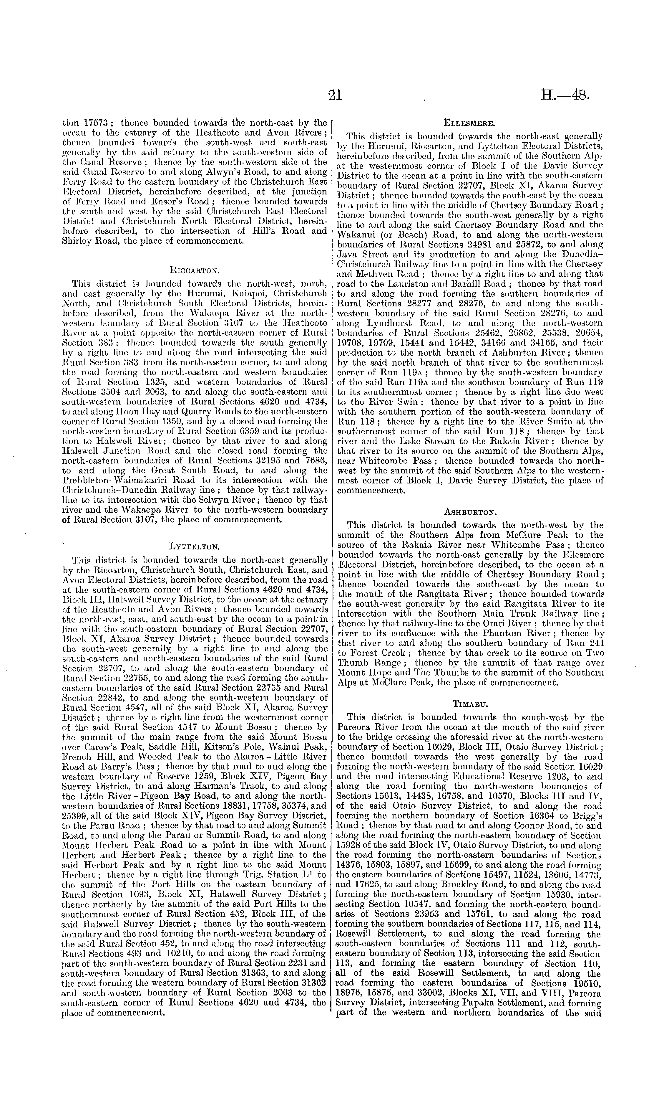 Ellesmere. This district is bounded towards the north-cast generally by tho Hurunui, Riccarton, and Lyttelton Electoral Districts, hereinbefore described, from tho summit of the Southern Alp? at the westernmost corner of Block I of the Davie Survey District to the ocean at a point in lino with the south-eastern boundary of Rural Section 22707, Block XI, Akaroa Survey District; thenco bounded towards the south-east by the ocean to a point in line with the middle of Chcrtscy Boundary Road ; thence bounded towards tho south-west generally by a right line to and along the said Chcrtscy Boundary Road and the Wakanui (or Beach) Road, to and along the north-westorn boundaries of Rural Sections 24981 and 25872, to and along Java Street and its production to and along the DuncdinChristchuroh Railway line to a point in line with tho Chertsey and Methven Road ; thence by a right line to and along that road to the Lauriston and Barhill Road ; thence by that road to and along tho road forming tho southern boundaries of Rural Sections 28277 and 28276, to and along the southwestern boundary of the said Rural Section 28270, to and along Lyndhurst Road, to and along the north-western bo lindanes of Rural Sections 25402, 26862, 25538, 20051, 19708, 19709, 15441 and 15442, 34166 and 34165, and their production to the north branch of Ashburton River; thence by the said north branch of that river to the southernmost corner of Run 119A; thenco by the south-western boundary of tho said Run I19a and the southern boundary of Run 119 to its southernmost corner ; thence by a right line due west to tho River Swin ; thenco by that river to a point in line with the southern portion of the south-westorn boundary of Run 118; thence by a right line to the River Smite at tho southernmost corner of tho said Run 118 ; thence by that river and the Lake Stream to the Rakaia Rivor ; thence by that river to its source on the summit of the Southern Alps, near Whitcombc Pass ; thence bounded towards the northwest by the summit of tho said Southern Alps to the westernmost corner of Block I, Davie Survey District, the place of commencement. Ashburton. This district is bounded towards the north-west by the summit of tho Southern Alps from McClure Poak to the source of tho Rakaia Rivor near Whitcombe Pass ; thence bounded towards the north-cast generally by the Ellesmore Electoral District, hereinbefore described, to the ocean at a point in lino with the middle of Chortsoy Boundary Road ; thenco bounded towards the south-oast by the ocean to the mouth of tho Rangitata River ; thonco bounded towards tho south-wost generally by the said Rangitata River to its intersection, with the Southern Main Trunk Railway line ; thence by that railway-line to tho Orari River ; thence by that river to its confluence with the Phantom River ; thenco by that river to and along the southern boundary of Run 241 to Forest Creek ; thence by that creek to its source on Two Thumb Range ; thenco by the summit of that range over Mount Hope and Tho Thumbs to the summit of the Southern Alps at Module Peak, the place of commencement. Timaru. This district is bounded towards the south-wost by tho Paroora River from the ocean at the mouth of the said river to the bridge crossing tho aforesaid river at the north-western boundary of Section 16029, Block III, Otaio Survey District; thence bounded towards the west generally by the road forming the north-westorn boundary of the said Section 16029 and the road intersecting Educational Reserve 1203, to and along the road forming the north-western boundaries of Sections 15013, 14438, 10758, and 10570, Blocks III and IV, of the said Otaio Survey District, to and along the road forming the northern boundary of Section 10304 to Brigg's Road ; thence by that road to and along Coonor Road, to and along tho road forming the north-eastern boundary of Section 15928 of the said Block IV, Otaio Survey District, to and along the road forming tho north-eastern boundaries of Sections 14370, 15803, 15897, and 15099, to and along the road forming tho eastern boundaries of Sections 15497, 11524, 13000, 14773, and 17625, to and along Brockley Road, to and along tho road forming the north-eastern boundary of Section 15930, intersecting Section 10547, and forming the north-eastern boundaries of Sections 23953 and 15701, to and along the road forming the southern boundaries of Sections 117, 115, and 114, Rosewill Settlement, to and along the road forming the south-eastern boundaries of Sections 111 and 112, southeastern boundary of Section 113, intersecting the said Section 113, and forming the eastern boundary of Section 110, all of the said Rosewill Settlement, to and along the road forming tho eastern boundaries of Sections 19510, 18976, 15876, and 33002, Blocks XI, VII, and VIII, Pareora Survoy District, intersecting Papaka Settlement, and forming part of the western and northern boundaries of the said