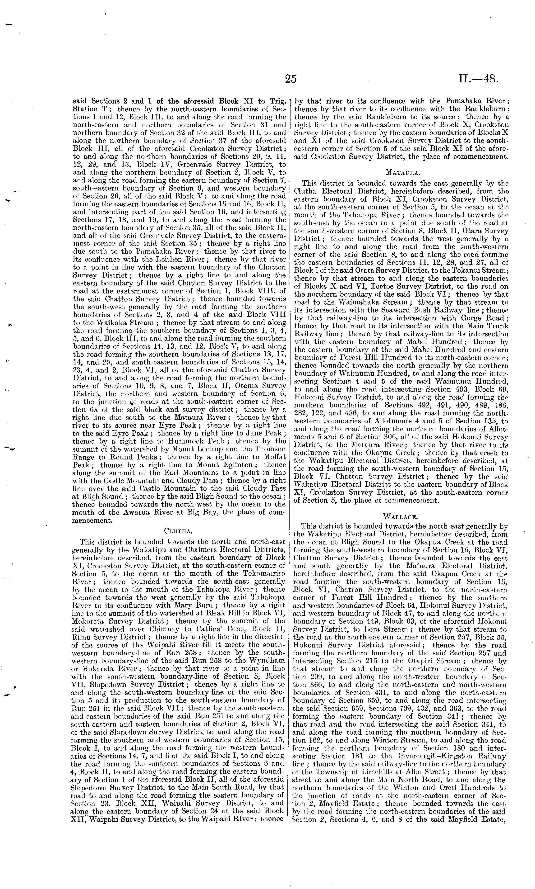 said Sections 2 and 1 of the aforesaid Block XI to Trig. Station T : thence by the north-eastern boundaries of Sections 1 and 12, Block III, to and along the road forming the north-eastern and northern boundaries of Section 31 and northern boundary of Section 32 of tho said Block III, to and along the northern boundary of Section 37 of the aforesaid Block III, all of the aforesaid Crookston Survey District; to and. along the northern boundaries of Sections 20, 9, 11, 12, 29, and 13, Block IV, Greenvale Survey District, to and along the northern boundary of Section 2, Block V, to and along the road forming the eastern boundary of Section 7, south-eastern boundary of Section 6, and western boundary of Section 20, all of tho said Block V; to and along the road forming the eastern boundaries of Sections 15 and 10, Block II, and intersecting part of the said Section 16, and intersecting Sections 17, 18, and 19, to and along the road forming the north-eastern boundary of Section 35, all of the said Block IT, and all of the said Greenvale Survey District, to the easternmost corner of the said Section 35 ; thence by a right line due south to the Pomahaka River ; thence by that river to its confluence with the Loithen River ; thence by that river to a point in line with the eastern boundary of the Chatton Survey District; thence by a right line to and along the eastern boundary of the said Chatton Survey District to the road at tho easternmost corner of Section 1, Block VIII, of the said Chatton Survey District; thence bounded towards the south-west generally by the road forming tho southern, boundaries of Sections 2, 3, and 4 of the said. Block VIII to the Waikaka Stream ; thence by that stream to and along the road forming the southern boundary of Sections 1, 3, 4, 5, and 6, Block III, to and along tho road forming the southern boundaries of Sections 14, 13, and 12, Block V, to and along the road forming the southern boundaries of Sections 18, 17, 14, and 25, and south-eastern boundaries of Sections 15, 14, 23, 4, and 2, Block VI, all of the aforesaid Chatton Survey District, to and along the road forming the northern boundaries of Sections 10, 9, 8, and 7, Block II, Otama Survoy District, the northern, and western boundary of Section 6, to the junction of roads at the south-eastern corner of Section 0a of the said block and survey district; thenco by a right line due south to the Mataura River; thence by that river to its source near Eyre Peak ; thence by a right line to the said Eyre Peak ; thonco by a right line to Jane Peak ; thence by a right lino to Hummock Peak ; thenco by the summit of the watershed by Mount Lookup and the Thomson Range to Round Peaks ; thence by a light line to Moffat Peak ; thence by a right line to Mount Eglinton ; thence along the summit of the Earl Mountains to a point in lino with the Castle Mountain and Cloudy Pass ; thenco by a right line over the said Castle Mountain to the said Cloudy Pass at Bligh Sound ; thence by the said Bligh Sound to the ocean ; thence bounded towards the north-west by the ocean to the mouth of the Awarua River at Big Bay, the place of commencement. Clutiia. This district is bounded towards the north and north-east generally by the Wakatipu and Chalmers Electoral Districts, hereinbefore described, from the eastern boundary of Block XI, Crookston Survey District, at the south-eastern corner of Section 5, to (he ocean at the mouth of the Tokomairiro River; thence bounded towards the south-east generally by the ocean to the mouth of the Tahakopa River ; thence bounded towards the west generally by the said Tahakopa River to its confluence with Mary Burn; thence by a, right line to the summit of the watershed at Bleak Hill in Block VI, Mokoreta Survey District; thence by the summit of the said watershed over Chimney to Catlins' Cone, Block li, Rimu Survey District; thence by a right line in the direction of the source of the Waipahi River till it meets the southwestern boundary-line of Run 258 : thence by the southwestern boundary-line of the said Run 258 to the Wyndham or Mokareta River; thence by that river to a point in line with the south-western boundary-line of Section 5, Block VII, Slopedown Survey District; thence by a right line to and along the south-western boundary-line of the said Section 5 and its production to the south-eastern boundary of Run 251 in the said Block VII ; thence by the south-eastern and eastern boundaries of the said Run 251 to and along the south-eastern and eastern boundaries of Section 2, Block VI, of the said Slopedown Survey District, to and along the road forming the southern and western boundaries of Section 15, Block I, to and along the road forming (he western boundaries of Sections 14, 7, and 6 of tho said Block I, to and along the road forming the southern boundaries of Sections G and 4, Block II, to and along the road forming the eastern boundary of Section 1 of the aforesaid Block II, all of the aforesaid Slopedown Survey District, to the Main South Road, by that road to and along the road forming the eastern boundary of Section 23, Block XII, Waipahi Survey District, to and along the eastern boundary of Section 24 of the said Block XII, Waipahi Survey District, to the Waipahi River; thence
