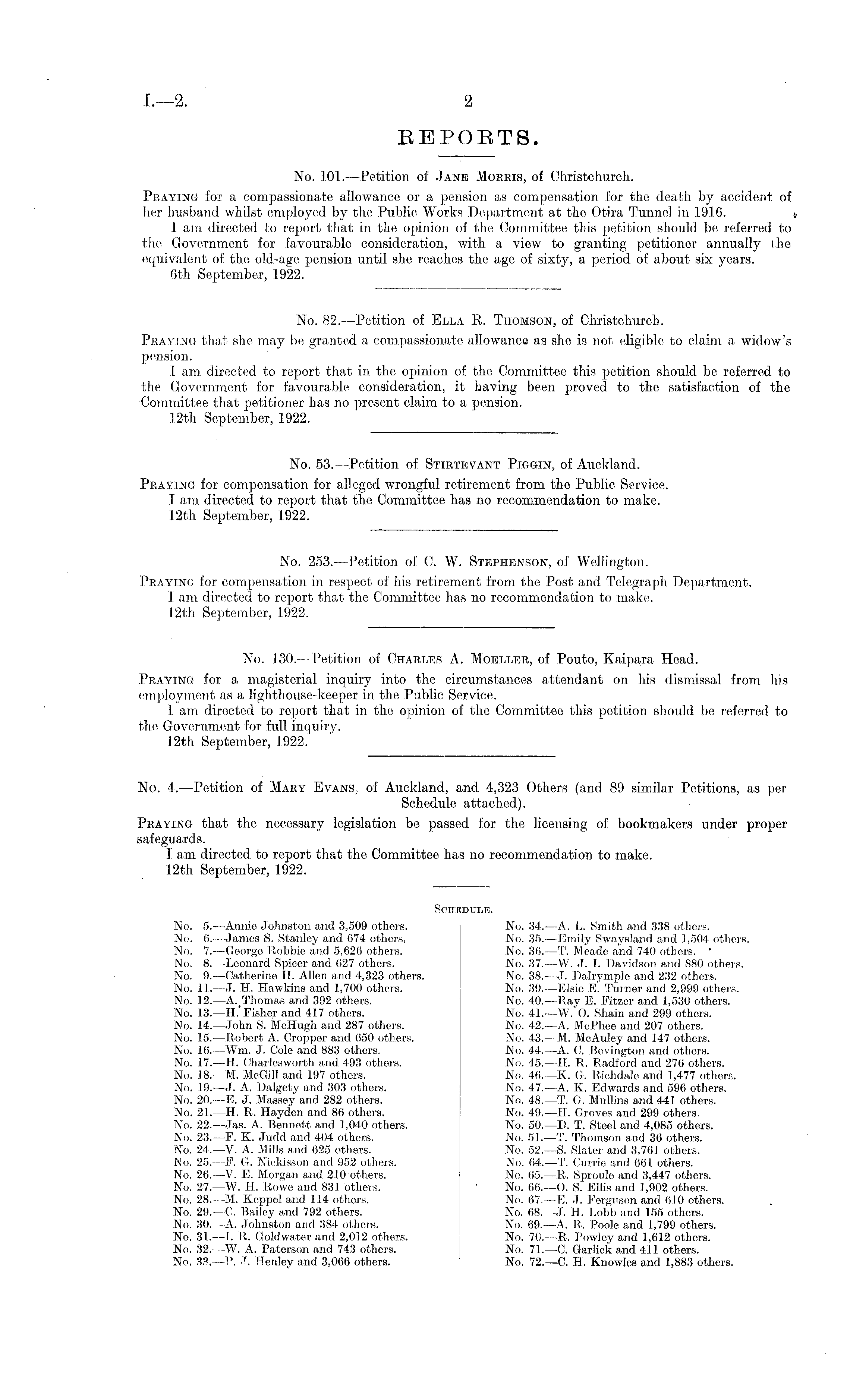 No. 82.—Petition of Ella E. Thomson, of Christchurch. Praying that she may be granted a compassionate allowance as she is not eligible to claim a widow's pension. I am directed to report that in the opinion of the Committee this petition should be referred to the Government for favourable consideration, it having been proved to the satisfaction of the Committee that petitioner has no present claim to a pension. 12th September, 1922.
