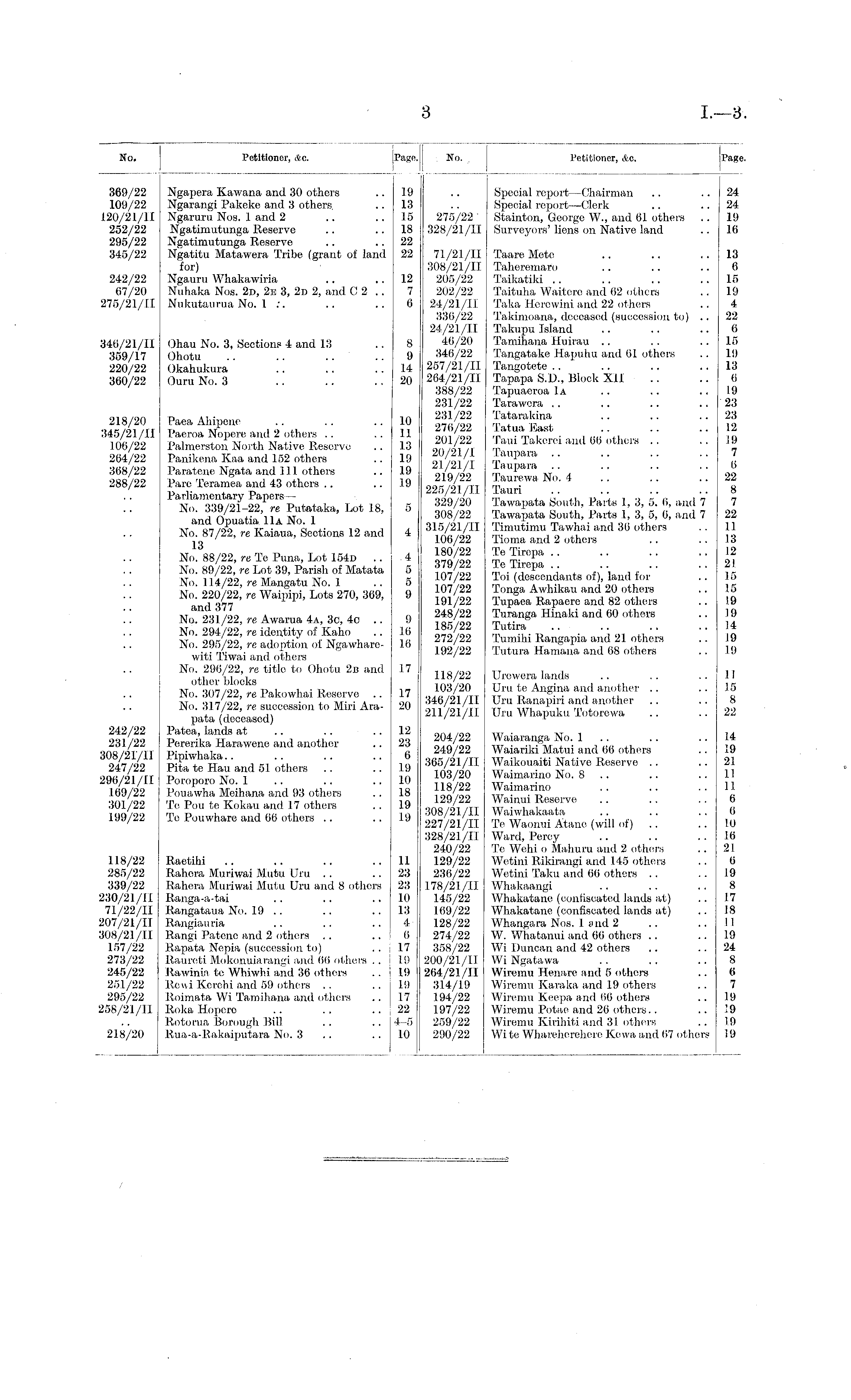 No. Petitioner, *c. Page. No. Petitioner, Ac. Page. I 369/22 109/22 120/21/11 252/22 295/22 345/22 Ngapera Kawana and 30 others Ngarangi Pakeke and 3 others. Ngaruru Nos. 1 and 2 Ngatimutunga Reserve Ngatimutunga Reserve Ngatitu Matawera Tribe (grant of land for) Ngauru Wliakawiria Nuhaka Nos. 2d, 2b 3, 2d 2, and C 2 Nukutaurua No. 1 :. 111 18 15 18 22 22 275/22 ■ 328/21/11 Special report—Chairman Special report—Clerk Stainton, George W., and 61 others Surveyors' liens on Native land 24 24 19 16 242/22 67/20 275/21/11 340/21/11 359/17 220/22 360/22 218/20 345/21/11 106/22 264/22 368/22 288/22 Ohau No. 3, Sections 4 and 13 Ohotu Okahukura Ouru No. 3 Paea Ahipene Paeroa Nopere and 2 others Palmerston North Native Reserve Panikena Kaa and 152 others Paratene Ngata and 111 others Pare Tcramea and 43 others Parliamentary Papers— No. 339/21-22, re Putataka, Lot 18, and Opuatia 11a No. 1 No. 87/22, re Kaiaua, Sections 12 and 13 No. 88/22, re Te Puna, Lot 154d .. No. 89/22, re Lot 39, Parish of Matata No. 114/22, re Mangatu No. 1 No. 220/22, re Waipipi, Lots 270, 369, and 377 No. 231/22, re Awarua 4a, 3c, 4c .. No. 294/22, re identity of Kaho No. 295/22, re adoption of Ngawharewiti Tiwai and others No. 296/22, re title to Ohotu 2b and other blocks No. 307/22, re Pakowhai Reserve .. No. 317/22, re succession to MM Arapata (deceased) Patea, lands at Pererika Harawene and another Pipivvhaka.. Pita te Hau and 51 others Poroporo No. 1 Pouawha Moihana and 93 others Te Pou te Kokau and 17 others Te Pouwharo and 06 others 12 7 6 8 9 II 20 10 11 13 111 I!) 19 71/21/11 308/21/11 205/22 202/22 24/21/11 330/22 24/21/11 40/20 340/22 257/21/11 204/21/11 388/22 231/22 231/22 270/22 201/22 20/21/1 21/21/1 219/22 225/21/11 329/20 308/22 315/21/11 100/22 180/22 379/22 107/22 107/22 191/22 248/22 185/22 272/22 192/22 Taare Mote Taheremaro Taikatiki Taituha Waitcro and 62 others Taka Hercwini and 22 others Takimoana, deceased (succession to) .. Takupu Island Tamihana Huirau Tangatake Hapuhu and 61 others Tangotete Tapapa S.I)., Block XI1 Tapuaeroa 1a Tarawera Tatarakina Tatua East Taui Takcrci and 66 others Taupara Taupara Taurewa No. 4 .. Tauri Tawapata South, Parts 1, 3, 5, 0, and 7 Tawapata South, Parts 1, 3, 5, 6, and 7 Timutimu Tawhai and 36 others Tioma and 2 others Te Tirepa .. Te Tirepa .. Toi (descendants of), land for Tonga Awhikau and 20 others Tupaea Bapaero and 82 others Turanga Hinaki and 60 others Tutira Tumihi Rangapia and 21 others Tutura Hamana and 68 others 13 6 15 19 4 22 6 15 19 13 0 19 23 23 12 19 7 0 22 8 7 22 11 13 12 21 15 15 19 19 14 19 19 5 4 4 5 5 9 9 10 16 17 118/22 103/20 340/21/11 211/21/11 Urewera lands Uru te Angina and another Urn Rauapiri and another Uru Whapuku Totorewa I I 15 8 22 17 20 242/22 231/22 308/21/11 247/22 296/21/11 169/22 301/22 199/22 12 23 6 19 10 is 19 19 204/22 249/22 365/21/11 103/20 118/22 129/22 308/21/11 227/21/11 328/21/11 240/22 129/22 230/22 178/21/11 145/22 109/22 128/22 274/22 358/22 200/21/11 264/21/H 314/19 194/22 197/22 259/22 290/22 Waiarauga No. 1 .. Waiariki Matui and 66 others Waikouaiti Native Reserve Waimarino No. 8 .. Waimarino Wainui Reserve Waiwhakaata Te Waonui Atanc (will of) Ward, Percy To Wehi o Mahuru and 2 others Wotini Rikirangi and 145 others Wetini Taku and 66 others Whakaangi Whakatane (confiscated lands at) Whakatane (confiscated lands at) Whangara Nos. 1 and 2 W. Whatanui and 66 others .. Wi Duncan and 42 others Wi Ngatawa Wiremu Henare and 5 others Wiremu Karaka and 19 others Wiremu Keepa and 66 others Wiremu Potae and 26 others.. Wiremu KiriMti and 31 others Wi te Whareherehere Kewa and 67 other? 14 19 21 11 11 6 0 10 10 21 0 19 8 17 18 11 19 24 8 0 7 19 19 19 19 118/22 285/22 339/22 230/21/11 71/22/11 207/21/11 308/21/[I 157/22 273/22 245/22 251/22 295/22 258/21/11 Raetihi Rahera Miiriwai Mutu Uru .. Bahera Miiriwai Mutu Uru and 8 others Ranga-a-tai Rangataua No. 19 .. Rangiauria Rangi Patene and 2 others .. R.apata Nepia (succession to) Rauroti Mokonuiarangi and 00 others . . Rawinia te Whiwhi and 30 others Rewi Kerchi and 59 others Roimata Wi Tamihana and others Roka Hopcro Rotorua Borough Bill Rua-a-Rakaiputara No. 3 11 23 23 10 13 4 0 17 1!) 19 19 17 22 4-5 10 218/20