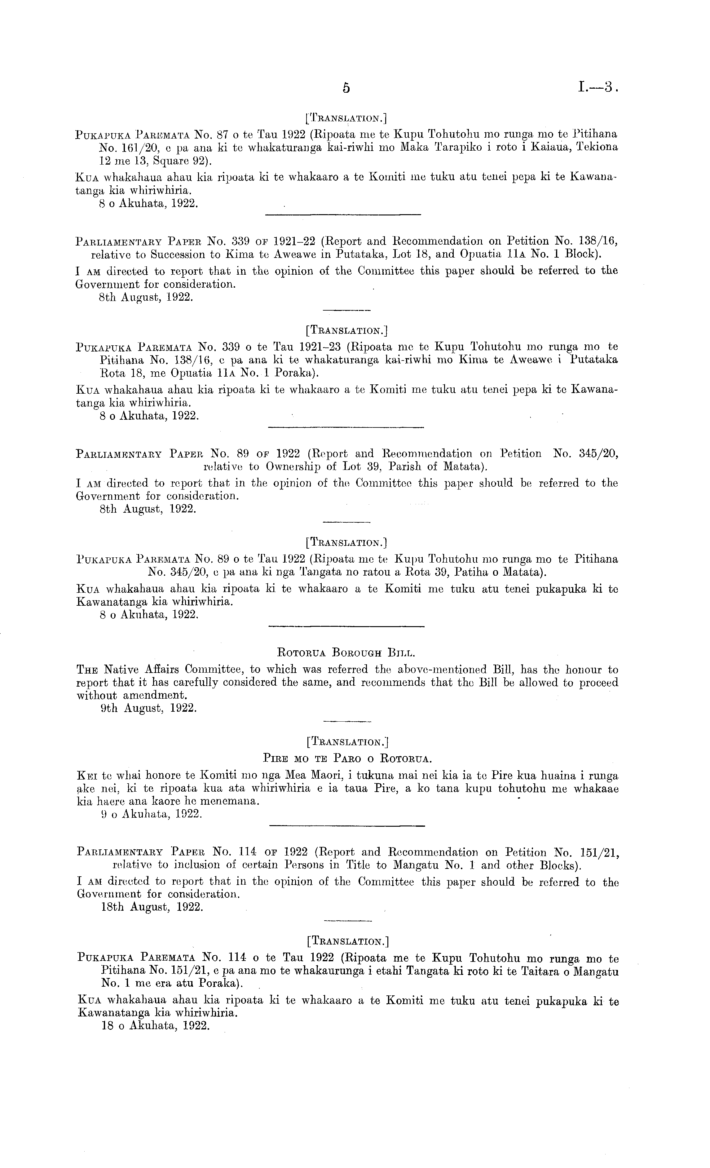 Parliamentary Paper No. 114 op 1922 (Report and Recommendation on Petition No. 151/21, relative to inclusion of certain Persons in Title to Mangatu No. 1 and other Blocks). I am directed to report that in the opinion of the Committee this paper should be referred to the Government for consideration. 18th August, 1922. [Translation.] Pukapuka Paremata No. 114 o te Tau 1922 (Ripoata me te Kupu Tohutohu mo runga mo te Pitihana No. 151/21, c pa ana mo te whakaurunga i etahi Tangata ki roto kite Taitara o Mangatu No. 1 me era atu Poraka). Kua whakahaua ahau kia ripoata kite whakaaro a te Komiti me tuku atu tenei pukapuka Id te Kawanatanga Ida whiriwhiria. 18 o Akuhata, 1922.