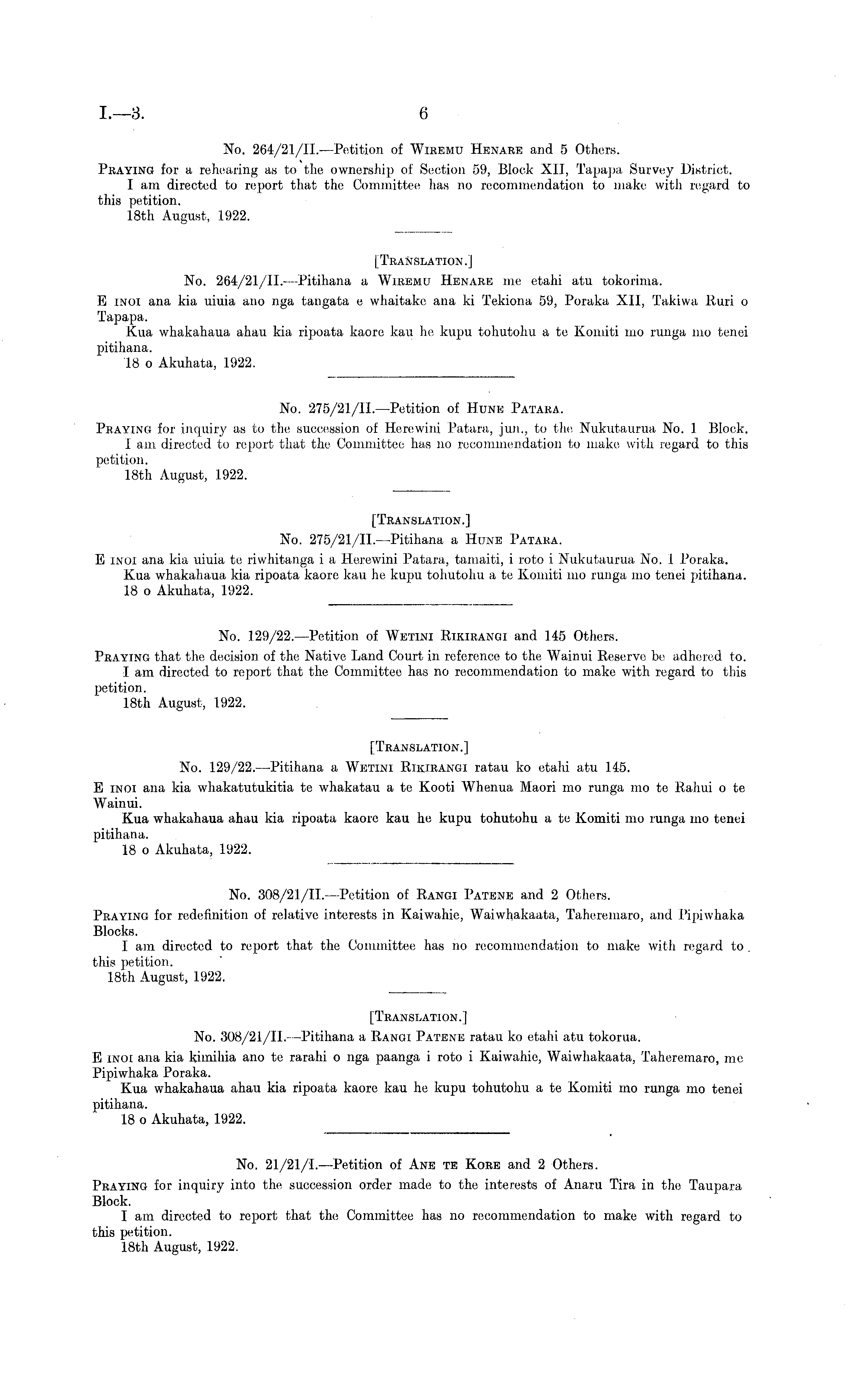 No. 275/21/IL—Petition of Hunk Patara. Praying for inquiry as to the succession of Herewini Patara, jun., to the Nukutaurua No. 1 Block. I am directed to report that the Committee has no recommendation to make with regard to this petition. 18th August, 1922. [Translation.] No. 275/21/IL- -Pitihana a Hune Patara. E inoi ana kia uiuia te riwhitanga i a Herewini Patara, tamaiti, i roto i Nukutaurua No. 1 Poraka. Kua whakahaua kia ripoata kaore kau he kupu tohutohu a te Komiti mo runga mo tenei pitihana. 18 o Akuhata, 1922.