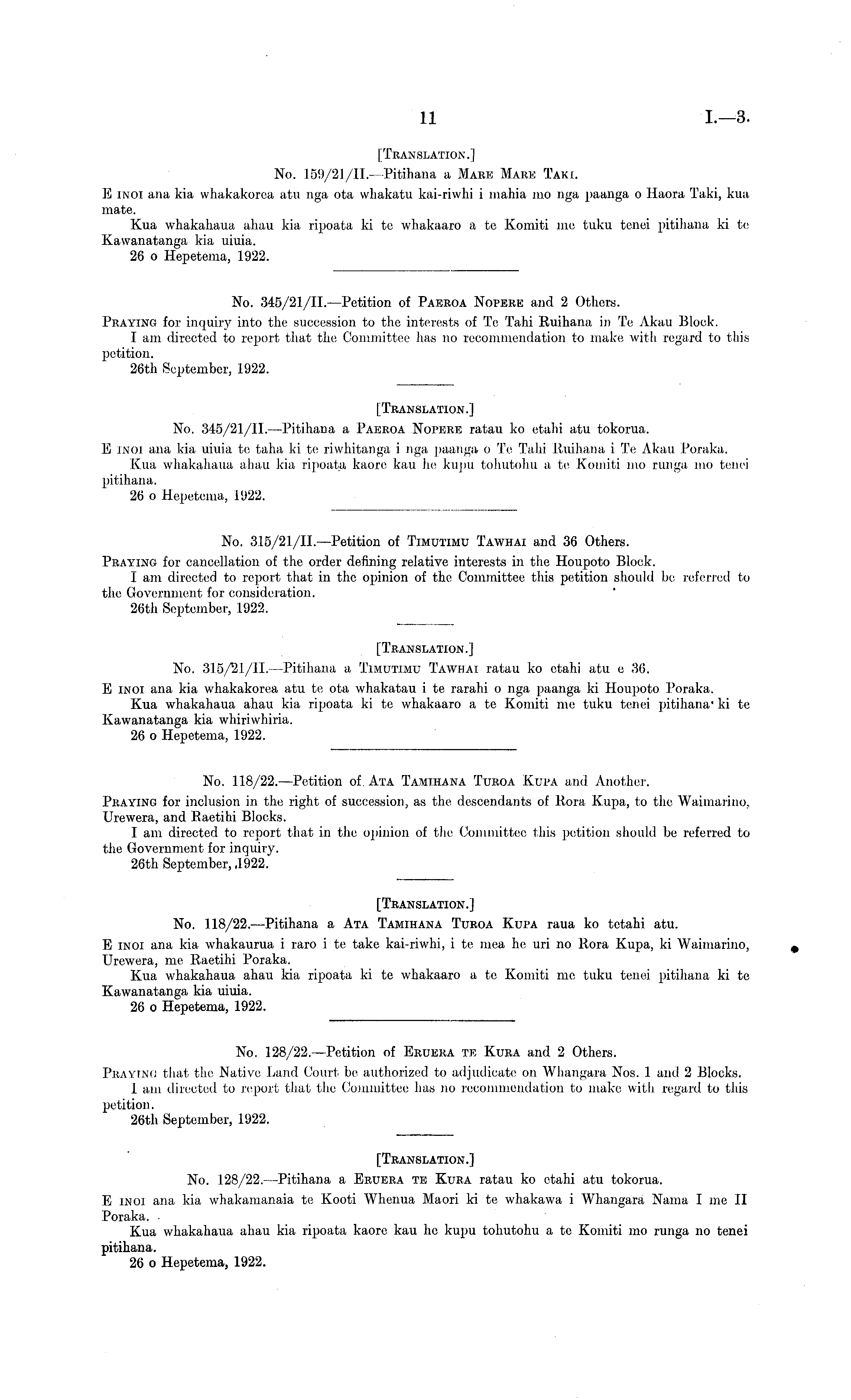 No. 315/21/IL—Petition of Timutimu Tawhai and 36 Others. Praying for cancellation of the order defining relative interests in the Houpoto Block. I am directed to report that in the opinion of the Committee this petition should be referred to the Government for consideration. 26th September, 1922. [Translation.] No. 315/21/11. —Pitihana a Timutimu Tawhai ratau ko etahi atu c 36. E inoi ana kia whakakorea atu te ota whakatau i te rarahi o nga paanga ki Houpoto Poraka. Kua whakahaua ahau kia ripoata kite whakaaro a te Komiti me tuku tenei pitihana' kite Kawanatanga kia whiriwhiria. 26 o Hepetema, 1922.