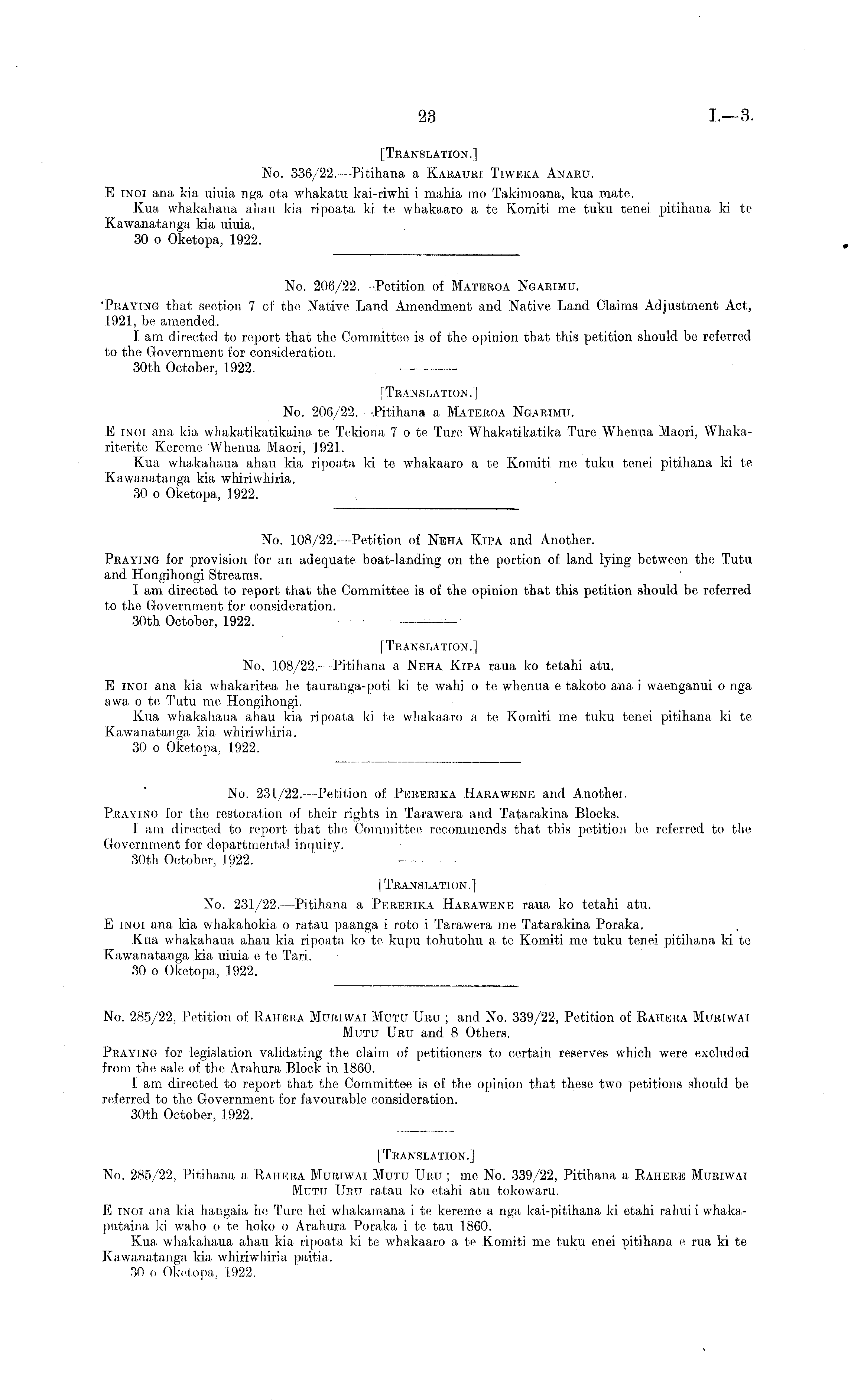 No. 206/22.—Petition of Materoa Ngartmu. "Praying that section 7 of the Native Land Amendment and Native Land Claims Adjustment Act, 1921, be amended. J am directed to report that the Committee is of the opinion that this petition should be referred to the Government for consideration. 30th October, 1922. [Translation.] No. 206/22- -Pitihana a Materoa Ngarimu. E inoi ana kia whakatikatikaina te Tekiona 7 o te Ture Whakatikatika Ture Whenua Maori, Whakariterite Kereme Whenua Maori, 1921. Kua whakahaua ahau. kia ripoata kite whakaaro a te Komiti me tuku tenei pitihana kite Kawanatanga kia whiriwhiria. 30 o Oketopa, 1922.