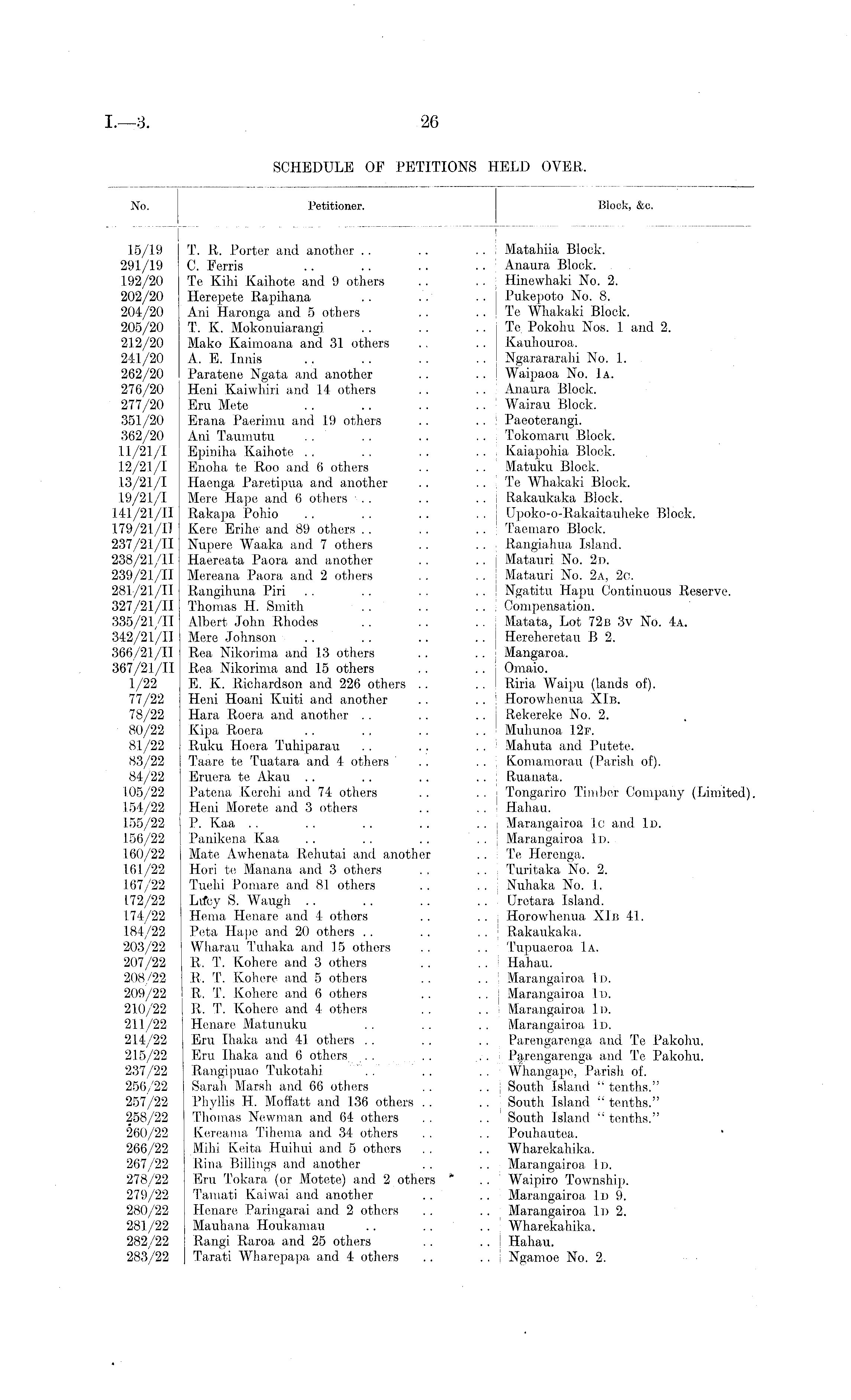 No. Petitioner. Block, &c. I 15/19 291/19 192/20 202/20 204/20 205/20 212/20 241/20 262/20 276/20 277/20 351/20 362/20 11/21/1 12/21/1 13/21/1 19/21/1 141/21/11 179/21/0 237/21/11 238/21/11 239/21/11 281/21/11 327/21/11 335/21/11 342/2 L/Il 366/21/II 367/21/11 1/22 77/22 78/22 80/22 81/22 83/22 84/22 105/22 154/22 155/22 156/22 160/22 161/22 167/22 1.72/22 174/22 184/22 203/22 207/22 208/22 209/22 210/22 211/22 214/22 215/22 237/22 256/22 257/22 258/22 260/22 266/22 267/22 278/22 279/22 280/22 281/22 282/22 283/22 T. R. Porter and another C. Ferris Te Kihi Kaihote and 9 others Herepete Rapihana Ani Haronga and 5 others T. I\. Mokouuiarangi. Mako Kaimoana and 31 others A. E. Innis Paratene Ngata and another Heni Kaiwhiri and 14 others Eru Mete Erana Paerimu and 19 others Ani Taumutu Epiniha Kaihote Enoha te Roo and 6 others Haenga Paretipua and another Mere Hape and 6 others Rakapa Pohio Kere Erihe and 89 others Nupere Waaka and 7 others Haereata Paora and another Mereana Paora and 2 others Rangihima Piri Thomas H. Smith Albert John Rhodes Mere Johnson Rea Nikorima and 13 others Rea Nikorima and 15 others E. K. Richardson and 226 others .. Heni Hoani Kuiti and another Hara Roera and another Kipa Roera Ruku Hoera Tuhiparau Taare te Tuatara and 4 others Eruera te Akau Patena Kerehi and 74 others Heni Moretc and 3 others P. Kaa Panikena Kaa Mate Awhenata Rehutai and another Hori te Manana and 3 others Tuehi I'omare and 81 others Lvfcy S. Waugh Hema Henare and 4 others Peta Hape and 20 others Wharau Tuhaka and 15 others R. T. Kohere and 3 others It. T. Kohere and 5 others R. T. Kohere and 6 others R. T. Kohere and 4 others Henare Matunuku Eru Ihaka and 41 others Eru Ihaka and 6 others . . Rangi puao Tukotahi ".. Sarah Marsh and 66 others Phyllis H. Mofi'att and 136 others . . Thomas Newman and 64 others Kereama Tihema and 34 others Mihi Keita Huihui and 5 others Rina Billings and another Eru Tokara (or Motete) and 2 others Tamati Kaiwai and another Henare Paringarai and 2 others Mauhana Houkamau Rangi Raroa and 25 others Tarati Wharepapa and 4 others i Matahiia Block. Anaura Block. . . . Hinewhaki No. 2. . . I Pukepoto No. 8. ,. I Te Whakaki Block. .. Te, Pokolm Nos. 1 and 2. Kauhouroa. Ngarararahi No. 1. Waipaoa No. Ia. Anaura Block. . . : Wairau Block. . . i Paeoterangi. , . . Tokomaru Block. . . , Kaiapohia Block. .. Matuku Block. . . ; Te Whakaki Block. . . i Rakaukaka Block. ., | Upoko-o-Rakaitauheke Block. . . ; Tactnaro Block. .. , Rangiab.ua Island. .. j Matauri No. 2d. . . | Matauri No. 2a, 2c. .. | Ngatitu Hapu Continuous Reserve. .. | Compensation. . . j Matata, Lot 72 n 3v No. 4a. Hereheretau B 2. .. I Mangaroa. . . j Omaio. . . | Riria Waipu (lands of). . . ! Horowhenua XIb. .. j Rekereke No. 2. . . ! Muhunoa 12f. , , ; Mahuta and. Putete. . . : , Komamorau (Parish of). . . j Ruanata. Tongariro Timber Company (Limited .. , Hahau. .. I Marangairoa lc and Id. . . ; Marangairoa Id. .. Te Herenga. . . j Turitaka No. 2. .. j Nuhaka No. I. Uretara Island. .. j Horowhenua XIb 41. .. [ Rakaukaka. Tupuaeroa Ia. .. ! Hahau. . . | Marangairoa Id. .. j Marangairoa Id. . . ! Marangairoa 1D. Marangairoa Id. .. j Parengarenga and Te Pakohu, .... j Parengarenga and Te Pakohu. . . : Whangape, Parish, of. . . j South Island " tenths." South Island " tenths." South Island " tenths." Poiihautea. Wharekahika. Marangairoa, 1 D. Waipiro Township. Marangairoa Id 9, Marangairoa Id 2. Wharekahika. . . | Hahau. .. | Ngamoe No. 2.