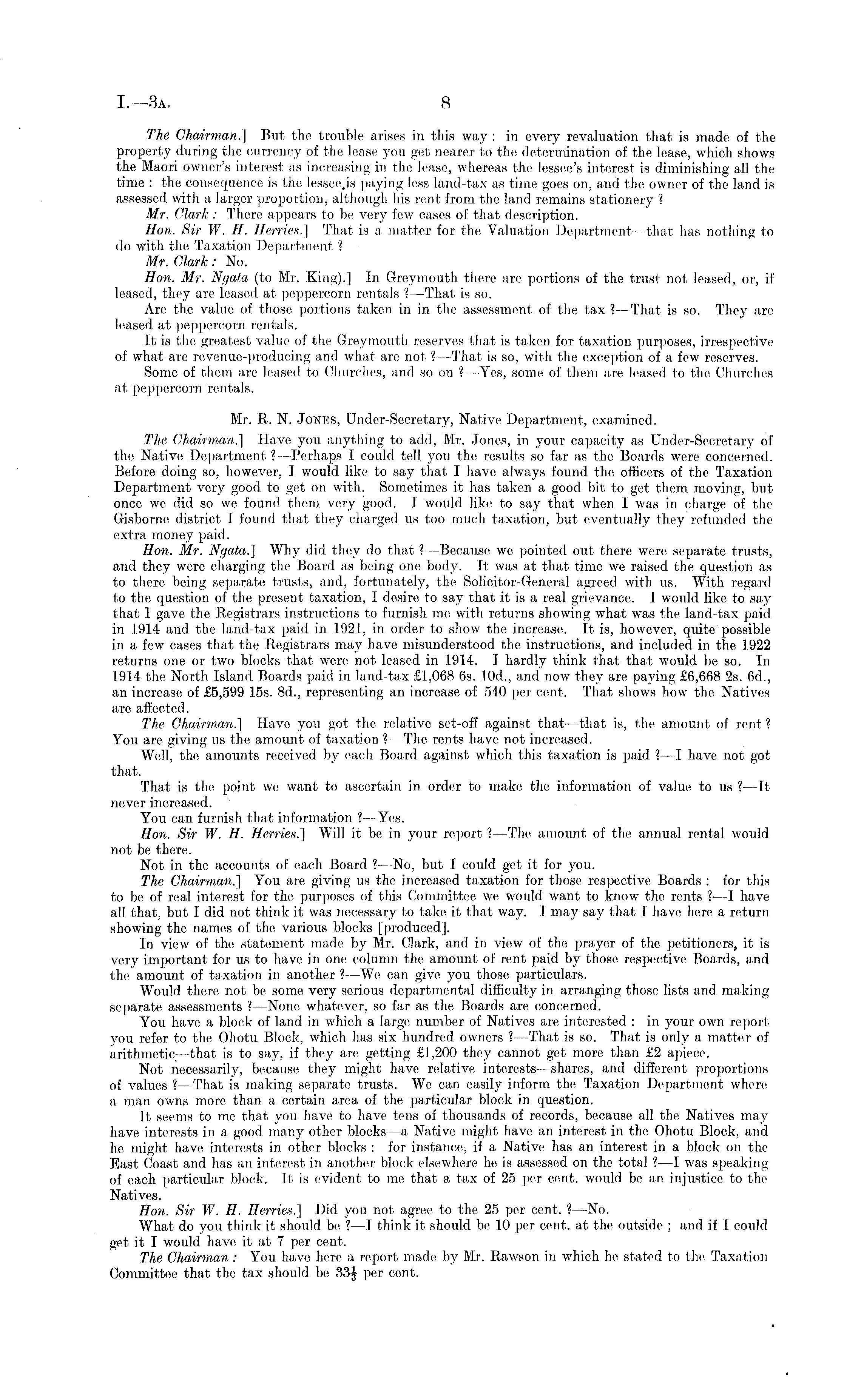 The Chairman.] But the trouble arises in this way : in every revaluation that is made of the property during the currency of the lease you get nearer to the determination of the lease, which shows the Maori owner's interest as increasing in the: lease, whereas the lessee's interest is diminishing all the time : the consequence is the lessee.is paying less land-tax as time goes on, and the owner of the land is assessed with a larger proportion, although his rent from the land remains stationery '? Mr. Clark: There appears to be very few cases of that description. Hon. Sir W. H. Herrics.] That is a matter for the Valuation Department—that has nothing to do with the Taxation Department ? Mr. Clark: No. Hon. Mr. Ngata (to Mr. King).] In Greymouth there are portions of the trust not leased, or, if leased, they are leased at peppercorn rentals ? —That is so. Are the value of those portions taken in in the assessment, of the tax ?—That is so. They are leased at peppercorn rentals. It is the greatest value of the Greymouth reserves that is taken for taxation purposes, irrespective of what are revenue-producing and what are not ?—That is so, with the exception of a few reserves. Some of them arc leased to Churches, and so on ? —Yes, some of them are leased to the Churches at peppercorn rentals. Mr. R. N. Jones, Under-Secretary, Native Department, examined. The Chairman.] Have you anything to add, Mr. Jones, in your capacity as Under-Secretary of the Native Department. ? -Perhaps I could tell you the results so far as the Boards were concerned. Before doing so, however, I would like to say that I have always found tho officers of the Taxation Department very good to get on with, Sometimes it has taken a good bit to get them, moving, but once we did so we found them very good. J would like to say that when I was in charge of the Gisborne district 1 found that they charged us too much taxation, but eventually they refunded the extra money paid. Hon. Mr. Ngata.] Why did they do that ? —Because we pointed, out there were separate trusts, and they were charging the Board as being one body. It was at that time we raised the question as to there being separate trusts, and, fortunately, the Solicitor-General agreed with us. With regarel to the question of the present taxation, I desire to say that it is a real grievance. I would like to say that I gave the Registrars instructions to furnish me with returns showing what was the land-tax paid in 1914 and the land-tax paid in 1921, in order to show the increase. It is, however, quite possible in a few cases that the Registrars may have misunderstood the instructions, and included in the- 1922 returns one or two blocks that were not leased in 1914. I hardly think that that would be so. In 191.4 the North Island Boards paid in land-tax £1,068 6s. 10d.., and now they are paying £6,668 2s. 6d., an increase of £5,599 15s. Bd., representing an increase of 510 per cent. That shows how the Natives are affected. The Chairman.] Have; you got the, relative set-off against that —that is, the; amount of rent ? You are giving us the amount eif taxation ? —The rents have not increased. Well, the; amounts received by each Board against which this taxation is paid ?— I have not got that. That is tho point we want to ascertain in order to make: the information of value to us ? —lt never increased. You can furnish that information ? —Yes. lion. Sir W. H. Herries.] Will it be in your report ? —The amount of the annual rental would not be there. Not in the accounts of each Board ? —No, but I could get it for you. The Chairman.] You are giving us the increased taxation for those respective Boards : for this to be of real interest for the purposes eif this Committee we: would want to know the rents ?■ —I have all that, but I did not think it was necessary to take it that way. I may say that I have here a return showing the names of the various blocks [produced]. In view of the statement made by Mr. Clark, and in view of the prayer of the petitioners, it is very important for us to have in one column the amount of rent paid by those respective Boards, and the; amount of taxation in another ?■— We oan give you those: particulars. Would there not be; some very serious departmental difficulty in arranging those lists and makingseparate assessments ? —None whatever, so far as the Boards are concerned. You have a block of land in which a large number of Natives are interested : in your own report you refer to the Ohotu Block, which has six hundred owners ?—That is so. That is only a matter of arithmetic; —that is to say, if they are getting £1,200 they cannot get more than £2 apiece. Not necessarily, be;cause they might have relative, interests —shares, and different proportions of values ?—That is making separate trusts. We can easily inform the Taxation Department where a man owns more than a certain area of the particular block in question. It seems to me that you have, to have tens of thousands of records, because all the Natives may have interests in a good many other blocks—a Native; might have an interest in the Ohotu Block, and lie, might have interests in either blocks : for instance:', if a Native has an interest in a block on the East Coast and has an interest in another block elsewhere he is assessed on the total ? —I was speaking of each particular block. It is evident to me that a tax eif 25 per cent, would be an injustice to the Natives. Hon. Sir W. 11. Berries.] Did you not agree to the 25 per cent. ? —No. What do you think it should be ? —I think it should be: 10 per cent, at the outside ; and if I could got it I would have it at 7 per cent. The Chairman: You have here a report made by Mr. Rawson in which he stated t.ei the Taxation Committee that the tax should be 33J per cent.