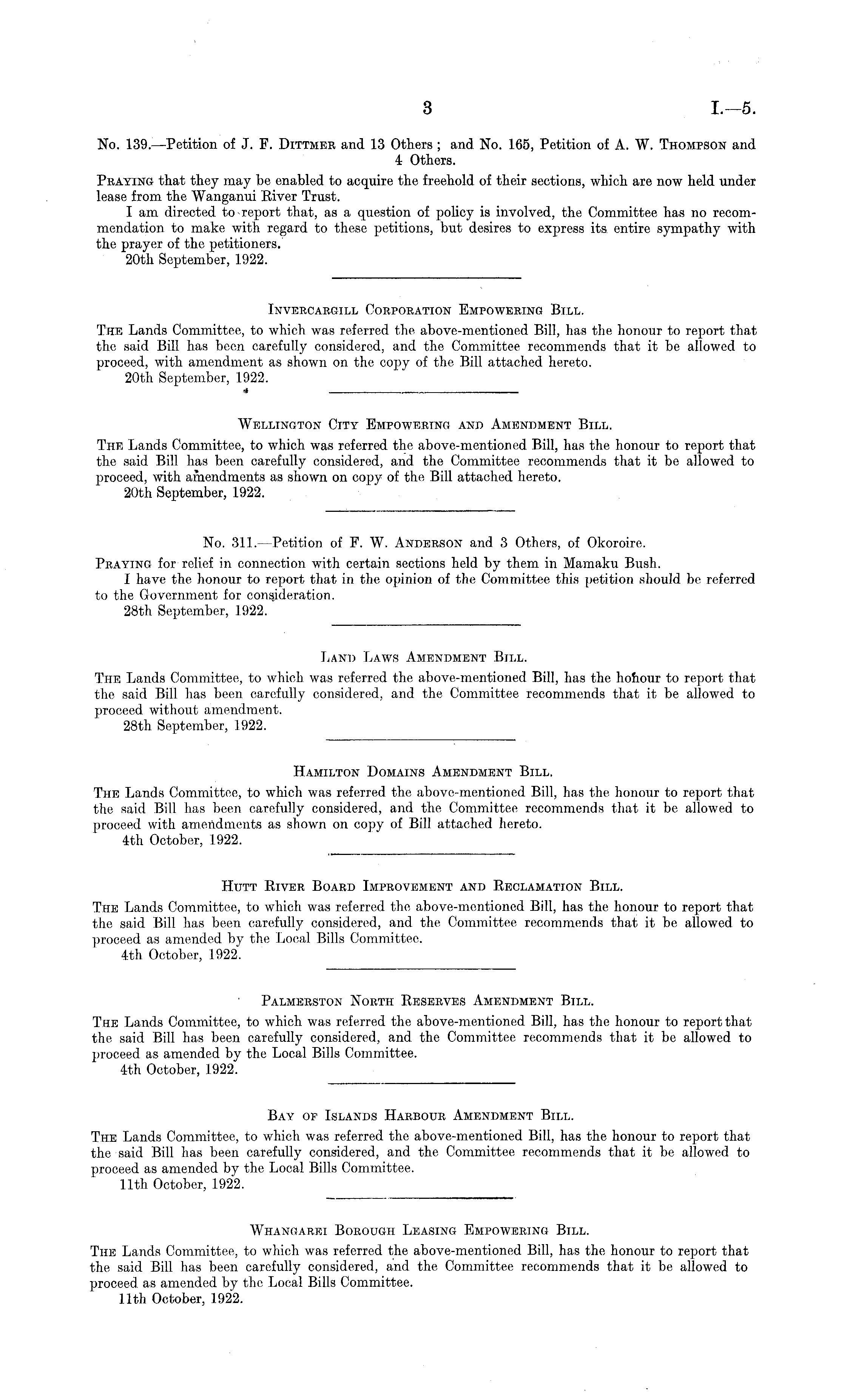 Bay of Islands Harbour Amendment Bill. The Lands Committee, to which was referred the above-mentioned Bill, has the honour to report that the said Bill has been carefully considered, and the Committee recommends that it be allowed to proceed as amended by the Local Bills Committee. 11th October, 1922.