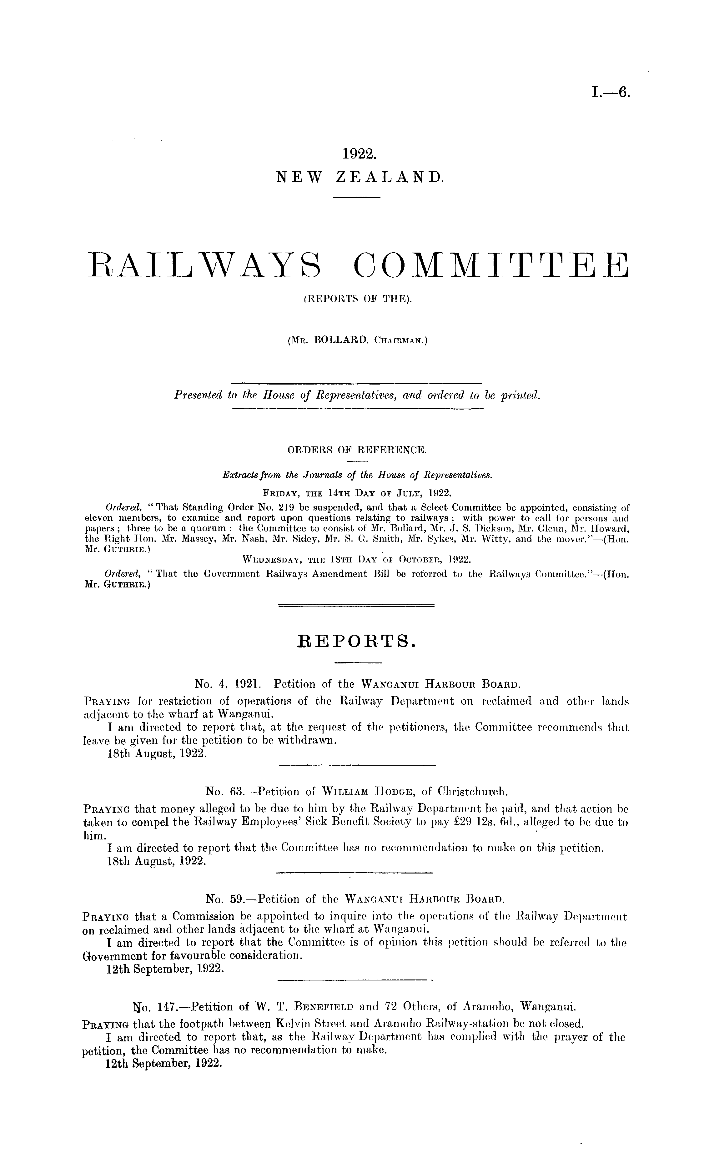 ORDERS OF REFERENCE. Extracts from the Journals of the House of Representatives. Friday, the 14th Day of July, 1922. Ordered, " That Standing Order No. 219 be suspended, and that a Select Committee he appointed, consisting of eleven members, to examine and report upon questions relating to railways ; with power to call for persons and papers ; three to be a quorum : the Committee to consist of Mr. Bollard, Mr. J, S. Dickson, Mr. Glenn, Mr. Howard, the Right Hon. Mr. Massey, Mr. Nash, Mr. Sidey, Mr. S. G. Smith, Mr. Sykes, Mr. Witty, and the mover."—(Hon. Mr. Guthrie.) Wednesday, the 18th Day of October, 1922. Ordered, " That the Government Railways Amendment Bill bo referred to the Railways Committee."—(Hon. Mr. Guthrie.)