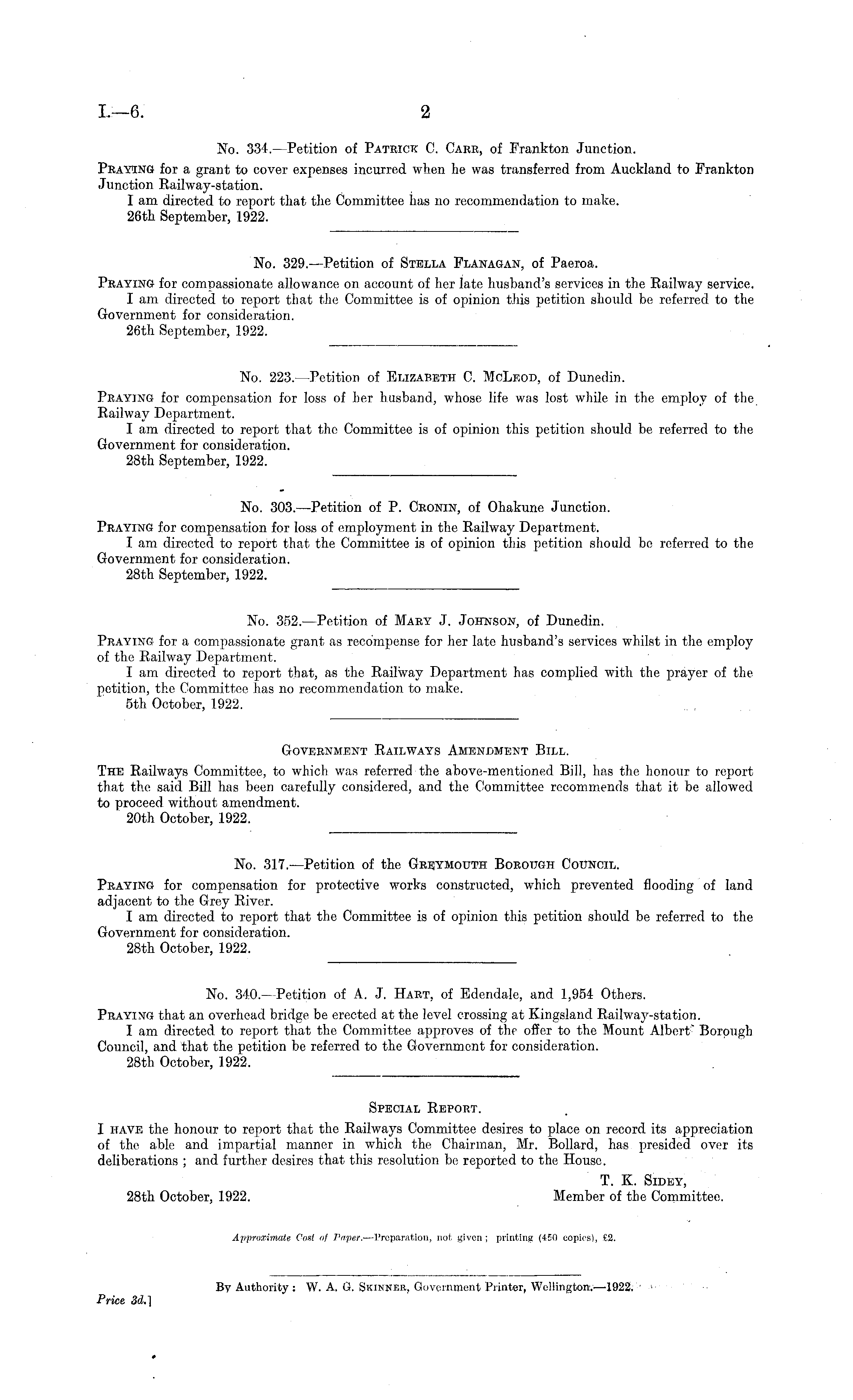 Special Report. I have the honour to report that the Railways Committee desires to place on record its appreciation of the able and impartial manner in which the Chairman, Mr. Bollard, has presided over its deliberations ; and further desires that this resolution be reported to the House. T. K. Sidey, 28th October, 1922. Member of the Committee.