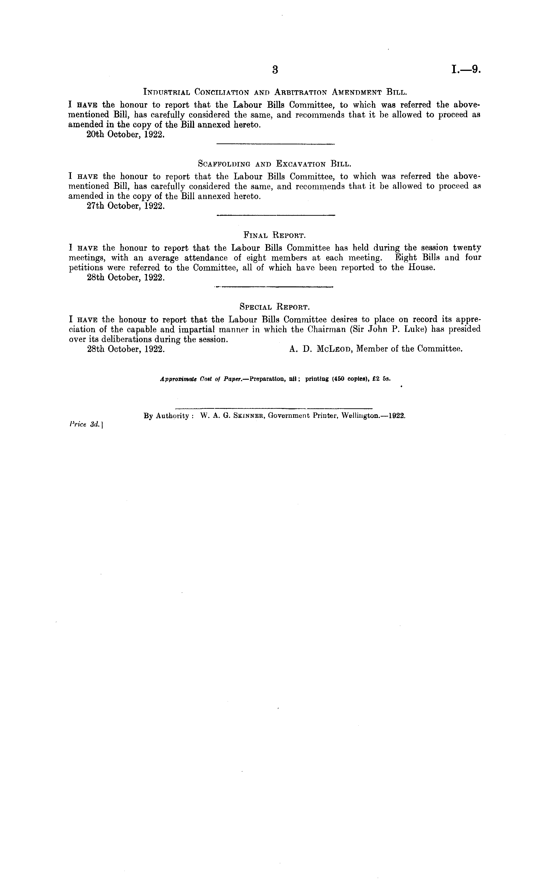Special Report. I have the honour to report that the Labour Bills Committee desires to place on record its appreciation of the capable and impartial manner in which the Chairman (Sir John P. Luke) has presided over its deliberations during the session. 28th October, 1922. A. D. McLeod, Member of the Committee.
