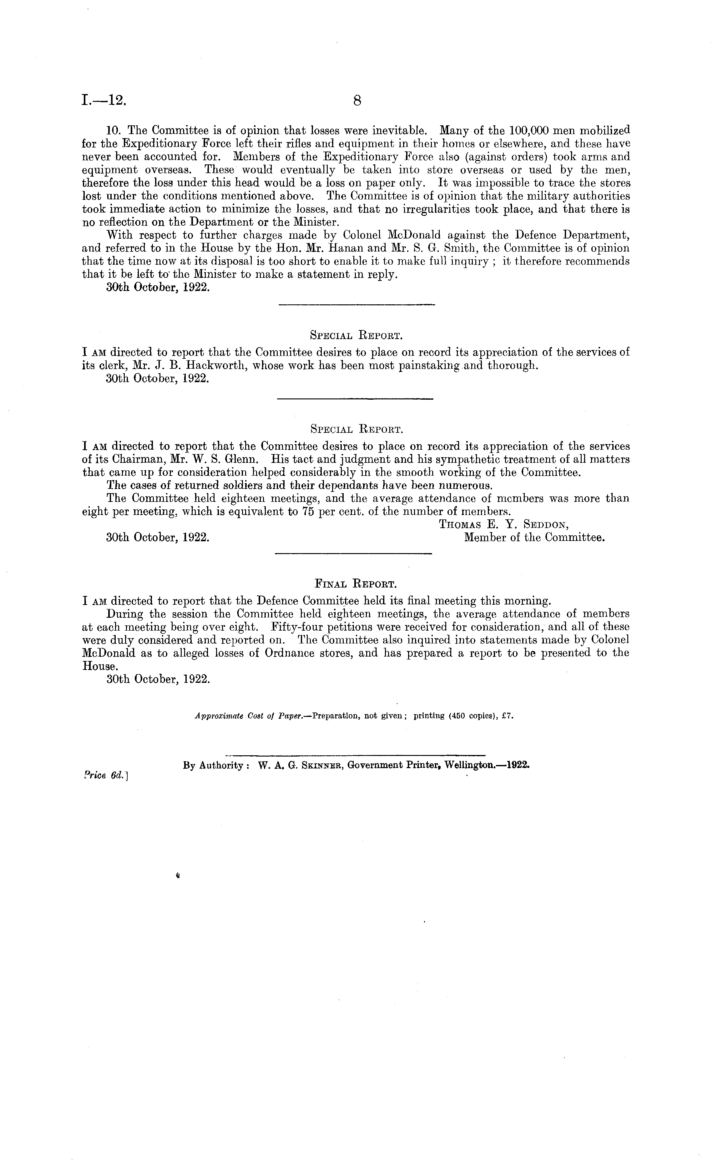 Special Report. I am directed to report that the Committee desires to place on record its appreciation of the services of its clerk, Mr. J. B. Hackworth, whose work has been most painstaking and thorough. 30th October, 1922.