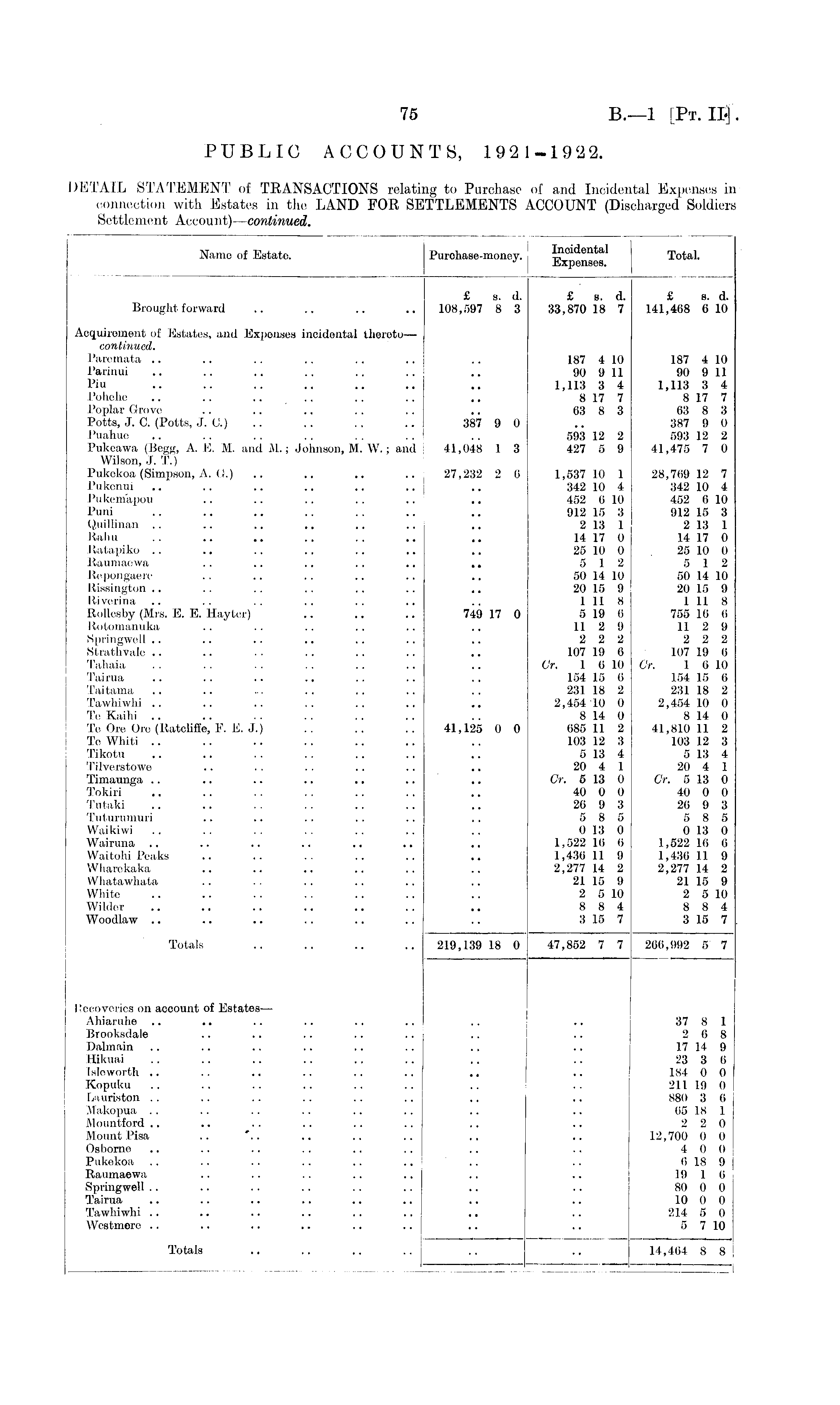 Namo of Estate. Purohase-money. Inoidental Expenses. Total. Brought forward £ s. d. 108,597 8 3 £ s. d. 33,870 18 7 £ s. d. 141,468 6 10 Acquirement of Estates, and Expenses incidontal thereto— continued. Parcmata Parinui Piu Pohehe Poplar Grove Potts, J. C. (Potts, J. C.) Puahue Pukeawa (Begg, A. E. M. and M.; Johnson, M. W.; and Wilson, J. T.) Pukekoa (Simpson, A. G.) Pukenui Pukem'apou Puni Quillinan liahu Ratapiko Raumaewa Repongaere Rissington Rivorina Rollcsby (Mrs. E. E. Haytor) Rotomanuka Springwell Strathvalc Tahaia Tairua Taitama Tawhiwhi Te Kaihi. Te Ore Ore (Ratcliffe, F. E. J.) Te Whiti Tikotu Tilverstowe Timaunga Tokiri Tutaki Tuturumuri Waikiwi Wairuna Waitohi Peaks Wharekaka Wbatawhata White Wilder Woodlaw 387 9 0 41,048 1 3 27,232 2 6 749 17 0 187 4 10 90 9 11 1,113 3 4 8 17 7 63 8 8 593 12 2 427 5 9 1,537 1(3 1 342 10 4 452 6 10 912 15 3 2 13 1 14 17 0 25 10 0 5 1 2 50 14 10 20 15 9 1 11 8 5 19 6 11 2 0 2 2 2 107 19 6 Cr. 1 0 1(3 154 15 6 231 18 2 2,454 10 0 8 14 0 685 11 2 103 12 3 5 13 4 20 4 1 Cr. 5 13 0 40 0 0 26 9 3 5 8 5 0 13 0 1,522 16 6 1,436 11 9 2,277 14 2 21 15 9 2 5 10 8 8 4 3 15 7 187 4 10 90 9 11 1,113 3 4 8 17 7 63 8 3 387 9 0 593 12 2 41,475 7 0 28,769 12 7 342 10 4 452 6 10 912 15 3 2 13 1 14 17 0 25 10 0 5 1 2 50 14 10 20 15 9 1 11 8 755 10 0 11 2 9 2 2 2 107 19 6 Or. 1 6 10 154 15 6 231 18 2 2,454 10 0 8 14 0 41,810 11 2 103 12 3 5 13 4 20 4 1 Or. 5 13 0 40 0 0 26 9 3 5 8 5 0 13 0 1,522 16 6 1,436 11 9 2,277 14 2 21 15 9 2 5 10 8 8 4 3 15 7 41,125 0 0 Totals 219,139 18 0 47,852 7 7 266,002 5 7 Recoveries on acoount of Estates — Ahiaruhe Brooksclale Dalmain Hikuai Isleworth Kopuku Lauriston Makopua Mountford Mount Pisa .. *.. Osborne Pukekoa Raumaewa Springwell Tairua Tawhiwhi Westmore 37 8 1 2 6 8 17 14 9 23 3 6 184 0 0 211 19 0 880 3 6 65 18 1 2 2 0 12,700 (3 0 4 0 0 6 18 9 19 1 6 80 0 0 10 0 0 214 5 0 5 7 10 Totals 14,464 8 8