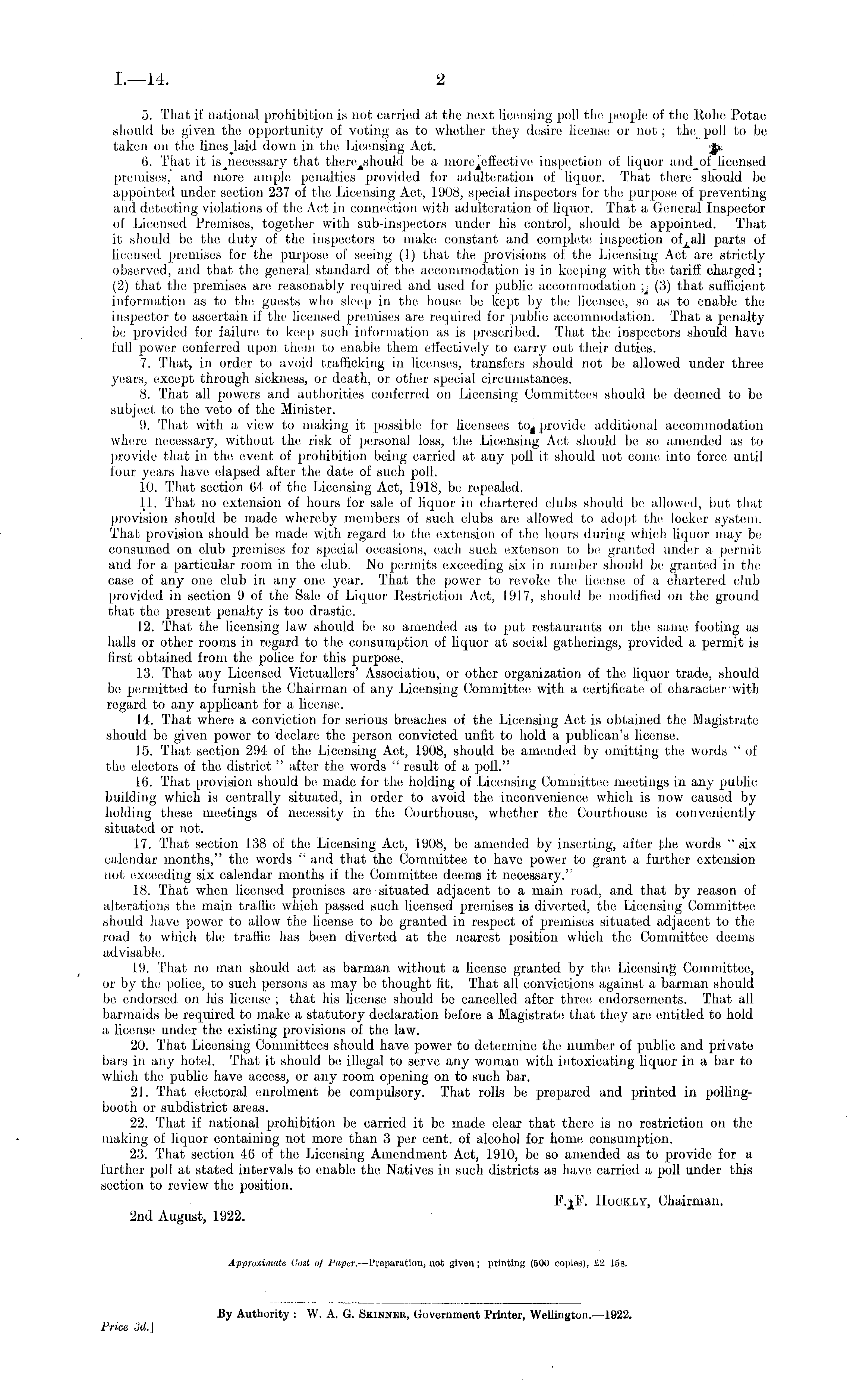 5. That if national prohibition is not carried at the next licensing poll, the people of the Rohe Potac should be given the opportunity of voting as to whether they desire license or not; the_ poll to be taken on the linesJaid down in the Licensing Act. J^ 6. That it is_necessary that there v should be a more_ef_ective inspection of liquor licensed premises, and more ample penalties provided for adulteration of liquor. That there should be appointed under section 237 of the Licensing Act, 1908, special inspectors for the purpose of preventing and detecting violations of the Act in connection with adulteration of liquor. That a General Inspector of Licensed Premises, together with sub-inspectors under his control, should be appointed. That it should be the duty of the inspectors to make constant and complete inspection of_all parts of licensed premises for the purpose of seeing (1) that the provisions of the Licensing Act are strictly observed, and that the general standard of the accommodation is in keeping with the tariff charged; (2) that the premises are reasonably required and used for public accommodation (3) that sufficient information as to the guests who sleep in the house be kept by the licensee, so as to enable the inspector to ascertain if the licensed premises are required for public accommodation. That a penalty be provided for failure to keep such information as is prescribed. That the inspectors should have full power conferred upon them to enable them effectively to carry out their duties. 7. That, in order to avoid trafficking in licenses, transfers should not be allowed under three years, except through sickness, or death, or other special circumstances. 8. That all powers and authorities conferred on Licensing Committees should be deemed to be subject to the veto of the Minister. 9. That with a view to making it possible for licensees provide additional accommodation where necessary, without the risk of personal loss, the Licensing Act should bo so amended as to provide that in the event of prohibition being carried at any poll it should not come into force until four years have elapsed after the date of such poll. 10. That section 64 of the Licensing Act, 1918, bo repealed. 11. That no extension of hours for sale of liquor in chartered clubs should bo allowed, but that provision should be made whereby members of such clubs are allowed to adopt the locker system. That provision should be made with regard to the extension of the hours during which liquor may be consumed on club premises for special occasions, each such extenson to be granted under a permit and for a particular room in the club. No permits exceeding six in number should be granted in the case of any one club in any one year. That the power to revoke the license of a chartered club provided in section 9 of the Sale of Liquor Restriction Act, 1917, should bo modified on the ground that the present penalty is too drastic. 12. That the licensing law should bo so amended as to put restaurants on the same footing as halls or other rooms in regard to the consumption of liquor at social gatherings, provided a permit is first obtained from the police for this purpose. 1,3. That any Licensed Victuallers' Association, or other organization of the liquor trade, should be permitted to furnish the Chairman of any Licensing Committee with a certificate of character with regard to any applicant for a license. 14. That whore a conviction for serious breaches of the Licensing Act is obtained the Magistrate should be given power to declare the person convicted unfit to hold a publican's license. 15. That section 294 of the Licensing Act, 1908, should be amended by omitting the words " of the electors of the district " after the words " result of a poll." 16. That provision should be; made for the holding of Licensing Committee meetings in any public building which is centrally situated, in order to avoid the inconvenience which is now caused by holding these meetings of necessity in the Courthouse, whether the Courthouse is conveniently situated or not. 17. That section 138 of the Licensing Act, 1908, bo amended by inserting, after the words " six calendar months," the words " and that the Committee to have power to grant a further extension not exceeding six calendar months if the Committee deems it necessary." 18. That when licensed promises are situated adjacent to a main road, and that by reason of alterations the main traffic which passed such licensed premises is diverted, the Licensing Committee should have power to allow the license to bo granted in respect of premises situated adjacent to the road to which the traffic has been diverted at the nearest position which the Committee deems advisable. 19. That no man should act as barman without a license granted by the Licensing Committee, or by the police, to such persons as may bo thought fit. That all convictions against a barman should bo endorsed on his license ; that his license should be cancelled after three endorsements. That all barmaids be required to make a statutory declaration before a Magistrate that they are entitled to hold a license under the existing provisions of the law. 20. That Licensing Committees should have power to determine tho number of public and private bars in any hotel. That it should be illegal to serve any woman with intoxicating liquor in a bar to which tho public have access, or any room opening on to such bar. 21. That electoral enrolment be compulsory. That rolls be prepared and printed in pollingbooth or subdistrict areas. 22. That if national prohibition be carried it be made clear that there is no restriction on the making of liquor containing not more than 3 per cent, of alcohol for homo consumption. 23. That section 46 of the Licensing Amendment Act, 1910, be so amended as to provide for a further poll at stated intervals to enable the Natives in such districts as have carried a poll under this section to review the position.