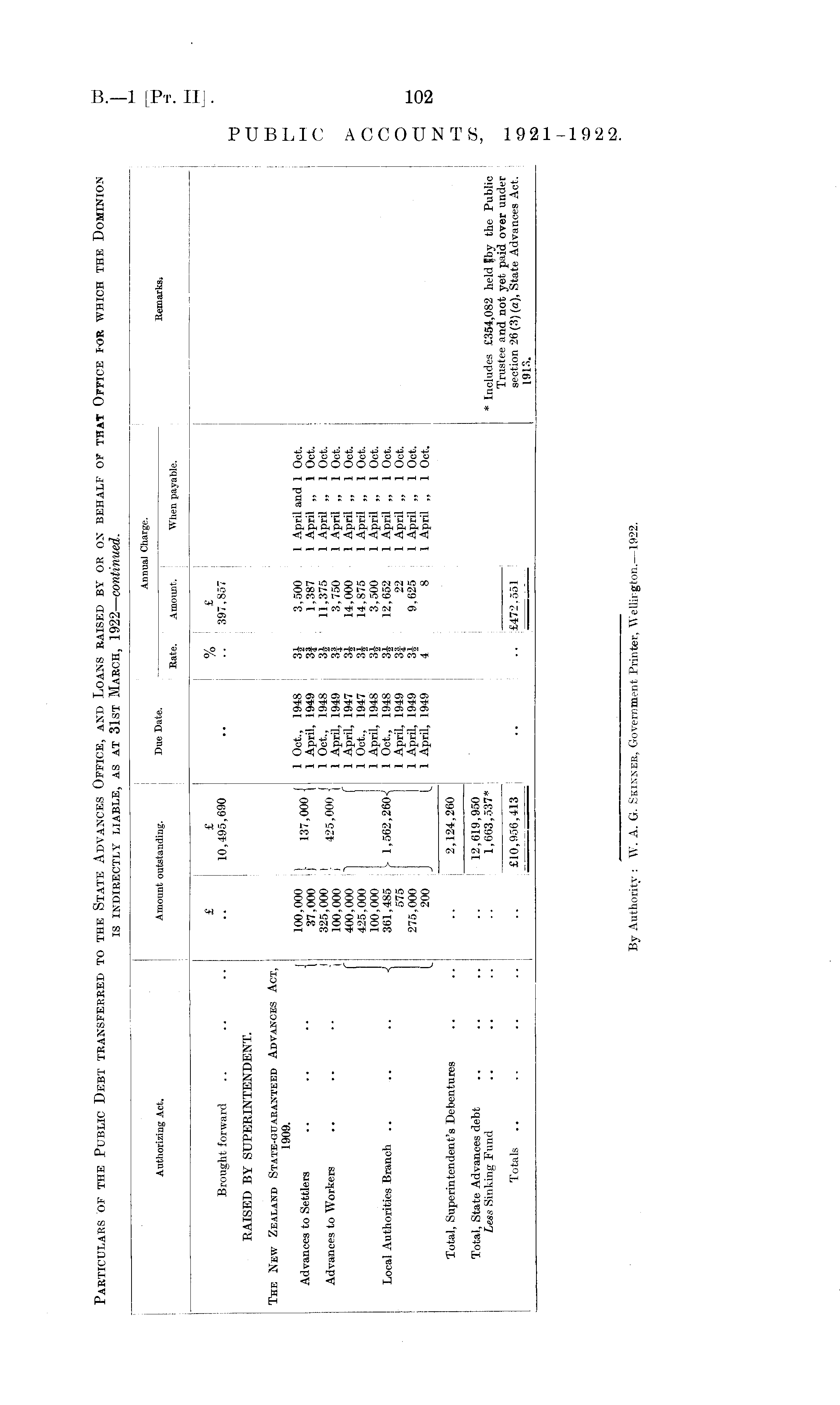 Amount outstanding. Du< Annual Charge. Authorizing Act. .Remarks* Kate. Amount. When payable. Brought forward £ £ 10,495,690 .. % £ 397,857 RAISED BY SUPERINTENDENT. The New Zealand State-guaranteed Advances Act, 1909. Advances to Settlers .. .. .. j Advances to Workers Local Authorities Branch .. .. .. •! Total, Superintendent's Debentures Total, State Advances debt Less Sinking Fund 400,000 ~| f 425,000 100,000 361,485 y l,562,260<j 575 275,000 200 J L 2,124,260 12,619,950 1,663,537* 1 Oct., 1948 1 April, 1949 1 Oct., 1948 1 April, 1949 1 April, 1947 1 Oct., 1947 1 April, 1948 1 Oct., 1948 1 April, 1949 1 April, 1949 1 April, 1949 3J 3,500 3f 1,387 3J 11,375 3} 3,750 3J 14,000 3J 14,875 3J 3,500 3| 12,652 3£ 22 31 9,625 4 8 1 April and 1 Oct. 1 April „ 1 Oct. 1 April „ 1 Oct. 1 April „ 1 Oct. 1 April „ 1 Oct. 1 April „ 1 Oct. 1 April „ 1 Oct. 1 April „ 1 Oct. 1 April „ 1 Oct. 1 April „ 1 Oct. 1 April „ 1 Oct. Totals .. £10,956,413 | .. .. £472,551 ! * Includes £354,082 held |by the Public Trustee and not yet paid over under section 26 (3) (a), State Advances Act. 1913.