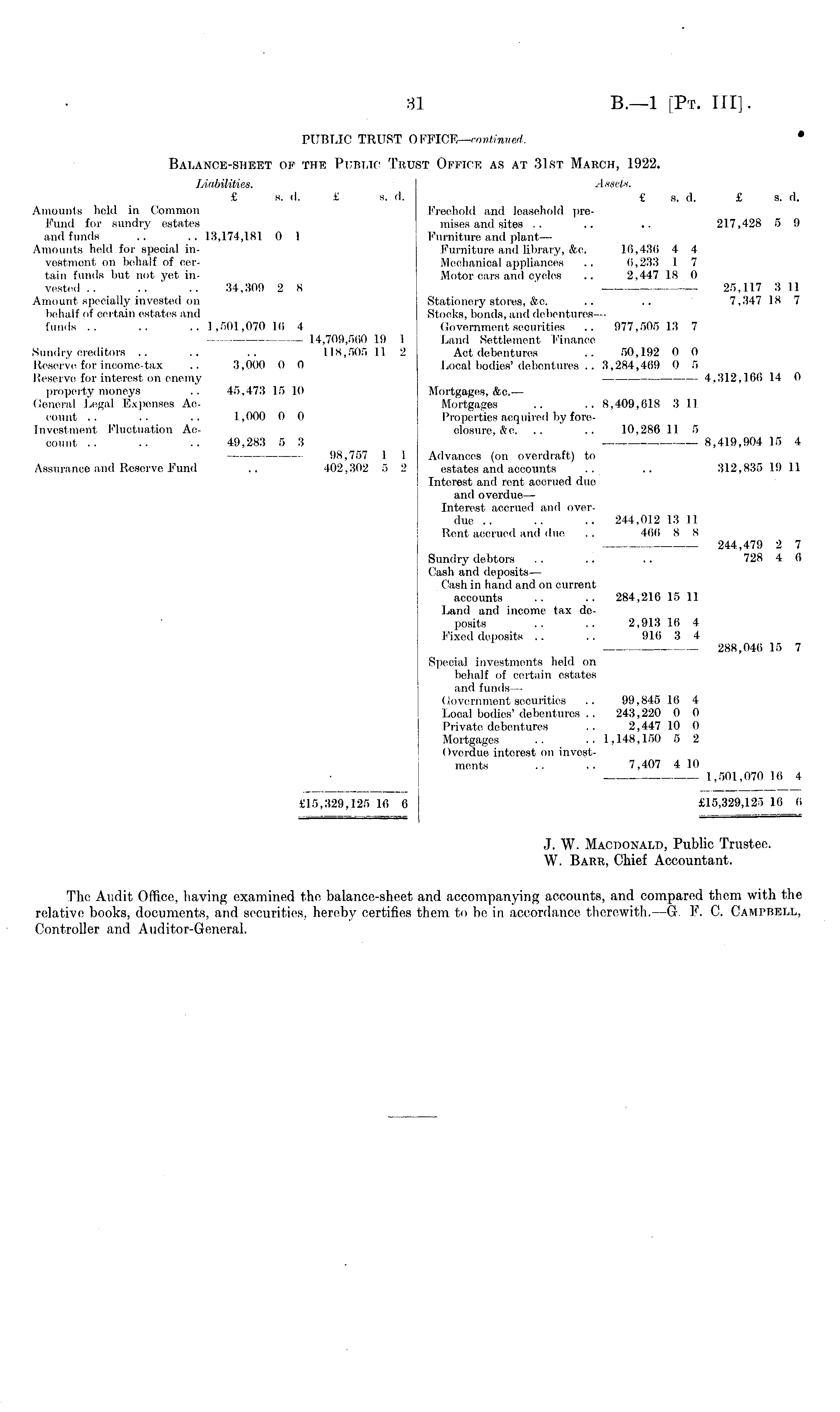 PUBLIC TRUST OFFlCE— continued. Balance-sheet of the Public Trust Office as at 31st March, 1922. Liabilities. A ssets. £ s. cl. £ s. d. £ s. d. £ s. d. Amounts held in Common Freehold and leasehold prel.md for sundry estates mises and sites .. .. .. 217,428 5 9 and funds .. .. 13,174,181 0 1 Furniture and plant — Amounts held for special in- Furniture and library, &o. 1.6,436 4 4 vestment on behalf of ocr- Mechanical appliances .. 0,233 1 7 tain funds but not yet in- Motor cars and cycles .. 2,447 18 0 vested.. . . .. 34,309 2 8 25,117 311 Amount specially invested on Stationery stores, &0. .. .. 7.347 18 7 behalf of certain estates and Stocks, bonds, and debentures—funds .. .. .. 1,501,070 10 4 dovcrnment securities .. 977,505 13 7 14,709,500 19 1 Land Settlement I.nance Sundry creditors .. .. .. 118,505 11 2 Act debentures .. 50,192 0 0 Reserve for income-tax .. 3,000 0 0 Local bodies'debentures .. 3,284,409 0 5 Reserve for interest on enemy 4,312,166 14 0 property moneys .. 45,473 15 10 Mortgages, &c. — General Legal Expenses Ac- Mortgages .. .. 8,409,018 3 11 count .. .. .. 1,000 0 0 Properties acquired by foreInvestment Fluctuation Ac- closure, die. .. .. 10,286 11 5 count .. .. .. 49,283 5 3 8,419,904 15 4 98,757 1 1 Advances (on overdraft) to Assurance and Reserve Fund .. 402,302 5 2 estates and accounts .. .. 312,835 19 11 Intorest and rent accrued duo and overdue— Interest accrued and overdue .. .. .. 244,012 13 11 Rent accrued and due .. 400 8 8 244,479 2 7 Sundry debtors .. . . . . 728 4 6 Cash and deposits— ('ash in hand and on current accounts .. .. 284,216 15 11 Land and income tax deposits .. .. 2,913 16 4 Fixed deposits . . . . 916 3 4 288,046 15 7 Special investments held on behalf of certain estates and funds— Government securities .. 99,845 16 4 Looal bodies' debentures .. 243,220 0 0 Private debentures .. 2,447 10 0 Mortgages .. .. 1,148,150 5 2 Overdue interest on investments .. .. 7,407 4 10 1,501.070 10 4 £15,329,125 16 6 £15,329,125 16 6 J. W. Macdonald, Public Trustee. W. Barr, Chief Accountant. The Audit Office, having examined the balance-sheet and accompanying accounts, and compared them with the relative books, documents, and securities, hereby certifies them to be in accordance therewith. G. 1. C. Campbell, Controller and Auditor-General.