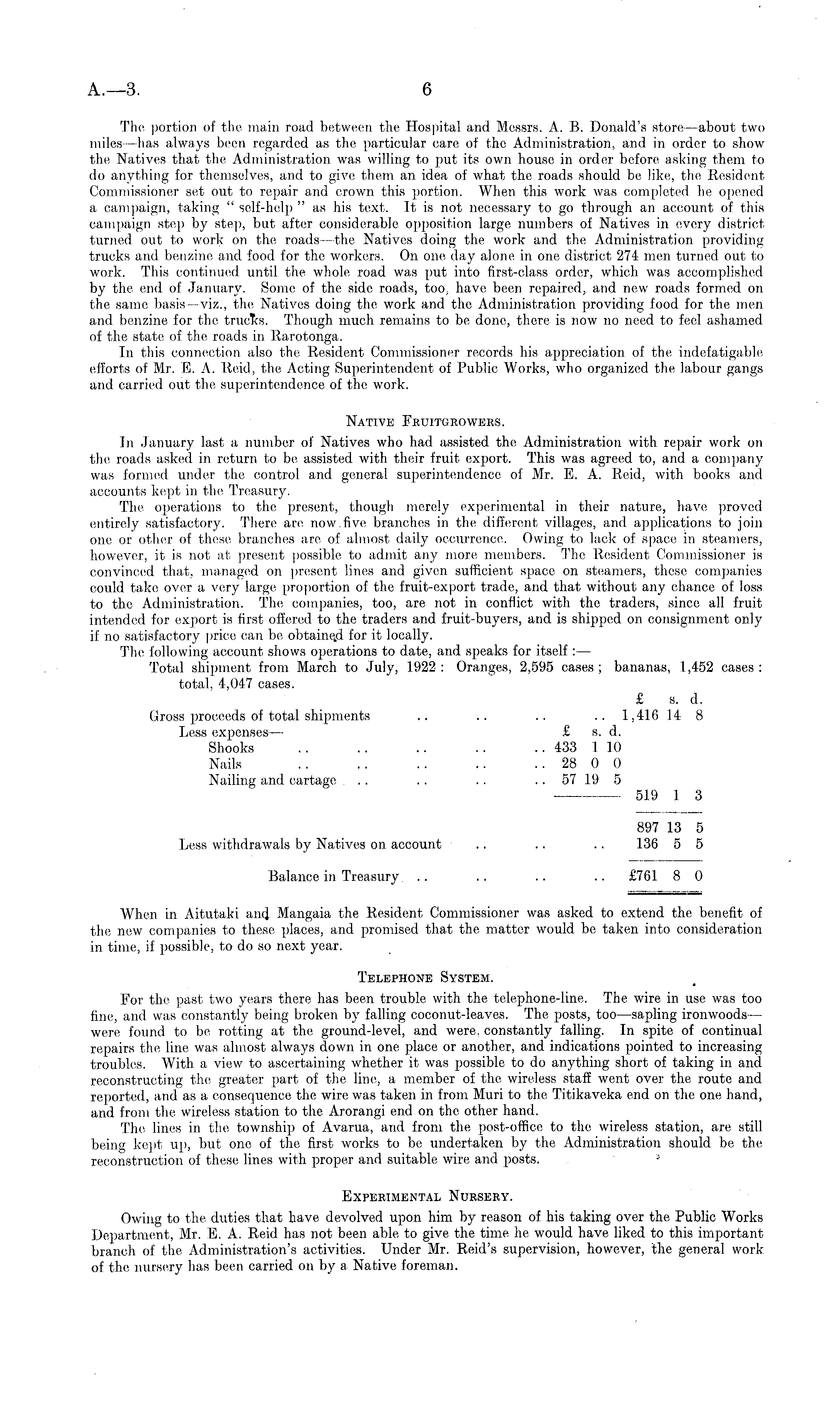 The portion of the main road between the Hospital and Messrs. A. B. Donald's store —about two miles —has always been regarded as the particular care of the Administration, and in order to show the Natives that the Administration was willing to put its own house in order before asking them to do anything for themselves, and to give them an idea of what the roads should be like, the Resident Commissioner set out to repair and crown this portion. When this work was completed he opened a campaign, taking " self-help " as his text. It is not necessary to go through an account of this campaign step by step, but after considerable opposition large numbers of Natives in every district turned out to work on the roads —the Natives doing the work and the Administration providing trucks and benzine and food for the workers. On one day alone in one district 274 men turned out to work. This continued until the whole road was put into first-class order, which was accomplished by the end of January. Some of the side roads, too, have been repaired, and new roads formed on the same basis —viz., the Natives doing the work and the Administration providing food for the men and benzine for the trucTcs. Though much remains to be done, there is now no need to feel ashamed of the state of the roads in Rarotonga. In this connection also the Resident Commissioner records his appreciation of the indefatigable efforts of Mr. E. A. Reid, the Acting Superintendent of Public Works, who organized the labour gangs and carried out the superintendence of the work. Native Fruitgrowers. In January last a number of Natives who had assisted the Administration with repair work on the roads asked in return to be assisted with their fruit export. This was agreed to, and a company was formed under the control and general superintendence of Mr. E. A. Reid, with books and accounts kept in the Treasury. The operations to the present, though merely experimental in their nature, have proved entirely satisfactory. There are now.five branches in the different villages, and applications to join one or other of these branches are of almost daily occurrence. Owing to lack of space in steamers, however, it is not at present possible to admit any more members. The Resident Commissioner is convinced that, managed on present lines and given sufficient space on steamers, these companies could take over a very large proportion of the fruit-export trade, and that without any chance of loss to the Administration. The companies, too, are not in conflict with the traders, since all fruit intended for export is first offered to the traders and fruit-buyers, and is shipped on consignment only if no satisfactory price can be obtained for it locally. The following account shows operations to date, and speaks for itself : — Total shipment from March to July, 1922: Oranges, 2,595 cases; bananas, 1,452 cases: total, 4,047 cases. £ s. d. Gross proceeds of total shipments .. .. .. .. 1,416 14 8 Less expenses — £ s. d. Shooks .. .. .. .. .. 433 I 10 Nails .. .. .. .. .. 28 0 0 Nailing and cartage . . . . . . 57 19 5 5.1.9 1 3 897 13 5 Less withdrawals by Natives on. account .. . . .. 136 5 5 Balance in Treasury .. . . . . .. £761 8 0 When in Aitutaki and Mangaia the Resident Commissioner was asked to extend the benefit of the new companies to these places, and promised that the matter would be taken into consideration in time, if possible, to do so next year. Telephone System. For the past two years there has been trouble with the telephone-line. The wire in use was too fine, and was constantly being broken by falling coconut-leaves. The posts, too —sapling ironwoods — were found to be rotting at the ground-level, and were, constantly falling. In spite of continual repairs the line was almost always down in one place or another, and indications pointed to increasing troubles. With a view to ascertaining whether it was possible! to do anything short of taking in and reconstructing the greater part of the line, a member of the wireless staff went over the route and reported, and as a consequence the wire was taken in from Muri to the Titikaveka end on the one hand, and from the wireless station to the Arorangi end on the other hand. The lines in the township of Avarua, and from the post-office to the wireless station, are still being kept up, but one of the first works to be undertaken by the Administration should be the reconstruction of these lines with proper and suitable wire and posts. Experimental Nursery. Owing to the. duties that have devolved upon him by reason of his taking over the Public Works Department, Mr. E. A. Reid has not been able to give the time he would have liked to this important branch of the Administration's activities. Under Mr. Reid's supervision, however, the general work of the nursery has been carried on by a Native foreman.