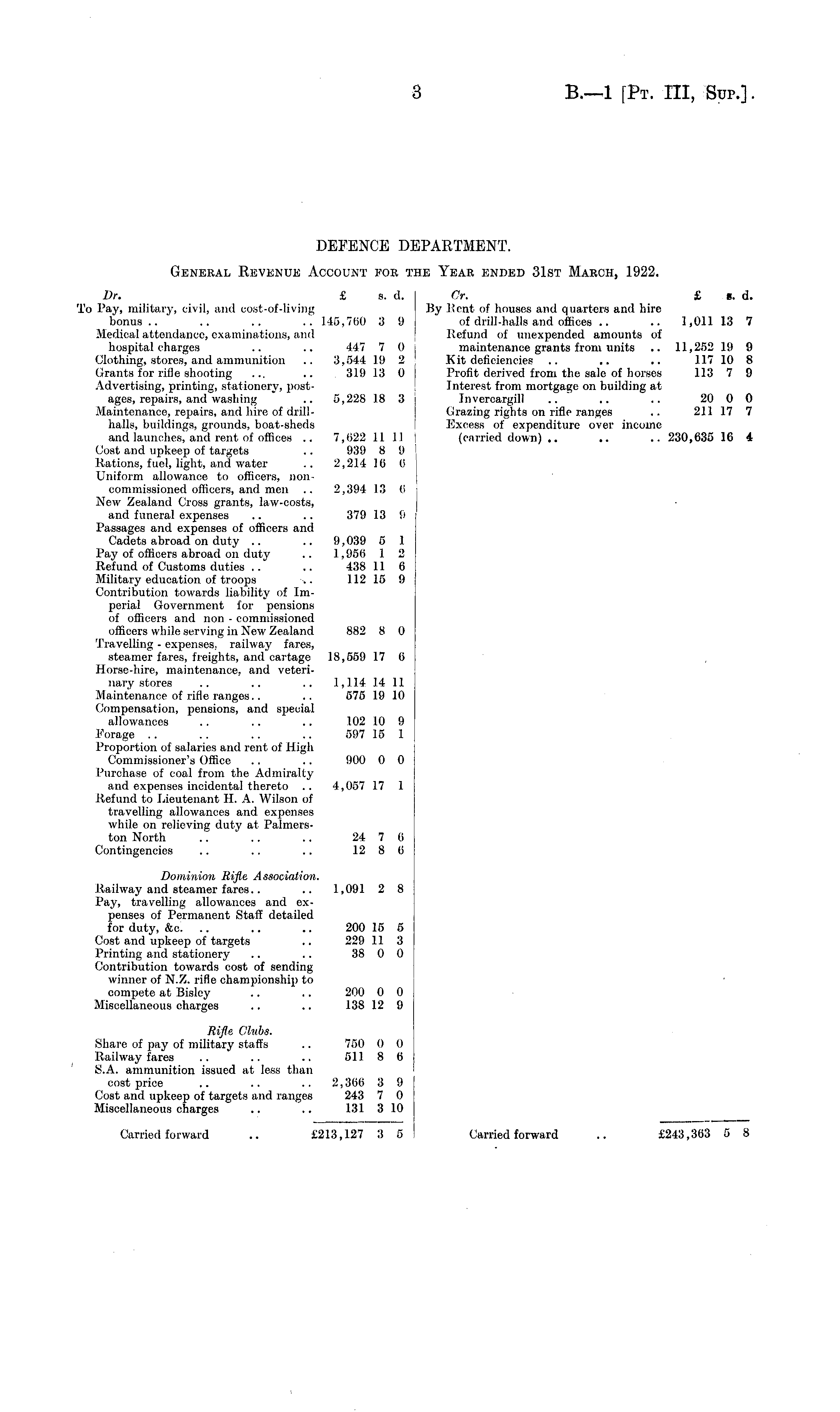 DEFENCE DEPARTMENT. General Revenue Account for the Year ended 31st March, 1922. Dr. £ a. d. I Cr. £ c. d. To Pay, military, civil, and cost-of-living \ By Rent of houses and quarters and hire bonus.. .. .. .: 145,760 3 9 of drill-halls and offices .. .. 1,01113 7 Medical attendance, examinations, and Retold of unexpended amounts of hospital charges .. .. 447 7 (I maintenance grants from units .. 11,252 19 9 Clothing, stores, and ammunition .. 3,544 19 2 ! Kit deficiencies .. .. .. 117 10 8 Grants for rifle shooting ... .. 319 13 0 Profit derived from the sale of horses 113 7 9 Advertising, printing, stationery, post- Interest from mortgage on building at ages, repairs, and washing .. 5,228 18 3 j Invercargill .. .. .. 20 0 0 Maintenance, repairs, and hire of drill- Crazing rights on rifle ranges .. 211 17 7 halls, buildings, grounds, boat-sheds Excess of expenditure over income and launches, and rent of offices .. 7,622 11 11 (carried down) .. .. .. 230,635 16 4 Cost and upkeep of targets .. 939 8 9 Rations, fuel, light, and water .. 2,214 10 6 Uniform allowance to officers, noncommissioned officers, and men .. 2,394 13 (i New Zealand Cross grants, law-costs, and funeral expenses .. .. 379 13 9 Passages and expenses of officers and Cadets abroad on duty .. .. 9,039 5 1 Pay of officers abroad on duty .. 1,956 1 2 Refund of Customs duties .. .. 438 11 6 Military education of troops ••. 112 15 9 Contribution towards liability of Imperial Government for pensions of officers and non - commissioned officers while serving in New Zealand 882 8 0 Travelling - expenses, railway fares, steamer fares, freights, and cartage 18,559 17 6 Horse-hire, maintenance, and veterinary stores .. .. .. 1,11.4 14 11 Maintenance of rifle ranges.. .. 575 19 10 Compensation, pensions, and special allowances .. .. .. 102 10 9 Forage .. .. .. .. 597 15 1 Proportion of salaries and rent of High Commissioner's Office .. .. 900 0 0 Purchase of coal from the Admiralty and expenses incidental thereto .. 4,057 17 1 Refund to Lieutenant H. A. Wilson of travelling allowances and expenses while on relieving duty at Palmerston North .. .. .. 24 7 6 Contingencies .. .. .. 1.2 8 6 Dominion Rifle Association. Railway and steamer fares.. .. 1,091 2 8 Pay, travelling allowances and expenses of Permanent Staff detailed for duty, &c. .. .. .. 200 16 5 Cost and upkeep of targets .. 229 11 3 Printing and stationery .. .. 38 0 0 Contribution towards cost of sending winner of N.Z. rifle championship to compete at Bisley .. .. 200 0 0 Miscellaneous charges .. .. 138 12 9 Rifle Clubs. Share of pay of military staffs .. 750 0 0 Railway fares .. .. .. 511 8 6 S.A. ammunition issued at less than cost price .. .. .. 2,366 3 9 Cost and upkeep of targets and ranges 243 7 0 Miscellaneous charges .. .. 131 3 10 Carried forward .. £213,127 3 5 Carried forward .. £243,363 5 8