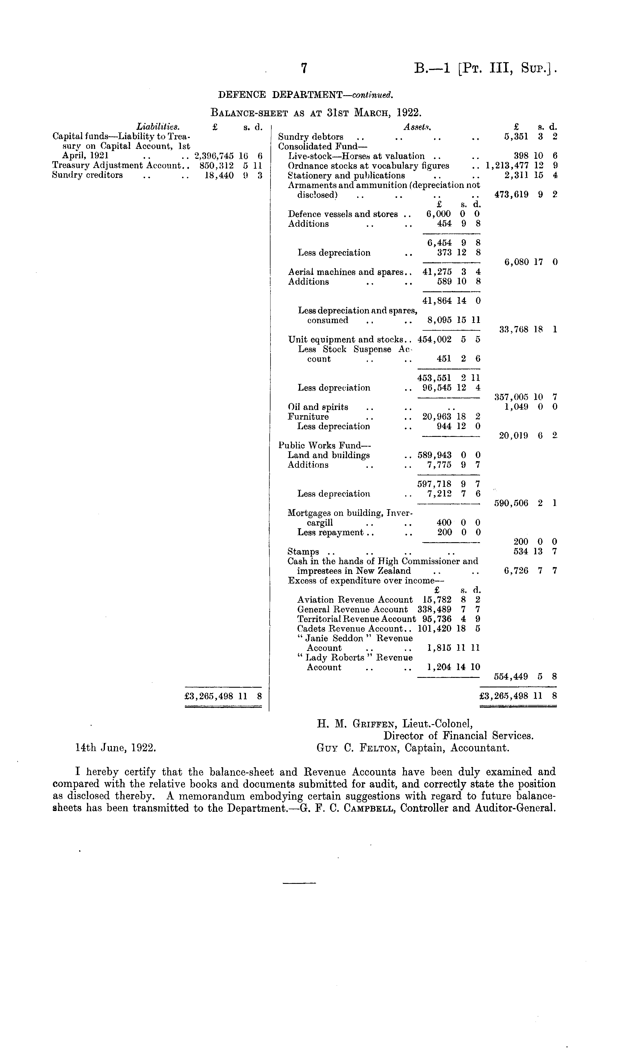DEFENCE DEPARTMENT— continued. Balance-sheet as at 31st March, 1922. Liabilities. £ s. d. Assets. £ s. d. Capital funds—Liability to Trea- Sundry debtors .. .. .. .. 5,3351 3 2 surv on Capital Account, Ist Consolidated Fund — April, 1921 .. .. 2,396,745 .1.6 6 Live-stock—Horses at valuation .. .. 398 10 6 Treasury Adjustment Account.. 850,312 511 Ordnance stocks at vocabulary figures .. 1,213,477 12 9 Sundry creditors .. .. 18,440 9 3 Stationery and publications .. .. 2,311 15 4 Armaments and ammunition (depreciation not disclosed) .. .. .. .. 473,619 9 2 £ s. d. Defence vessels and stores .. 6,000 0 0 Additions .. .. 454 9 8 6,454 9 8 Less depreciation .. 373 12 8 6,080 17 0 Aerial machines and spares.. 41,275 3 4 Additions .. .. 589 10 8 41,864 14 0 Less depreciation and spares, consumed .. .. 8,095 15 11 33,768 18 1 Unit equipment and stocks.. 454,002 5 5 Less Stock Suspense Ac count .. .. 451 2 6 453,551 2 11 Less depreciation .. 96,545 12 4 357,005 10 7 Oil and spirits .. .. .. 1,049 0 0 Furniture .. .. 20,963 .1.8 2 Less depreciation .. 944 12 0 20,019 6 2 Public Works Fund— Land and buildings .. 589,943 0 0 Additions .. .. 7,775 9 7 597,718 9 7 Less depreciation .. 7,212 7 6 590,506 2 1 Mortgages on building, Invercargill •• .. 400 0 0 Less repayment .. .. 200 0 0 200 0 0 Stamps .. .. .. .. 534 13 7 Cash in the hands of High Commissioner and imprestees in New Zealand .. .. 6,726 7 7 Excess of expenditure over income— £ s. d. Aviation Revenue Account 15,782 8 2 General Revenue Account 338,489 7 7 Territorial Revenue Account 95,736 4 9 Cadets Revenue Account.. 101,420 18 5 " .Tanie Seddon " Revenue Account .. .. 1,815 11 11 " Lady Roberts " Revenue Account .. .. 1,204 14 10 554,449 5 8 £3,265,498 11 8 £3,265,498 11 8 H. M. Griffen, Lieut.-Colonel, Director of Financial Services. 14th June, 1922. Guy C. Felton, Captain, Accountant. I hereby certify that the balance-sheet and Revenue Accounts have been duly examined and compared with the relative books and documents submitted for audit, and correctly state the position as disclosed thereby. A memorandum embodying certain suggestions with regard to future balancesheets has been transmitted to the Department.—G. F. C. Campbell, Controller and Auditor-General.
