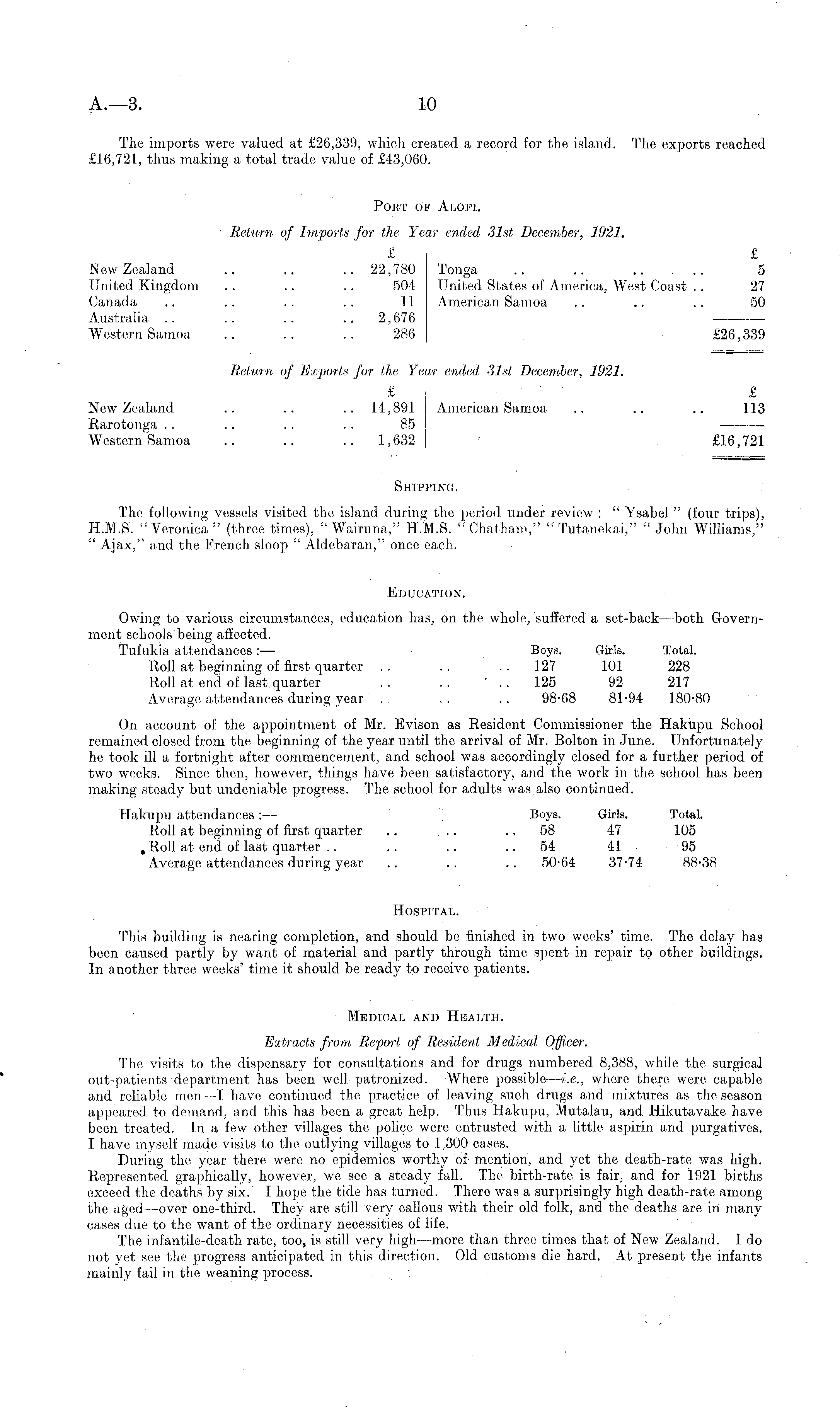 The imports were valued at £26,339, which created a record for the island. The exports reached £16,721, thus making a total trade value of £43,060. Port of Alofi. Return of Imports for the Year ended 31st December, 1921. £ £ New Zealand .. .. .. 22,780 Tonga .. .. 5 United Kingdom .. .. .. 504 United States of America, West Coast .. 27 Canada .. .. . . . . 11 American Samoa .. .. .. 50 Australia .. .. .. .. 2,676 Western Samoa .. .. .. 286 £26,339 Return of Exports for the Year ended 31st December, 1921. £ £ New Zealand .. .. .. 14,891 American Samoa .. .. .. 113 Rarotonga .. .. .. .. 85 Western Samoa .. .. .. 1,632 £16,721 Shipping. The following vessels visited the island during the period under review : " Ysabel " (four trips), H.M.S. " Veronica " (three times), " Wairuna," H.M.S. " Chatham," " Tutanekai," " John Williams," " Ajax," and the French sloop " Aldebaran," once each. Education. Owing to various circumstances, education has, on the whole, suffered a set-back— both Government schools'being affected. Tufukia attendances :— Boys. Girls. Total. Roll at beginning of first quarter .. .. .. 127 101 228 Roll at end of last quarter .. .. 125 92 217 Average attendances during year . . . . .. 98-68 81-94 180-80 On account of the appointment of Mr. Evison as Resident Commissioner the Hakupu School remained closed from the beginning of the year until the arrival of Mr. Bolton in June. Unfortunately he took ill a fortnight after commencement, and school was accordingly closed for a further period of two weeks. Since then, however, things have been satisfactory, and the work in the school has been making steady but undeniable progress. The school for adults was also continued. Hakupu attendances : — Boys. Girls. TotalRoll at beginning of first quarter .. ~...■ ~ 58 47 105 , Roll at end of last quarter .. .. .. 54 41 95 Average attendances during year .. . . .. 50-64 37-74 88-38 Hospital. This building is nearing completion, and should be finished in two weeks' time. The delay has been caused partly by want of material and partly through time spent in repair to other buildings. In another three weeks' time it should be ready to receive patients. Medical and Health. Extracts from Report of Resident Medical Officer. The visits to the dispensary for consultations and. for drugs numbered 8,388, while the surgical out-patients department has been well patronized. Where possible — i.e., where there were capable and reliable men —I have continued the practice of leaving such drugs and mixtures as the season, appeared to demand, and this has been a great help. Thus Hakupu, Mutalau, and Hikutavake have been treated. In a few other villages the police were entrusted with a little aspirin and purgatives. I have myself made visits to the outlying villages to 1,300 cases. During the year there were no epidemics worthy of mention, and yet the death-rate was high. Represented graphically, however, we see a steady fall. The birth-rate is fair, and for 1921 births exceed the deaths by six. I hope the tide has turned. There was a surprisingly high death-rate among the aged —over one-third. They are still very callous with their old folk, and the deaths are in many cases due to the want of the ordinary necessities of life. The infantile-death rate, too, is still very high—more than three times that of New Zealand. Ido not yet see the progress anticipated in this direction. Old customs die hard. At present the infants mainly fail in the weaning process. , •