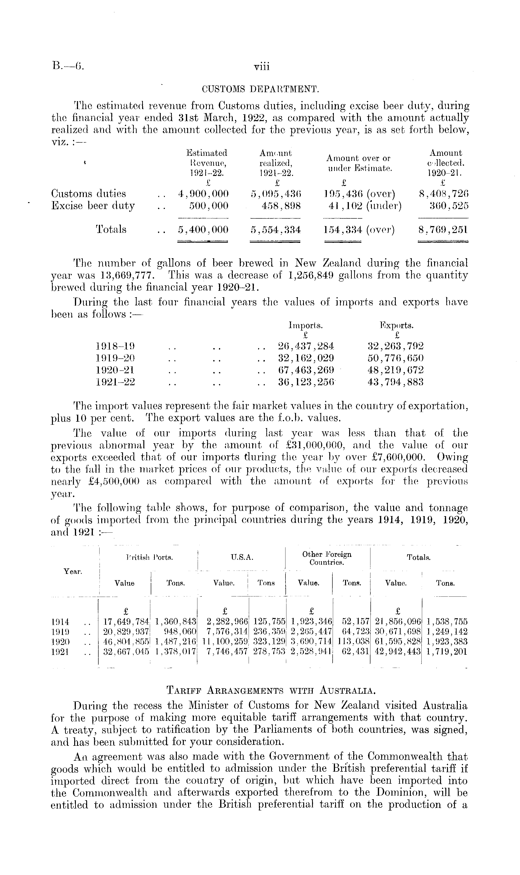 CUSTOMS DEPARTMENT. The estimated revenue from Customs duties, including excise beer duty, during the financial year ended 31st March, 1922, as compared with the amount actually realized and with the amount collected for the previous year, is as set forth below, viz. : — Estimated Amount . Amount r , t Amount over or „ , _ < .Revenue, realized, 117+- f collected. 1921-22. 1921-22. under Estimate. 1920-21. £ £ £ £ Customs duties .. 4,900,000 5,095,436 195,436 (over) 8,408,726 Excise beer duty .. 500,000 458,898 41 ,102 (under) 360,525 Totals .. 5,400,000 5,554,334 154,334 (over) 8,769,251 The number of gallons of beer brewed in New Zealand during the financial year was 13,669,777. This was a decrease of 1,256,849 gallons from the quantity brewed during the financial year 1920-21. During the last four financial years the values of imports and exports have been as follows : — Imports. Exports. £ £ 1918-19 .. .. .. 26,437,284 32,263,792 1919-20 .. .. .. 32,162,029 50,776,650 1920-21 .. .. .. 67,463,269 48,219,672 1921-22 .. .. .. 36,123,256 43,794,883 The import values represent the fair market values in the country of exportation, plus 10 per cent. The export values are the f.o.b. values. The value of our imports during last year was less than that of the previous abnormal year by the amount of £31,000,000, and the value of our exports exceeded that of our imports during the year by over £7,600,000. Owing to the fall in the market prices of our products, the value of our exports decreased nearly £4,500,000 as compared with the amount of exports for the previous year. The following table shows, for purpose of comparison, the value and tonnage of goods imported from the principal countries during the years 1914, 1919, 1920, and 1921 :—