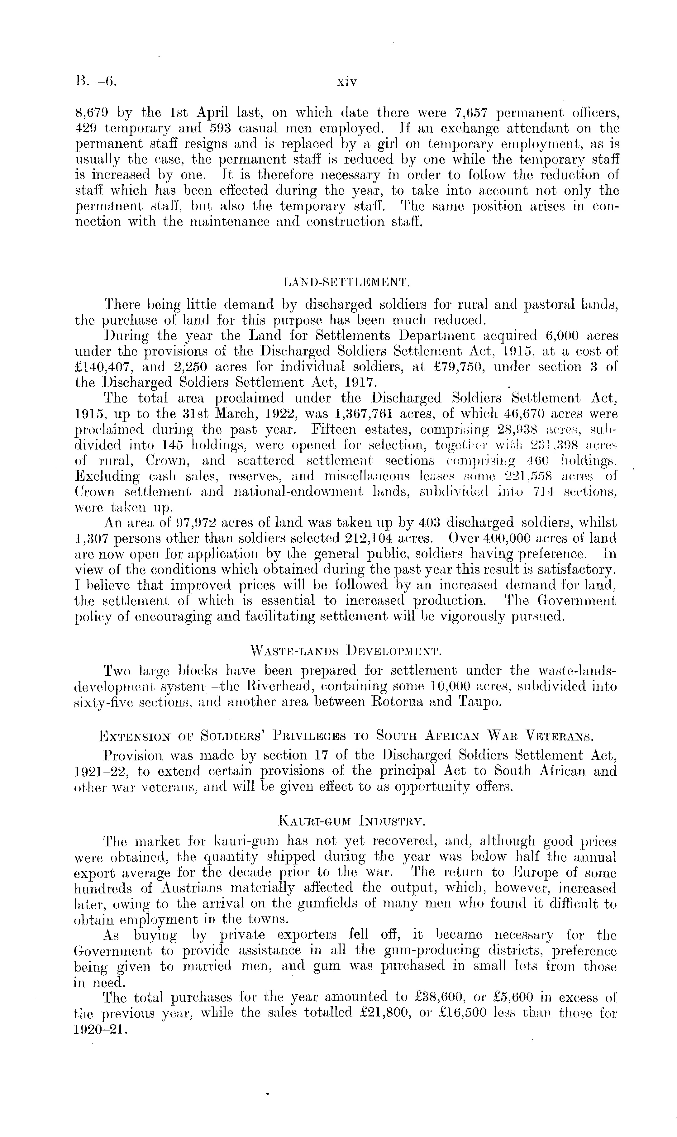 8,679 by the Ist April last, on which date there were 7,657 permanent officers, 429 temporary and 593 casual men employed. If an exchange attendant on the permanent staff resigns and is replaced by a girl on temporary employment, as is usually the case, the permanent staff is reduced by one while the temporary staff is increased by one. It is therefore necessary in order to follow the reduction of staff which has been effected during the year, to take into account not only the permanent staff, but also the temporary staff. The same position arises in connection with the maintenance and construction staff. LAND-SETTLEMENT. There being little demand by discharged soldiers for rural and pastoral lands, the purchase of land for this purpose has been much reduced. During the year the Land for Settlements Department acquired 6,000 acres under the provisions of the Discharged Soldiers Settlement Act, 1915, at a cost of £140,407, and 2,250 acres for individual soldiers, at £79,750, under section 3 of the Discharged Soldiers Settlement Act, 1917. The total area proclaimed under the Discharged Soldiers Settlement Act, 1915, up to the 31st March, 1922, was 1,367,761 acres, of which 46,670 acres were proclaimed during the past year. Fifteen estates, comprising 28,938 acres, subdivided into 145 holdings, were opened for selection, together with 231,398 acres of rural, Crown, and scattered settlement sections comprising 460 holdings. Excluding cash sales, reserves, and miscellaneous leases some 221,558 acres of Crown settlement and national-endowment lands, subdivided into 714 sections, were taken up. An area of 97,972 acres of land was taken up by 403 discharged soldiers, whilst 1,307 persons other than soldiers selected 212,104 acres. Over 400,000 acres of land are now open for application by the general public, soldiers having preference. In view of the conditions which obtained during the past year this result is satisfactory. I believe that improved prices will be followed by an increased demand for land, the settlement of which is essential to increased production. The Government policy of encouraging and facilitating settlement will be vigorously pursued. Waste-lands Development. Two large block's have been prepared for settlement under the waste-lands-development system 1 ; —the Riverhead, containing some 10,000 acres, subdivided into sixty-five sections, and another area between Rotorua and Taupo. Extension of Soldiers' Privileges to South African War Veterans. Provision was made by section 17 of the Discharged Soldiers Settlement Act, 1921-22, to extend certain provisions of the principal Act to South African and other war veterans, and will be given effect to as opportunity offers. Kauri-gum Industry. The market for kauri-gum has not yet recovered, and, although good prices were obtained, the quantity shipped during the year was below half the annual export average for the decade prior to the war. The return to Europe of some hundreds of Austrians materially affected the output, which, however, increased later, owing to the arrival on the gumfields of many men who found it difficult to obtain employment in the towns. As buying by private exporters fell off, it became necessary for the Government to provide assistance in all the gum-producing districts, preferencebeing given to married men, and gum was purchased in small lots from those in need. The total purchases for the year amounted to £38,600, or £5,600 in excess of the previous year, while the sales totalled £21,800, or £.1.6,500 less than those for 1920-21.
