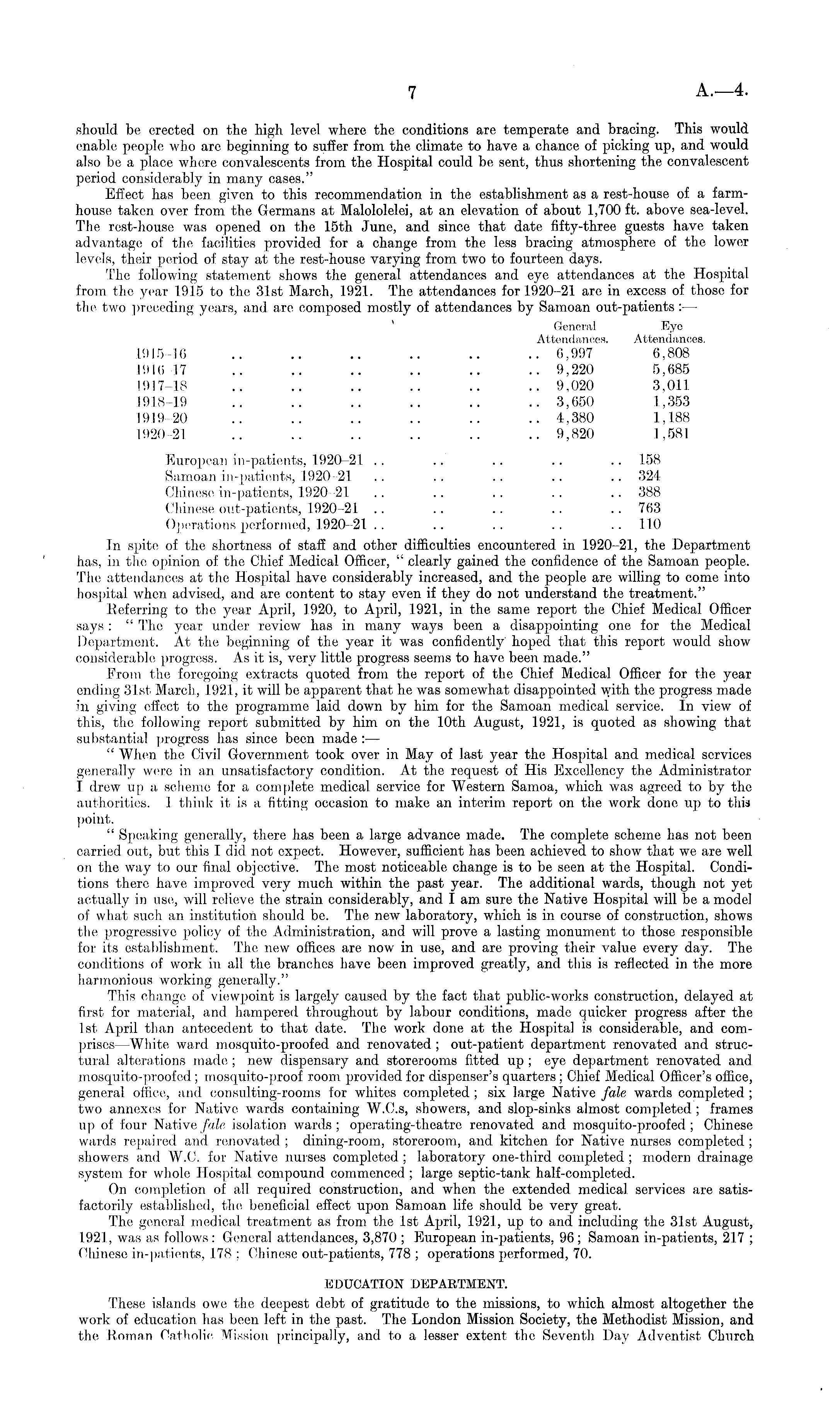 should be erected on the high, level where the conditions are temperate and. bracing. This would enable people who arc beginning to suffer from the, climate to have a chance of picking up, and would also be a place where convalescents from the Hospital could be sent, thus shortening the convalescent period considerably in many cases." Effect has been given to this recommendation in the establishment as a rest-house of a farmhouse taken over from the Germans at Malololelei, at an elevation of about 1,700 ft. above sea-level. The rest-house was opened on the 15th June, and since that date fifty-three guests have taken advantage of the facilities provided for a change from the less bracing atmosphere of the lower levels, their period of stay at the rest-house varying from two to fourteen days. The following statement shows the general attendances and eye attendances at the Hospital from the year 1915 to the 31st March, 1921. The attendances for 1920-21 aro in excess of those for the two preceding years, and are composed mostly of attendances by Samoan out-patients : — General Eye Attendances. Attendances. 1915-16 .. .. .. .. .. .. 6,997 6,808 1916-17 .. .. .. .. .. .. 9,220 5,685 1917-18 .. .. .. .. .. .. 9,020 3,011. 1918-19 .. .. .. .. .. .. 3,650 1,353 1919 20 .. .. .. .. .. .. 4,380 1,188 1920 21 .. .. .. .. .. .. 9,820 1,581 European in-patients. 1920-21 .. ..' .. .. .. 158 Samoan in-patients, 1920-21 .. .. .. .. .. 324 Chinese in-patients, 1920 21 .. .. .. .. .. 388 Chinese out-patients, 1920 -21. .. .. .. .. ..763 Operations performed, 1920-21 .. .. .. .. ..110 In spite of the shortness of staff and other difficulties encountered in 1920-21, the Department has, in the opinion of the Chief Medical Officer, " clearly gained the confidence of the Samoan people. The attendances at the Hospital have considerably increased, and the people are willing to come into hospital when advised, and are content to stay even if they do not understand the treatment." Referring to the year April, 1920, to April, 1921, in the same report the Chief Medical Officer says : " The year under review has in many ways been a disappointing one for the Medical Department. At the beginning of the year it was confidently hoped that this report would show considerable progress. As it is, very little progress seems to have been made." From the foregoing extracts quoted from the report of the Chief Medical Officer for the year ending 31st March, 1921, it will be apparent that he was somewhat disappointed with the progress made in giving effect to the programme laid down by him for the Samoan medical service, in view of this, the following report submitted by him on the 10th August, 1921, is quoted as showing that substantial progress has since been made : — " When the Civil Government took over in May of last year the Hospital and medical services gem-rally were in an unsatisfactory condition. At the request of His Excellency the Administrator I drew up a scheme for a complete medical service for Western Samoa, which was agreed to by the authorities. I think it is a fitting occasion to make an interim report on the work done up to this point. " Speaking generally, there has been a large advance made. The complete scheme has not been carried out, but this I did not expect. However, sufficient has been achieved to show that wo are well on the way to our final objective. The most noticeable change is to be seen at the Hospital. Conditions there have improved very much within the past year. The additional wards, though not yet actually in use, will relieve the strain considerably, and I am sure the Native Hospital will be a model of what such an institution should be. The new laboratory, which is in course of construction, shows the progressive policy of the Administration, and will prove a lasting monument to those responsible for its establishment. The new offices are now in use, and are proving their value every day. The conditions of work in all the branches have been improved greatly, and this is reflected in the more harmonious working generally." This change of viewpoint is largely caused by the fact that public-works construction, delayed at first for material, and. hampered throughout by labour conditions, made quicker progress after the Ist April than antecedent to that date. The work done at the Hospital is considerable, and comprises—White ward mosquito-proofed and renovated ; out-patient department renovated and structural alterations made ; new dispensary and storerooms fitted, up ; eye department renovated and mosquito-proofed ; mosquito-proof room provided for dispenser's quarters ; Chief Medical Officer's office, general office, and consulting-rooms for whites completed ; six large Native fale wards completed ; two annexes for Native wards containing W.C.s, showers, and slop-sinks almost completed ; frames up of four Native fale isolation wards ; operating-theatre renovated and mosquito-proofed ; Chinese wards repaired and renovated ; dining-room, storeroom, and kitchen for Native nurses completed ; showers and W.C. for Native nurses completed; laboratory one-third completed; modern drainage system for whole Hospital compound commenced ; large septic-tank half-completed. On completion of all required construction, and when the extended medical services are satisfactorily established, the beneficial effect upon Samoan life should be very great. The general medical treatment as from the Ist April, 1921, up to and including the 31st August, 1921, was as follows: General attendances, 3,870 ; European in-patients, 96; Samoan in-patients, 217 ; Chinese in-patients, 178 ; Chinese out-patients, 778 ; operations performed, 70. E DUOATION DEPARTMENT. These islands owe the deepest debt of gratitude to the missions, to which almost altogether the work of education has been left in the past. The London Mission Society, the Methodist Mission, and the Roman Catholic Mission principally, and to a lesser extent the 