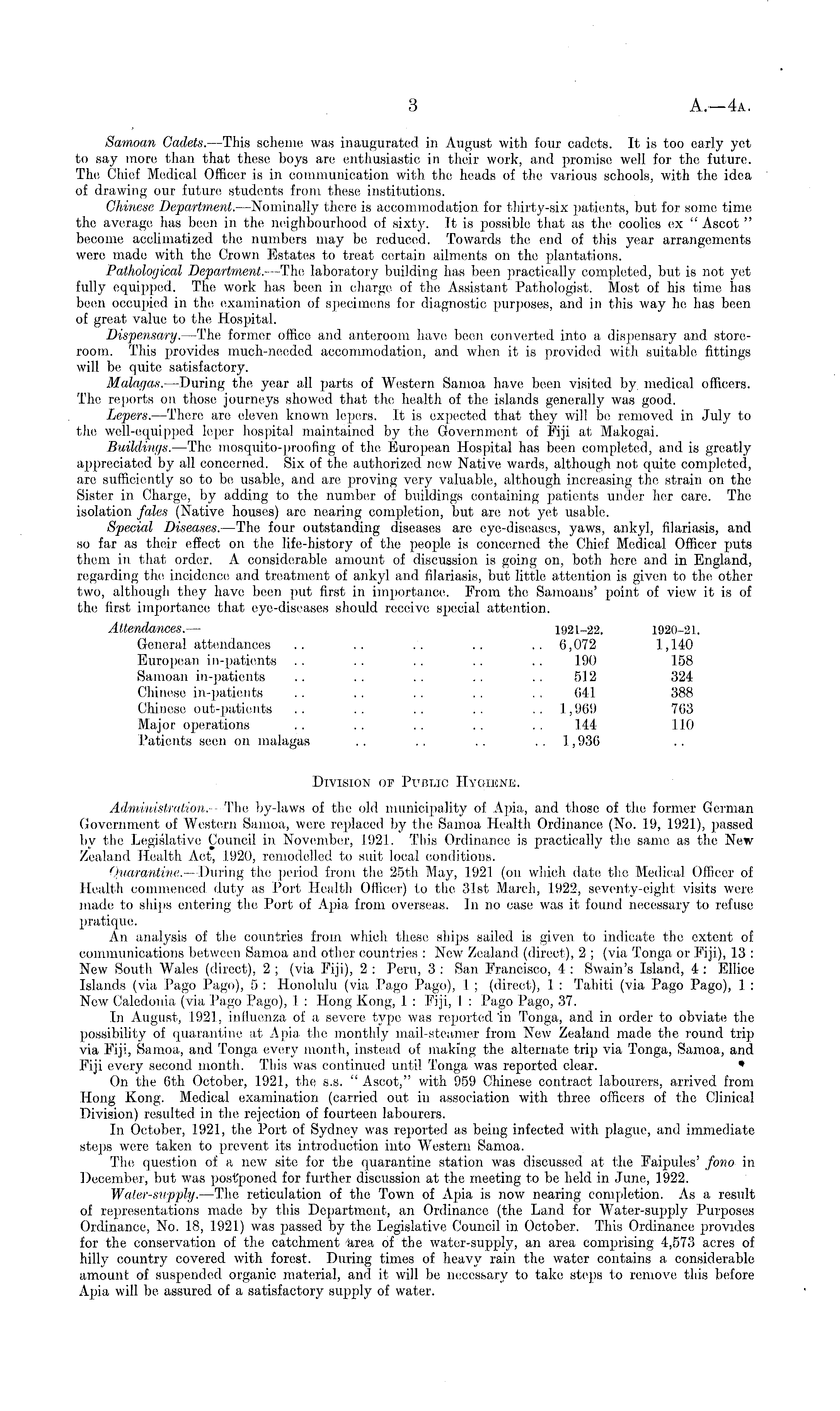 Samoan Cadets. —This scheme was inaugurated in August with four cadets. It is too early yet to say more than that these boys are enthusiastic in their work, and promise well for the future. The Chief Medical Officer is in communication with the heads of the various schools, with the idea of drawing our future students from these institutions. Chinese Department. —Nominally there is accommodation for thirty-six patients, but for some time tho average has been in the neighbourhood of sixty. Tt is possible that as the coolies ex " Ascot " become acclimatized the numbers may be reduced. Towards the end of this year arrangements were made with the Crown Estates to treat certain ailments on tho plantations. Pathological Department. —Tho laboratory building has been practically completed, but is not yet fully equipped. The work has been in charge of the Assistant Pathologist. Most of his time has been occupied in the examination of specimens for diagnostic purposes, and in this way he has been of great value to the Hospital. Dispensary. —The former office and anteroom have been converted into a dispensary and storeroom. This provides much-needed accommodation, and. when it is provided with suitable fittings will be quite satisfactory. Malagas. —During the year all parts of Western Samoa have been visited by. medical officers. The reports on those journeys showed that the health of tho islands generally was good. Lepers. —There are eleven known, lepers. It is expected that they will be removed in July to the well-equipped leper hospital maintained by the Government, of Fiji at Makogai. Buildings. —The mosquito-proofing of the European Hospital has been completed, and is greatly appreciated by all concerned. Six of the authorized new Native wards, although not quite completed, are sufficiently so to be usable, and are proving very valuable, although increasing the strain on the Sister in Charge, by adding to the number of buildings containing patients under her care. Tho isolation fales (Native houses) are nearing completion, but are not yet usable. Specietl Diseases. —The four outstanding diseases aro eye-diseases, yaws, ankyl, filariasis, and so far as their effect on the life-history of the people is concerned the Chief Medical Officer puts them in that order. A considerable amount of discussion is going on, both here and in England, regarding tho incidence and treatment of ankyl and filariasis, but little attention is given to the other two, although they have been put first in importance. From the Sainoans' point of view it is of the first importance that eye-diseases should receive special attention. Attendances. — 1921-22. 1920-21. General attendances .. .. .'. .. .. 6,072 1,140 European in-patients . . . . .. .. .. 190 158 Samoan in-patients .. .. .. .. .. 512 324 Chinese in-patients . . . . . . . . . , 641 388 Chinese out-patients .. .. .. .. .. 1,969 763 Major operations . . . . .. .. . . 144 110 Patients seen on malagas . . . . . . . . 1,936 Division of Public Hygiene. Administration. —The by-laws of the old municipality of Apia, and those of the former German Government of Western Samoa, were replaced by the Samoa Health Ordinance (No. 19, 1921), passed by the Legislative Council in November, 1921. This Ordinance is practically the same as the New Zealand Health Act, 1920, remodelled to suit local conditions. Quarantine, —During the period from the 25th May, 1921 (on which date the Medical Officer of Health commenced duty as Port Health Officer) to the 31st March, 1922, seventy-eight visits were made to ships entering the Port of Apia from overseas. In no case was it found necessary to refuse pratique. An analysis of the countries from which those ships sailed is given to indicate the extent of communications betweeu Samoa and other countries : New Zealand (direct), 2 ; (via Tonga or Fiji), 13 : New South Wales (direct), 2 ; (via Fiji), 2 : Peru, 3 : San Francisco, 4 : Swain's Island, 4 : Ellice Islands (via Pago Pago), 5 : Honolulu (via Pago Pago), 1 ; (direct), 1 : Tahiti (via Pago Pago), 1 : New Caledonia (via Pago Pago), I. : Hong Kong, 1 : Fiji, I : Pago Pago, 37. In August, 1921, influenza of a severe type was reported in Tonga, and in order to obviate the possibility of quarantine at Apia, the monthly mail-steamer from New Zealand made the round trip via Fiji, Samoa, and Tonga every month, instead of making the alternate trip via Tonga, Samoa, and Fiji every second month. This was continued until Tonga was reported clear. On the 6th October, 1921, the s.s. "Ascot," with 959 Chinese contract labourers, arrived from Hong Kong. Medical examination (carried out in association with three officers of the Clinical Division) resulted in the rejection of fourteen labourers. In October, 1921, the Port of Sydney was reported as being infected with plague, and immediate steps were taken to prevent its introduction into Western Samoa. The question of a new site for the quarantine station was discussed at the Faipulcs' fono in December, but was postponed for further discussion at the meeting to be held in June, 1922. Water-supply. —The reticulation of the Town of Apia is now nearing completion. As a result of representations made by this Department, an Ordinance (the Land for Water-supply Purposes Ordinance, No. 18, 1921) was passed by the Legislative Council in October. This Ordinance provides for the conservation of the catchment 'area of the water-supply, an area comprising 4,573 acres of hilly country covered with forest. During times of heavy rain the water contains a considerable amount of suspended organic material, and it will be necessary to take steps to remove this before Apia will be, assured of a satisfactory supply of water.