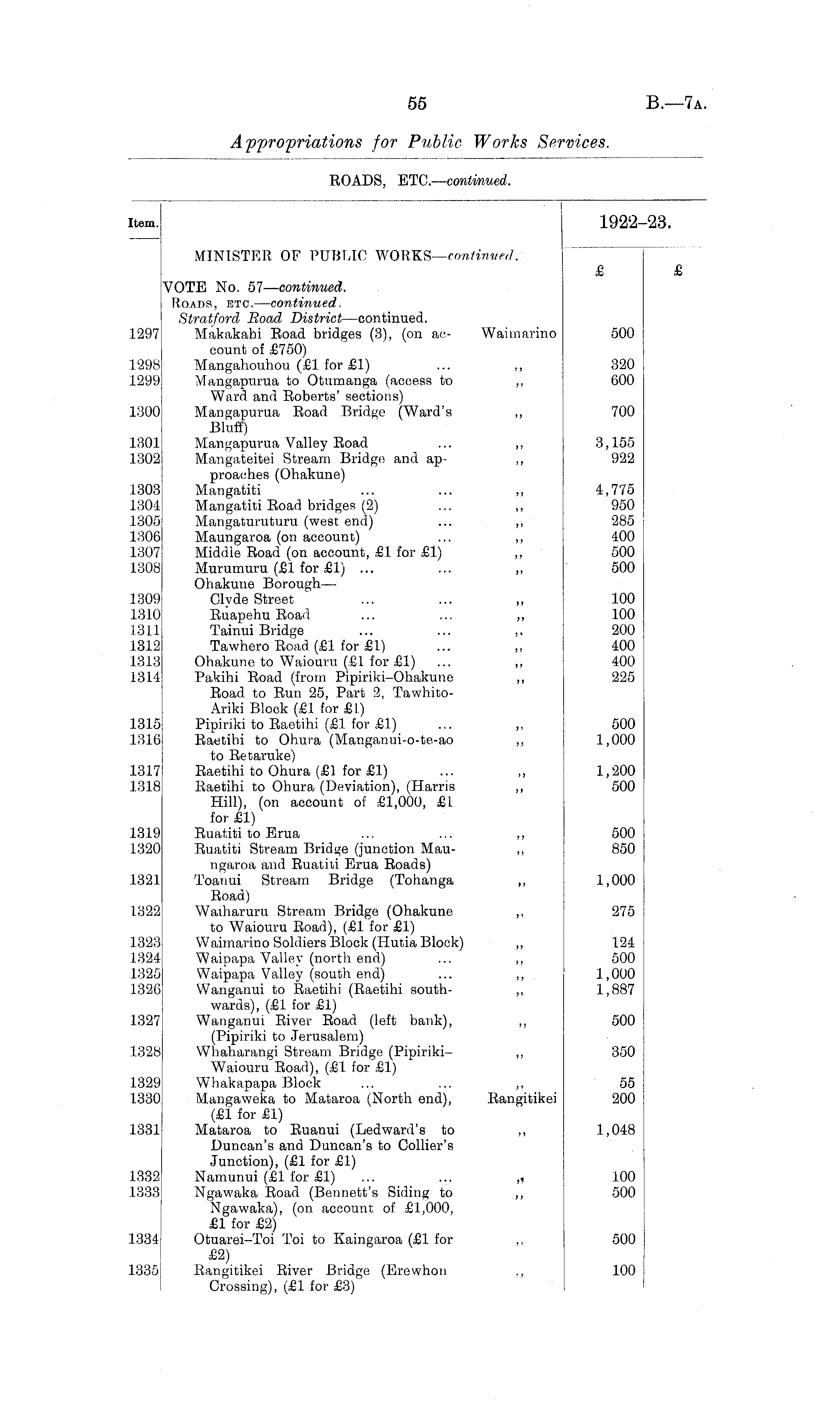 item. 1922-23. MINISTER OF PUBLIC WORKS— continued. VOTE No. 57— continued. Roads, etc — continued. Stratford Boad District —continued. Makakahi Road bridges (3), (on ac- Waimarino count of £750) Mangahouhou (£1 for £1) ... ,, Mangapurua to Otumanga (access to ,, Ward and Roberts' sections) Mangapurua Boad Bridge (Ward's ,, Bluff) Mangapurua Valley Road ... ,, Mangateitei Stream Bridge and ap- ,, proaches (Ohakune) Mangatiti ... ... ,, Mangatiti Road bridges (2) ... ,, Mangaturuturu (west end) ... ,, Maungaroa (on account) ... ,, Middle Road (on account, £1 for £1) ,, Murumuru (£1 for £1) ... ... ,, Ohakune Borough.— Clyde Street ... ... ,, Ruapehu Road ... ... ,, Tainui Bridge ... ... ,, Tawhero Road (£1 for £1) Ohakune to Waiouru (£1 for £1) ... ,, Pakihi Road (from Pipiriki-Ohakune ,, Road to Bun 25, Part 2, TawhitoAriki Block (£1 for £1) Pipiriki to Raetihi (£1 for £1) ... ,, Raetihi to Ohura (Manganui-o-te-ao ,, to Retaruke) Raetihi to Ohura (£1 for £1) Baetihi to Ohura (Deviation), (Harris ,, Hill), (on account of £1,000, £i for £1) Ruatiti to Erua ... ... ,, Ruatiti Stream Bridge (junction Mau- ,, ngaroa and Ruatiti Erua Roads) Toanui Stream Bridge (Tohanga ,, Road) Waiharuru Stream Bridge (Ohakune ,, to Waiouru Road), (£1 for £1) Waimarino Soldiers X31ock (Hutia Block) ,, Waipapa Valley (north end) ... ,, Waipapa Valley (south end) ... ,, Wanganui to Raetihi (Baetihi south- ,, wards), (£1 for £1) Wanganui Biver Road (left bank), ,, (Pipiriki to Jerusalem) Whaharangi Stream Bridge (Pipiriki- ,, Waiouru Road), (£1 for £1) Whakapapa Block ... ... ,, Manga weka to Mataroa (North end), Rangitikei (£l for £1) Mataroa to Ruanui (Ledward's to ,, Duncan's and Duncan's to Collier's Junction), (£1 for £1) Namunui (£1 for £1) Ngawaka Road (Bennett's Siding to ,, Ngawaka), (on account of £1,000, £1 for £2) Otuarei-Toi Toi to Kaingaroa (£1 for ,, £2) Bangitikei Biver Bridge (Erewhon Crossing), (£1 for £3) £ 500 1297 1298 1299 320 600 1300 700 1301 1302 3,155 922 1303 1304 1305 1306 1307 1308 4,775 950 285 400 500 500 1309 1310 1311 1312 1313 1314 100 100 200 400 400 225 1315 1316 500 1,000 1317 1318 1,200 500 1319 1320 500 850 1321 1,000 1322 275 1323 1324 1325 1326 124 500 1,000 1,887 1327 500 1328 350 1329 1330 55 200 1331 1,048 1332 1333 100 500 .334 500 .335 100