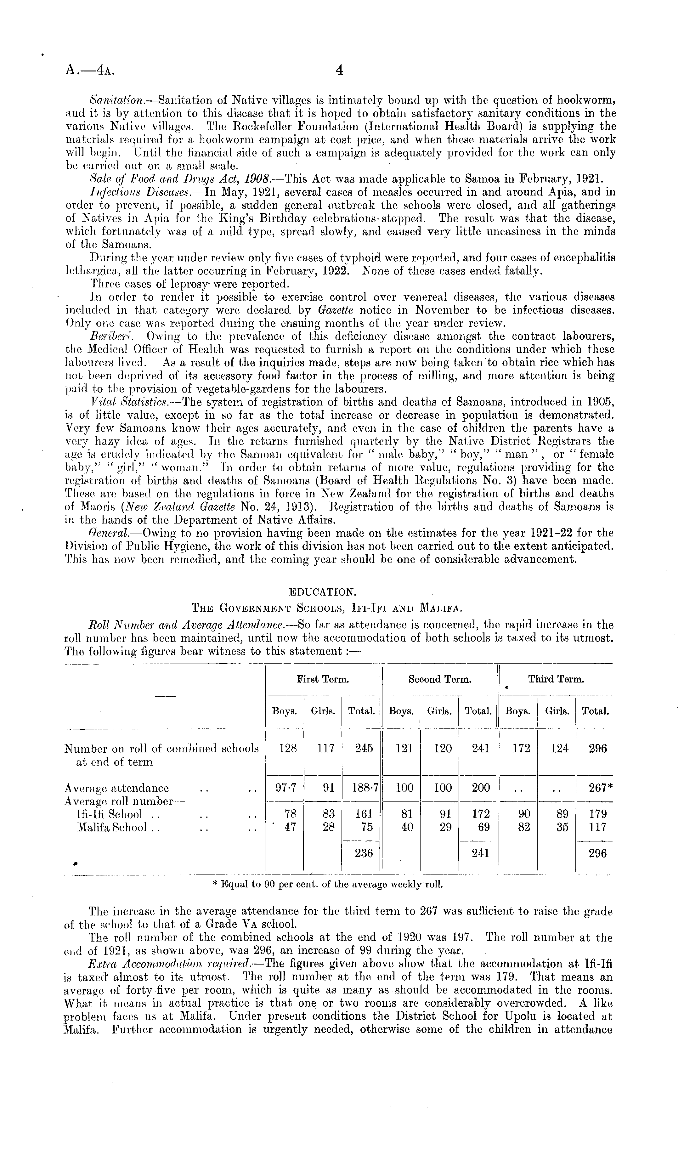 Sanitation. —Sanitation of Native villages is intimately bound up with the question, of hookworm, and it is by attention to this disease that it is hoped to obtain satisfactory sanitary conditions in the various Native villages. The Rockefeller Foundation (International Health Board) is supplying the materials required for a hookworm campaign at cost price, and when these materials arrive the work will begin. Until the financial side of such, a campaign is adequately provided for the work can only be carried out on a small scale. Sale of Food and Drugs Act, 1908. —This Act was made applicable to Samoa in February, 1921. Infectious Diseases. —In May, 1921, several cases of measles occurred in and around Apia, and in order to prevent, if possible, a sudden general outbreak the schools were closed, and all gatherings of Natives in Apia for the King's Birthday celebrations-stopped. The result was that the disease, which, fortunately was of a mild, type, spread slowly, and caused very little uneasiness in the minds of the Samoans. During the year under review only five cases of typhoid, were reported, and four cases of encephalitis lethargica, all the latter occurring in February, 1922. None of these cases ended fatally. Throe cases of leprosy-were reported. In order to render it possible to exercise control over venereal diseases, the various diseases included in that category were declared by Gazette notice in November to be infectious diseases. Only one case was reported during the ensuing months of the year under review. Beriberi. —Owing to the prevalence, of this deficiency disease amongst the contract labourers, the Medical Officer of Health was requested to furnish a report, on the conditions under which these labourers lived. As a result of the inquiries made, steps aro now being taken "to obtain, rice which has not been deprived of its accessory food factor in the process of milling, and more attention is being paid to the provision of vegetable-gardens for the labourers. Vital Statistics. —The system of registration of births and deaths of Samoans, introduced in 1905, is of little value, except in so far as the total increase or decrease in population is demonstrated. Very few Samoans know their ages accurately, and even in the case of children the parents have a very hazy idea of ages. In the returns furnished quarterly by the Native District Registrars the age is crudely indicated by tho Samoan equivalent for " male baby," " boy," " man " ; or " female baby," " girl," " woman." In order to obtain returns of more value, regulations providing for the registration of births and deaths of Samoans (Board of Health Regulations No. 3) have been made. These aro based on the regulations in force in New Zealand for the registration of births and deaths of Maoris (New Zealand Gazette No. 24, 1.91.3). Registration of the births and deaths of Samoans is in the hands of the Department of Native Affairs. General. —Owing to no provision having been made on the estimates for the year 1921 22 for the Division of Public Hygiene, the work of this division has not been carried out to the extent anticipated. 'Ihis has now been remedied, and the coming year should be one of considerable advancement. EDUCATION. The Government Schools, Ifi-Ifi and Malifa. Roll Number and Average Attendance. —So far as attendance is concerned, the rapid increase in the roll number has been maintained, until now the accommodation of both schools is taxed to its utmost. The following figures bear witness to this statement: —