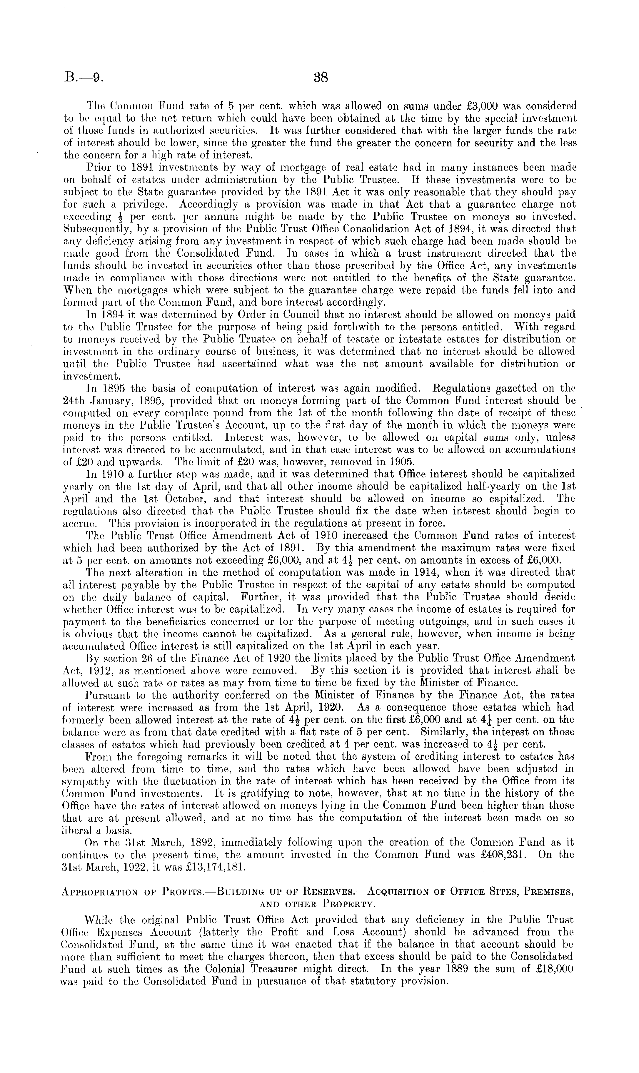 The Common Fund rate of 5 per cent, which was allowed on sums under £3,000 was considered to be equal to the net return which could have been obtained at the time by the special investment of those funds in authorized securities. It was further considered that with the larger funds the rate of interest should be lower, since the greater the fund the greater the concern for security and the less the concern for a high rate of interest. Prior to 189.1. investments by way of mortgage of real estate had in many instances been made; on behalf of estates under administration by the Public Trustee. If these investments were to be subject to the State guarantee provided by the 1891 Act it was only reasonable that they should pay for such a privilege. Accordingly a provision was made in that Act that a guarantee charge not exceeding | per cent, per annum might be made by the Public Trustee on moneys so invested. Subsequently, by a provision of the Public Trust Office Consolidation Act of 1894, it was directed that any deficiency arising from any investment in respect of which such charge had been made should be made good from the Consolidated Fund. In cases in which a trust instrument directed that the funds should be invested in securities other than those prescribed by the Office Act, any investments made in compliance with those directions were not entitled to the benefits of the State guarantee. When the mortgages which were subject to the guarantee charge were repaid the funds fell into and formed part of the Common Fund, and bore interest accordingly. In 1894 it was determined by Order in Council that no interest should be allowed on moneys paid to the Public Trustee for the purpose of being paid forthwith to the persons entitled. With, regard to moneys received by the Public Trustee on behalf of testate or intestate estates for distribution or investment in the ordinary course of business, it was determined that no interest should be allowed until the Public Trustee had ascertained what was the net amount available for distribution or investment. In 1895 the basis of computation of interest was again modified. Regulations gazetted on the 24th January, 1895, provided that on moneys forming part of the Common Fund interest should be computed on every complete pound from the Ist of the month following the date of receipt of these moneys in the Public Trustee's Account, up to the first day of the month in which the moneys were paid to the persons entitled. Interest was, however, to be allowed on capital sums only, unless interest was directed to be accumulated, and in that case interest was to be allowed on accumulations of £20 and upwards. The limit of £20 was, however, removed in 1905. In 1.910 a further step was made, and it was determined that Office interest should be capitalized yearly on the Ist day of April, and that all other income should be capitalized half-yearly on the Ist April and the Ist October, and that interest should be allowed on income so capitalized. The regulations also directed that the Public Trustee should fix the date when interest should begin to accrue. This provision is incorporated in the regulations at present in force. The Public Trust Office Amendment Act of 1910 increased the Common Fund rates of interest which had been authorized by the Act of 1891. By this amendment the maximum rates were fixed at 5 per cent, on amounts not exceeding £6,000, and at 4-| per cent, on amounts in excess of £6,000. The next alteration in the method of computation was made in 1914, when it was directed that all interest payable by the Public Trustee in respect of the capital of any estate should bo computed on the daily balance of capital. Further, it was provided that the Public Trustee should decide whether Office interest was to be capitalized. In very many cases the income of estates is required for payment to the beneficiaries concerned or for the purpose of meeting outgoings, and in such cases it is obvious that the income cannot be capitalized. As a general rule, however, when income is being accumulated Office interest is still capitalized on the Ist April in each year. By section 26 of the Finance Act of 1920 the limits placed by the Public Trust Office Amendment Act, 1912, as mentioned above were removed. By this section it is provided that interest shall be allowed at such rate or rates as may from time to time be fixed by the Minister of Finance. Pursuant to the authority conferred on the Minister of Finance by the Finance Act, the rates of interest were increased as from the Ist April, 1920. As a consequence those estates which had formerly been allowed interest at the rate of 4J per cent, on the first £6,000 and at 4J per cent, on the balance were as from that date credited with a flat rate of 5 per cent. Similarly, the interest on those classes of estates which had previously been credited at 4 per cent, was increased to 4 } per cent. From the foregoing remarks it will be noted that the system of crediting interest to estates has been altered from time to time, and the rates which have been allowed have been adjusted in sympathy with the fluctuation in the rate of interest which has been received by the Office from its Common Fund investments. It is gratifying to note, however, that at no time in the history of the Office have the rates of interest allowed on moneys lying in the Common Fund been higher than those that are at present allowed, and at no time has the computation of the interest been made on so liberal a basis. On the 31st March, 1892, immediately following upon the creation, of the Common Fund as it continues to the present time, the amount invested in the Common Fund was £408,231. On the 31st March, 1922, it was £13,174,181. Appropriation of Promts. —Building up of Reserves. —Acquisition of Office Sites, Premises, and other property. While the original Public Trust Office Act provided that any deficiency in the Public Trust Office Expens