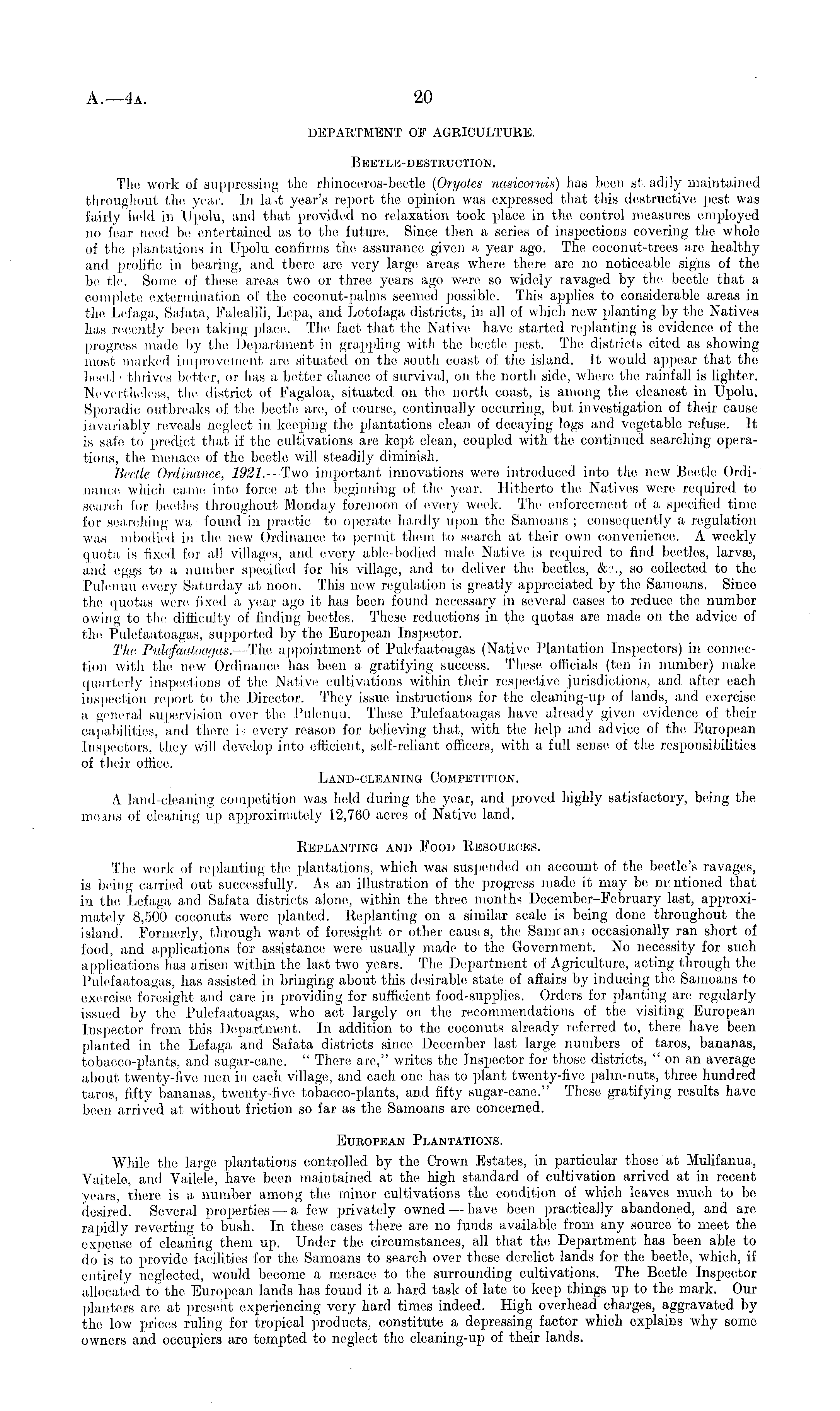DEPARTMENT OF AGRICULTURE. Beetle-destruct I ON. The work of suppressing the rhinoceros-beetle (Oryotcs nasieornis) has been st. adily maintained throughout the year. In last year's report the opinion was expressed that this destructive pest was fairly held in Upolu, and that provided no relaxation took place in the control measures employed no fear need be entertained as to the future. Since then a series of inspections covering the whole of the plantations in Upolu confirms the assurance given a year ago. The coconut-trees are healthy and prolific in bearing, and there are very large areas where there are no noticeable signs of the be tie. Some of these areas two or three years ago were so widely ravaged by the beetle that a complete extermination of the coconut-palms seemed possible. This applies to considerable areas in the Lefaga, Safata, Falealili, Lepa, and Lotofaga districts, in all of which new planting by the Natives has recently been taking place. The fact that the Native have started replanting is evidence of the progress made by the Department in grappling with the beetle pest. The districts cited as showing must marked improvement an' situated (in the south coast of the island. It would appear that, the beet! ' thrives better, or has a better chance of survival, on the north side, where the rainfall is lighter. Nevertheless, the district of Fagaloa, situated on the north coast, is among the cleanest in Upolu. Sporadic outbreaks of the beetle are, of course, continually occurring, but investigation of their cause invariably reveals neglect in keeping the plantations clean of decaying logs and vegetable refuse. It is safe to predict that if the cultivations are kept clean, coupled with the continued searching operations, the menace of the beetle will steadily diminish. Hectic Ordinance, 1921 — Two important innovations were introduced into the new Beetle Ordinance which came into force at the beginning of the year. Hitherto the Natives were required to search for beetles throughout Monday forenoon of every week. The enforcement, of a specified time for .searching wa found in practic, to operate hardly upon the Samoans ; consequently a regulation was mbodied in the new Ordinance to permit them to search at their own convenience. A weekly quota is fixed for all villages, and every able-bodied male Native is required to find beetles, larvae, and eggs to a number specified for his village, and to deliver the beetles, &:•., so collected to the Pulenuu every Saturday at noon. This new regulation is greatly appreciated by the Samoans. Since the quotas were fixed a year ago it has been found necessary in several cases to reduce the number owing to the difficulty of finding beetles. These reductions in the quotas are made on the advice of the Pulefaatoagas, supported by the European Inspector. The Pulefaatoagas. —The appointment of Pulefaatoagas (Native Plantation Inspectors) in connection with the new Ordinance has been a gratifying success. These officials (ten in number) make quarterly inspections of the Native cultivations within their respective jurisdictions, and after each ins]lection report to the Director. They issue instructions for the cleaning-up of lands, and exercise a general supervision over the Pulenuu. These Pulefaatoagas have already given evidence of their capabilities, and there i-; every reason for believing that, with the help and advice of the European Inspectors, they will develop into efficient, self-reliant officers, with a full sense of the responsibilities of their office. Land-cleaning Competition. A land-cleaning competition was held during the year, and proved highly satisfactory, being the moans of cleaning up approximately 12,760 acres of Native land. Replanting and Food Resources. The work of replanting the plantations, which was suspended on account of the beetle's ravages, is being carried out successfully. As an illustration of the progress made it may be mt ntioned that in the Lefaga and Safata districts alone, within the three months December-February last, approximately 8,500 coconuts were planted. Replanting on a similar scale is being done throughout the island. Formerly, through want of foresight or other causi s, the Same an; occasionally ran short of food, and applications for assistance were usually made to the Government. No necessity for such applications has arisen within the last two years. The Department of Agriculture, acting through the Pulefaatoagas, has assisted in bringing about this desirable state of affairs by inducing the, Samoans to exercise foresight and care in providing for sufficient food-supplies. Orders for planting are regularly issued by the Pulefaatoagas, who act largely on the recommendations of the visiting European Inspector from this Department. In addition to the coconuts already referred to, there have been planted in the Lefaga and Safata districts since December last large numbers of taros, bananas, tobacco-plants, and sugar-cane. " There are," writes the Inspector for those districts, "on an average about twenty-five men in each village, and each one has to plant twenty-five palm-nuts, three hundred taros, fifty bananas, twenty-five tobacco-plants, and fifty sugar-cane." These gratifying results have been arrived at without friction so far as the Samoans are concerned. European Plantations. While the large plantations controlled by the Crown Estates, in particular those at Mulifanua, Vaitele, and Vailele, have been maintained at the high standard of cultivation arrived at in recent years, there is a number among the minor cultivations the condition of which leaves much to be desired. Several properties — a few privately owned — have been practically abandoned, and are rapidly reverting to bush. In these cases there are no funds available from any source to meet the expense of cleaning them up. Under the circumstances, all that the Department has been able to do is to provide facilities for the Sa