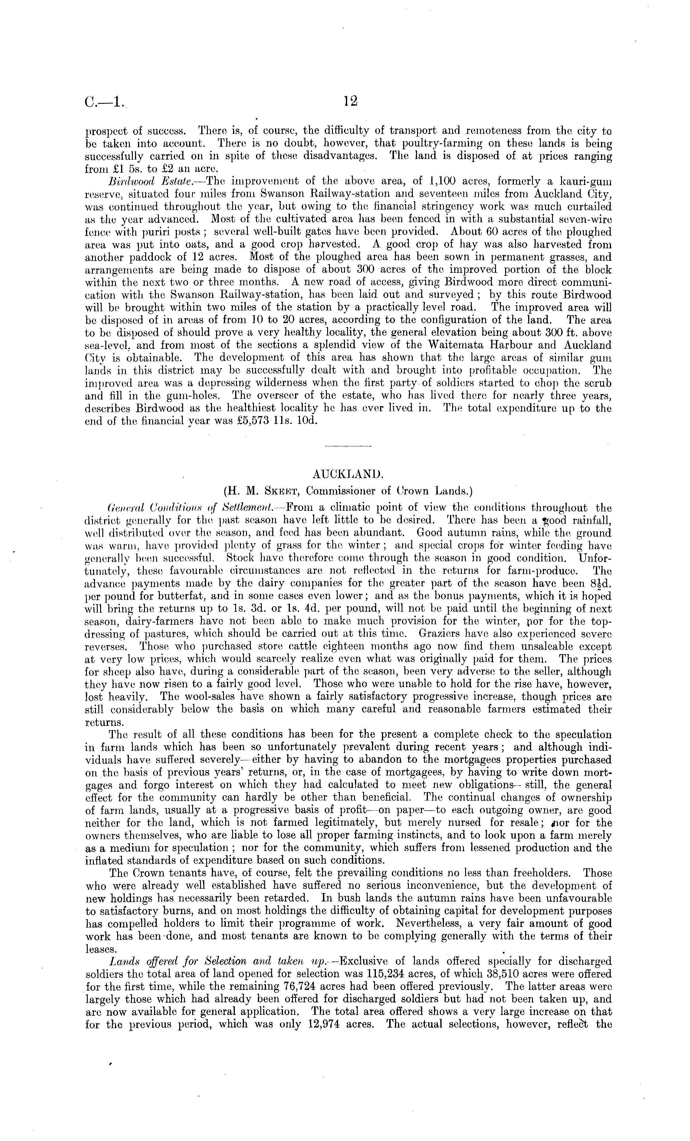 prospect of success. There is, of course, the difficulty of transport and remoteness from the city to be taken into account. There is no doubt, however, that poultry-farming on these lands is being successfully carried on in spite of these disadvantages. The land, is disposed of at prices ranging from £1 ss. to £2 an acre. Birdwood Estate. —The improvement of the above area, of 1,100 acres, formerly a kauri-gum reserve, situated four miles from Swanson Railway-station and seventeen miles from. Auckland City, was continued throughout the year, but owing to the financial stringency work was much curtailed as the year advanced. Most of the cultivated area has been fenced in with a substantial seven-wire fence with puriri posts ; several well-built gates have been provided. About 60 acres of the ploughed area was put into oats, and a good crop harvested. A good crop of hay was also harvested from another paddock of 12 acres. Most of the ploughed area has been sown in permanent grasses, and arrangements are being made to dispose of about 300 acres of the improved portion of the block within the next two or three months. A new road of access, giving Birdwood more direct communication with the Swanson Railway-station, has been laid, out and surveyed ; by this route Birdwood will be brought within two miles of the station by a practically level road. The improved area will be disposed of in areas of from 10 to 20 acres, according to the configuration of the land. The area to be disposed of should prove a very healthy locality, the general elevation being about 300 ft. above sea-level, and from most of the sections a splendid view of the Waitcmata Harbour and Auckland City is obtainable. The development of this area has shown that the large areas of similar gum lands in this district may be successfully dealt with and brought into profitable occupation. The improved area was a depressing wilderness when the first party of soldiers started to chop the scrub and fill in the gum-holes. The overseer of the estate, who has lived there for nearly three years, describes Birdwood as the healthiest locality he has ever lived in. The total expenditure up to the end of the financial year was £5,573 lis. lOd. AUCKLAND. (H. M. Skkkt, Commissioner of Crown Lands.) General Conditions of Settlement. —From a climatic point of view the conditions throughout the district generally for the past season have left little to be desired. There has been a £ood rainfall, well distributed over the season, and feed has been abundant. Good autumn rains, while flu- ground was warm, have provided plenty of grass for the, winter ; and special crops for winter feeding have generally been successful. Stock have therefore come through the season in good condition. Unfortunately, these favourable circumstances are not reflected in the, returns for farm-produce. The advance payments made by the dairy companies for the, greater part of the season have been B|d. per pound for butterfat, and in some cases even lower; and as the bonus payments, which it is hoped will bring the returns up to Is. 3d. or Is. 4d. per pound, will not be paid until the beginning of next season, dairy-farmers have not been able to make much pro vision for the winter, por for the topdressing of pastures, which should be carried out at this time. Graziers have also experienced severe reverses. Those who purchased store cattle eighteen months ago now find them unsaleable except at very low prices, which would scarcely realize even what was originally paid for them. The prices for sheep also have, during a considerable part of the season, been very adverse to the seller, although they have now risen to a fairly good level. Those, who were unable to hold for the rise have, however, lost heavily. The wool-sales have shown a fairly satisfactory progressive increase, though prices are still considerably below the basis on which many careful and reasonable farmers estimated their returns. The result of all these conditions has been for the present a complete check to the speculation in farm lands which has been so unfortunately prevalent during recent years ; and. although individuals have suffered severely- either by having to abandon to the mortgagees properties purchased on the basis of previous years' returns, or, in the case of mortgagees, by having to write down mortgages and forgo interest on which they had calculated to meet new obligations-- still, the general effect for the community can hardly be other than beneficial. The continual changes of ownership of farm lands, usually at a progressive basis of profit- -on paper —to each outgoing owner, are good neither for tho land, which is not farmed legitimately, but merely nursed for resale; inor for the owners themselves, who are liable to lose all proper farming instincts, and to look upon a farm merely as a medium for speculation ; nor for the community, which suffers from lessened production and the inflated standards of expenditure based on such conditions. The, Crown tenants have, of course, felt the prevailing conditions no less than freeholders. Those, who were, already well established have suffered no serious inconvenience, but the development of new holdings has necessarily been retarded. In bush lands the autumn rains have been unfavourable to satisfactory burns, and on most holdings the difficulty of obtaining capital for development purposes has compelled holders to limit their programme of work. Nevertheless, a very fair amount of good work has been done, and most tenants are known to be, complying generally with the terms of their leases. Lands offered for Selection and taken up. —Exclusive of lands offered specially for discharged soldiers the total area of land opened for selection was 115,234 acres, of which 38,510 acres were offered for the first time, while the remaining 76,724 acres had been offered previously. The latter areas were largely those which had already been offered for