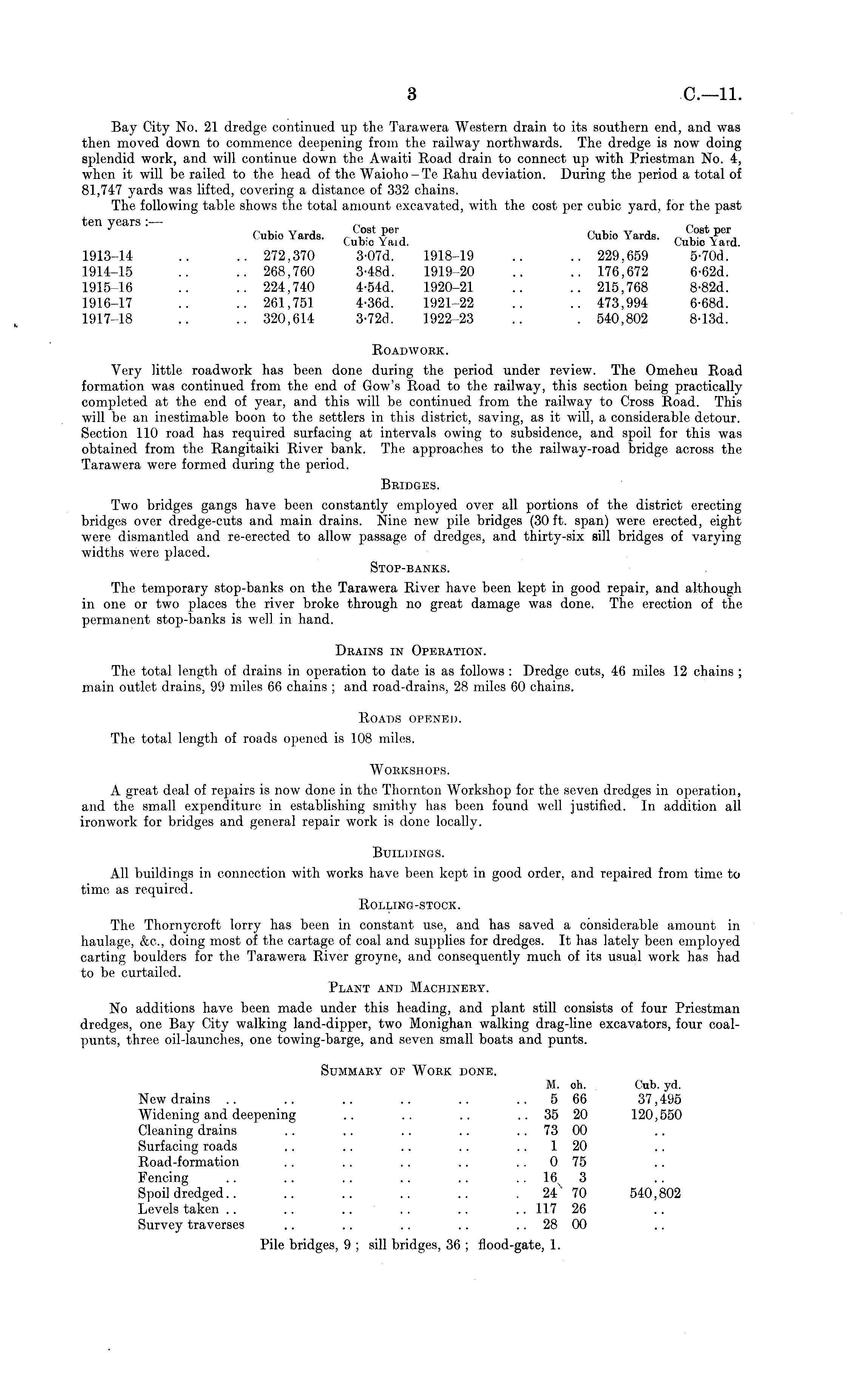Bay City No. 21 dredge continued up tho Tarawera Western drain to its southern end, and was then moved down to commence deepening from the railway northwards. The dredge is now doing splendid work, and will continue down the Awaiti Road drain to connect up with Priestman No. 4, when it will be railed to the head of the Waioho —Te Rahu deviation. During the period a total of 81,747 yards was lifted, covering a distance of 332 chains. The following table shows the total amount excavated, with the cost per cubic yard, for the past ten years:— _ . _ . Cubic Yards. J°» **?. Cubic Yards. „_£-?£", Cubic Yard. Cubic Yard. 1913-14 .. .. 272,370 3-07 d. 1918-19 .. .. 229.659 5-70 d. 1-914-15 .. .. 268,760 348 d. 1919-20 .. .. 176,672 6-62 d. 1915-16 .. .. 224,740 4-54 d. 1920-21 .. .. 215,768 8-82 d. 1916-17 .. .. 261,751 4-36 d. 1921-22 .. .. 473,994 6-68 d. 1917-18 .. .. 320,614 3-72 d. 1922-23 .. . 540,802 8-13 d. ROADWORK. Very little roadwork has been done during the period under review. The Omeheu Road formation was continued from the end of Gow's Road to the railway, this section being practically completed at the end of year, and this will be continued from the railway to Cross Road. This will be an inestimable boon to the settlers in this district, saving, as it will, a considerable detour. Section 110 road has required surfacing at intervals owing to subsidence, and spoil for this was obtained from the Rangitaiki River bank. The approaches to the railway-road bridge across the Tarawera were formed during the period. Bridges. Two bridges gangs have been constantly employed over all portions of the district erecting bridges over dredge-cuts and main drains. Nine new pile bridges (30 ft. span) were erected, eight were dismantled and re-erected to allow passage of dredges, and thirty-six sill bridges of varying widths were placed. Stop-banks. The temporary stop-banks on the Tarawera River have been kept in good repair, and although in one or two places the river broke through no great damage was done. The erection of the permanent stop-banks is well in hand. Drains in Operation. The total length of drains in operation to date is as follows : Dredge cuts, 46 miles 12 chains ; main outlet drains, 99 miles 66 chains ; and road-drains, 28 miles 60 chains. Roads opened. The total length of roads opened is 108 miles. Workshops. A great deal of repairs is now done in the Thornton Workshop for the seven dredges in operation, and the small expenditure in establishing smithy has been found well justified. In addition all ironwork for bridges and general repair work is done locally. Buildings. All buildings in connection with works have been kept in good order, and repaired from time to time as required. Rolling-stock. The Thornycroft lorry has been in constant use, and has saved a considerable amount in haulage, &c, doing most of the. cartage of coal and supplies for dredges. It has lately been employed carting boulders for the Tarawera River groyne, and consequently much of its usual work has had to be curtailed. Plant and Machinery. No additions have been made under this heading, and plant still consists of four Priestman dredges, one Bay City walking land-dipper, two Monighan walking drag-line excavators, four coalpunts, three oil-launches, one towing-barge, and seven small boats and punts. Summary of Work done. M. oh. Cub. yd. New drains .. .. .. .. .. 5 66 37,495 Widening and deepening .. .. .. 35 20 120,550 Cleaning drains .. .. .. .. .. 73 00 Surfacing roads .. .. .. . . 1 20 Road-formation . . . . . . .. 0 75 Fencing .. .. .. .. . . 16 3 Spoil dredged.. .. .. .. .. . 24 X 70 540,802 Levels taken .. .. .. . . .. .. 117 26 Survey traverses .. .. . . .. 28 00 Pile bridges, 9 ; sill bridges, 36 ; flood-gate, 1.