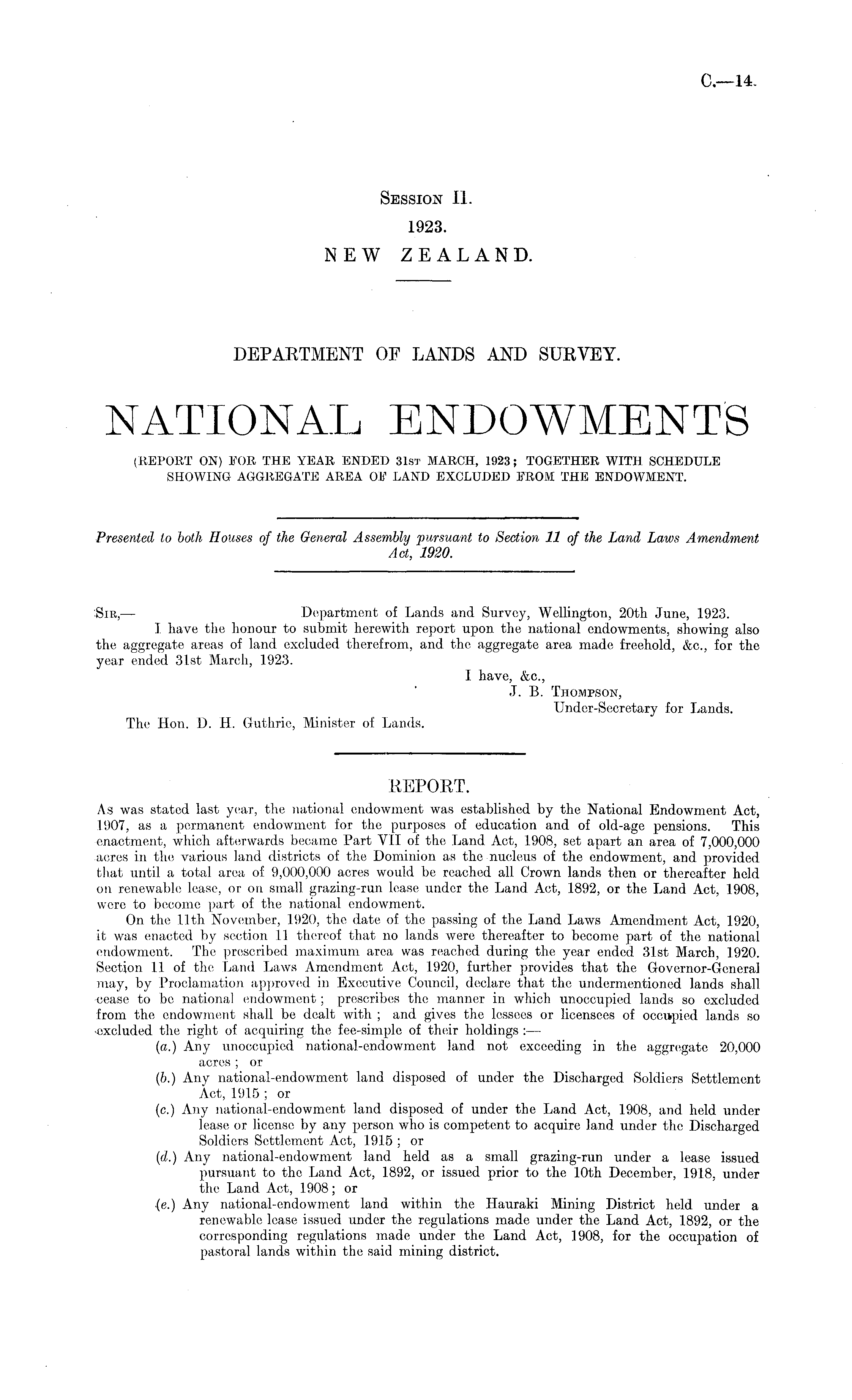 DEPARTMENT OF LANDS AND SURVEY. NATIONAL ENDOWMENTS (REPORT ON) FOR THE YEAR ENDED 31st MARCH, 1923; TOGETHER WITH SCHEDULE SHOWING AGGREGATE AREA OF LAND EXCLUDED FROM THE ENDOWMENT.