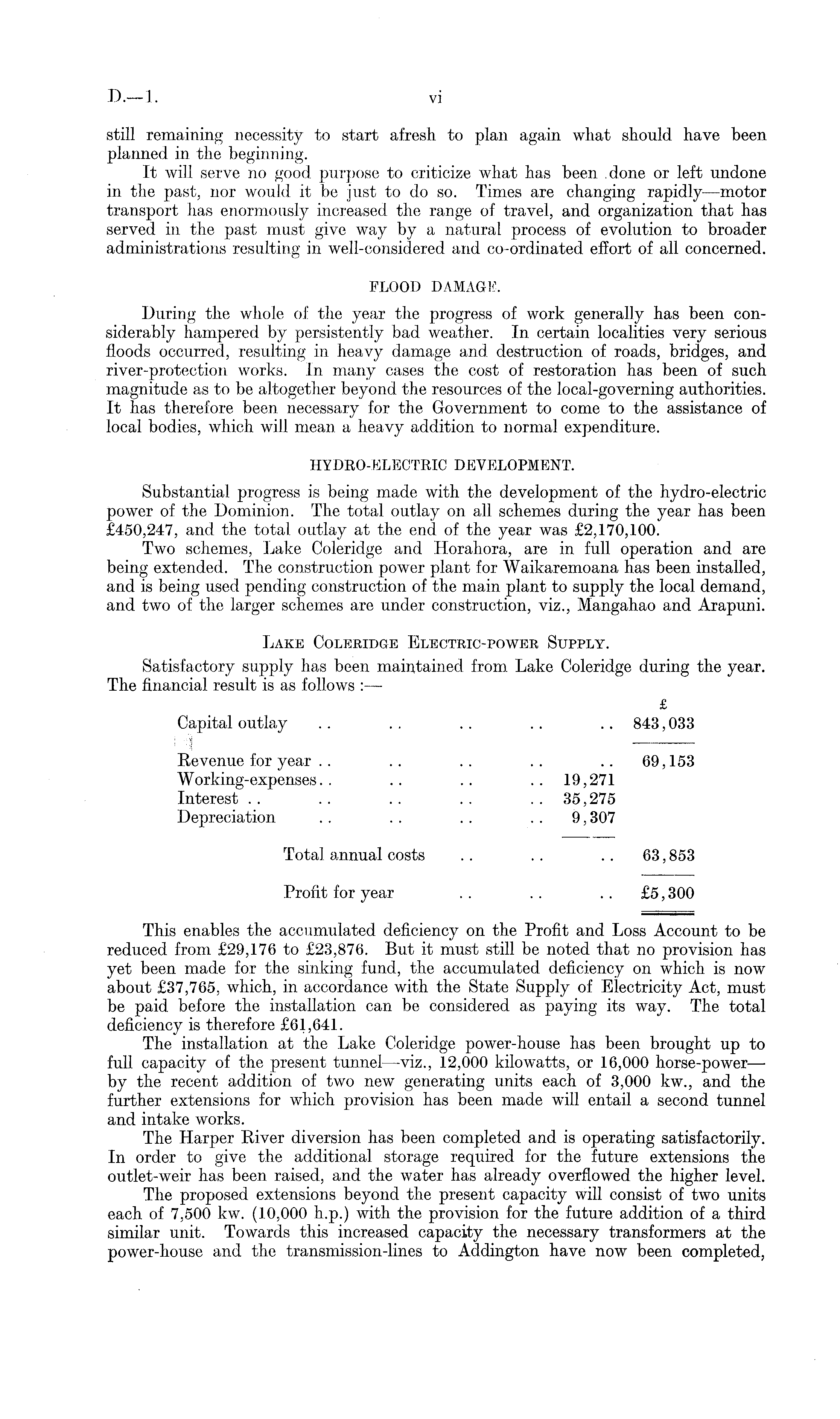 still remaining necessity to start afresh to plan again what should have been planned in the beginning. It will serve no good purpose to criticize what has been, .done or left undone in the past, nor would it be just to do so. Times are changing rapidly —motor transport has enormously increased the range of travel, and organization that has served in the past must give way by a natural process of evolution to broader administrations resulting in well-considered and co-ordinated effort of all concerned. FLOOD DAMAGE. During the whole of the year the progress of work generally has been considerably hampered by persistently bad weather. In certain localities very serious floods occurred, resulting in heavy damage and destruction of roads, bridges, and river-protection works. In many cases the cost of restoration has been of such magnitude as to be altogether beyond the resources of the local-governing authorities. It has therefore been necessary for the Government to come to the assistance of local bodies, which will mean a heavy addition to normal expenditure. HYDRO-ELECTRIC DEVELOPMENT. Substantial progress is being made with the development of the hydro-electric power of the Dominion. The total outlay on all schemes during the year has been £450,247, and the total outlay at the end of the year was £2,170,100. Two schemes, Lake Coleridge and Horahora, are in full operation and are being extended. The construction power plant for Waikaremoana has been installed, and is being used pending construction of the main plant to supply the local demand, and two of the larger schemes are under construction, viz., Mangahao and Arapuni. Lake Coleridge Electric-power Supply. Satisfactory supply has been maintained from. Lake Coleridge during the year. The financial result is as follows :— £ Capital outlay . . . . . . . . . . 843,033 Revenue for year . . .. . . .. .. 69,153 Working-expenses. . . . . . .. 19,271 Interest . . . . . . . . .. 35,275 Depreciation .. . . . . . . 9,307 Total annual costs . . . . . . 63,853 Profit for year .. .. .. £5,300 This enables the accumulated deficiency on the Profit and Loss Account to be reduced from £29,176 to £23,876. But it must still be noted that no provision has yet been made for the sinking fund, the accumulated deficiency on which is now about £37,765, which, in accordance with the State Supply of Electricity Act, must be paid before the installation can be considered as paying its way. The total deficiency is therefore £61,641. The installation at the Lake Coleridge power-house has been brought up to full capacity of the present tunnel —viz., 12,000 kilowatts, or 16,000 horse-power— by the recent addition of two new generating units each of 3,000 kw., and the further extensions for which provision has been made will entail a second tunnel and intake works. The Harper River diversion has been completed and is operating satisfactorily. In order to give the additional storage required for the future extensions the outlet-weir has been raised, and the water has already overflowed the higher level. The proposed extensions beyond the present capacity will consist of two units each of 7,500 kw. (10,000 h.p.) with the provision for the future addition of a third similar unit. Towards this increased capacity the necessary transformers at the power-house and the transmission-lines to Addington have now been completed,
