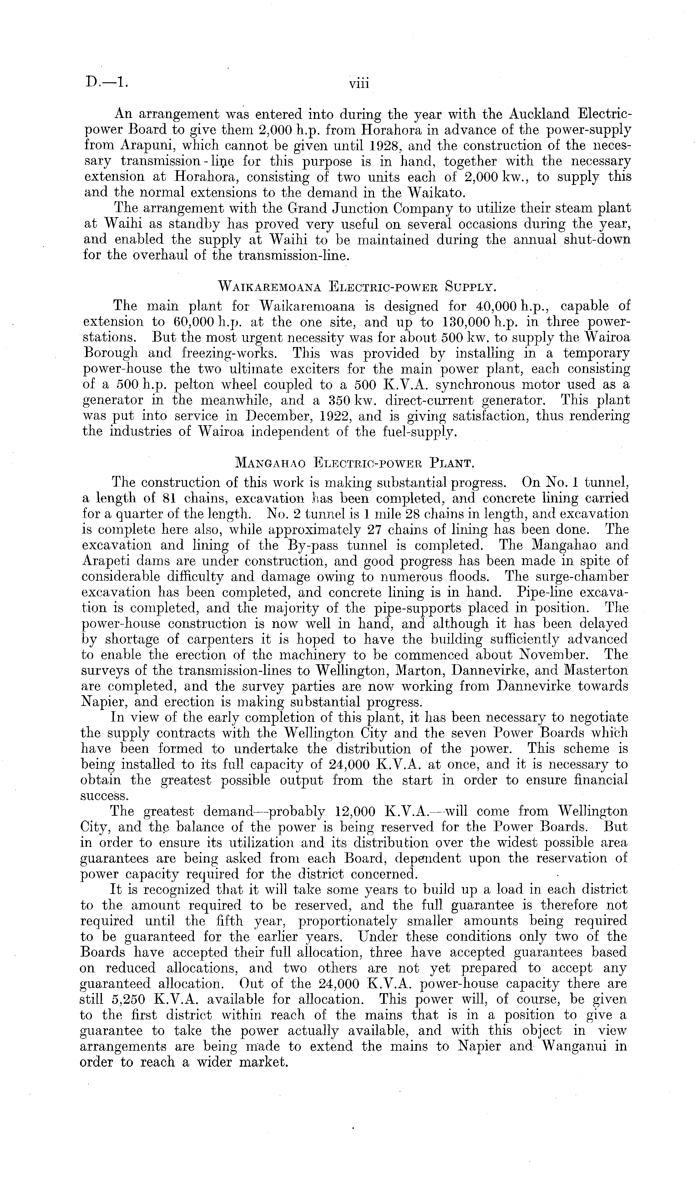 An arrangement was entered into during the year with the Auckland Electricpower Board to give them 2,000 h.p. from Horahora in advance of the power-supply from Arapuni, which cannot be given until 1928, and the construction of the necessary transmission - line for this purpose is in hand, together with the necessary extension at Horahora, consisting of two units each, of 2,000 kw., to supply this and the normal extensions to the demand in the Waikato. The arrangement with the Grand Junction Company to utilize their steam plant at Waihi as standby has proved very useful on several occasions during the year, and enabled the supply at Waihi to be maintained during the annual shut-down for the overhaul of the transmission-line. Waikaremoana Electric-power Supply. The main plant for Waikaremoana is designed for 40,000 h.p., capable of extension to 60,000 h.p. at the one site, and up to 130,000 h.p. in three powerstations. But the most urgent necessity was for about 500 kw. to supply the Wairoa Borough and freezing-works. This was provided by installing in. a temporary power-house the two ultimate exciters for the main power plant, each consisting of a 500 h.p. pelton wheel coupled to a 500 X.V.A. synchronous motor used as a generator in the meanwhile, and a 350 kw. direct-current generator. This plant was put into service in December, 1922, and. is giving satisfaction, thus rendering the industries of Wairoa independent of the fuel-supply. Mang?ahao Electric-power Plant. The construction of this work is making substantial progress. On No. 1 tunnel, a length of 81 chains, excavation has been completed, and concrete lining carried for a quarter of the length. No. 2 tunnel is 1 mile 28 chains in length, and excavation is complete here also, while approximately 27 chains of lining has been done. The excavation and lining of the By-pass tunnel is completed. The Mangahao and Arapeti dams are under construction, and good progress has been made in spite of considerable difficulty and damage owing to numerous floods. The surge-chamber excavation has been completed, and concrete lining is in hand. Pipe-line excavation is completed, and. the majority of the pipe-supports placed in position. The power-house construction is now well in hand, and although it has been delayed by shortage of carpenters it is hoped to have the building sufficientiy advanced to enable the erection of the machinery to be commenced about November. The surveys of the transmission-lines to Wellington, Marton, Dannevirke, and Masterton are completed, and the survey parties are now working from Dannevirke towards Napier, and erection is making substantial progress. In view of the early completion of this plant, it has been necessary to negotiate the supply contracts with the Wellington City and the seven Power Boards which have been formed to undertake the distribution of the power. This scheme is being installed to its full capacity of 24,000 X.V.A. at once, and it is necessary to obtain the greatest possible output from the start in order to ensure financial success. The greatest demand —probably 12,000 X.V.A. —will come from Wellington City, and the balance of the power is being reserved for the Pow T er Boards. But in order to ensure its utilization and its distribution over the widest possible area guarantees are being asked from each Board, dependent upon the reservation of power capacity required for the district concerned. It is recognized that it will take some years to build up a load in each district to the amount required to be reserved, and the full guarantee is therefore not required until the fifth, year, proportionately smaller amounts being required to be guaranteed for the earlier years. Under these conditions only two of the Boards have accepted their full allocation, three have accepted, guarantees based on reduced allocations, and two others are not yet prepared to accept any guaranteed allocation. Out of the 24,000 X.V.A. power-house capacity there are still 5,250 X.V.A. available for allocation. This power will, of course, be given to the first district within reach of the mains that is in a position to give a guarantee to take the power actually available, and with this object in view arrangements are being made to extend the mains to Napier and Wanganui in order to reach a wider market.
