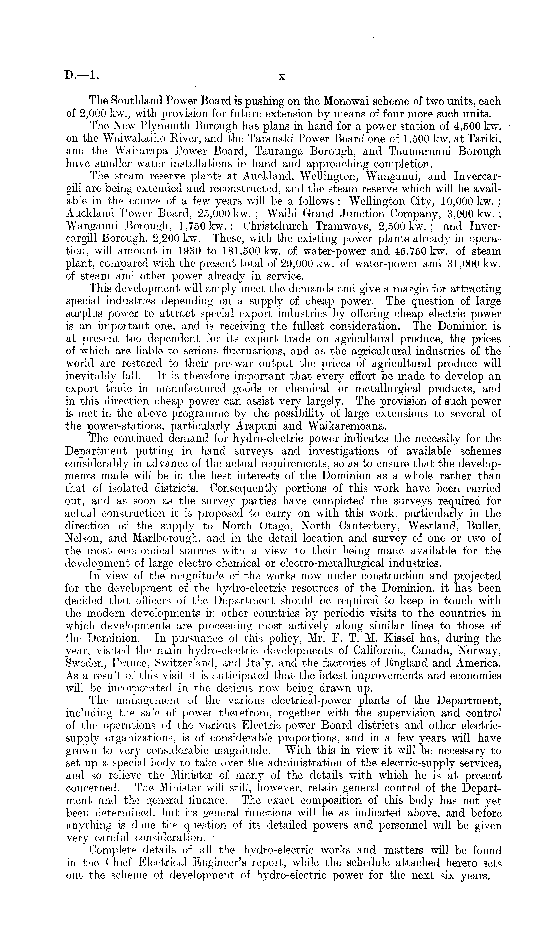 The Southland Power Board is pushing on the Monowai scheme of two units, each of 2,000 kw., with provision for future extension by means of four more such units. The New Plymouth Borough has plans in hand for a power-station of 4,500 kw. on the Waiwakaiho River, and the Taranaki Power Board one of 1,500 kw. at Tariki, and the Wairarapa Power Board, Tauranga Borough, and Taumarunui Borough have smaller water installations in hand and approaching completion. The steam reserve plants at Auckland, Wellington, Wanganui, and Invercargill are being extended and reconstructed, and the steam reserve which will be available in the course of a few years will be a follows : Wellington City, 10,000 kw. ; Auckland Power Board, 25,000 kw. ; Waihi Grand Junction Company, 3,000 kw. ; Wanganui Borough, 1,750 kw.; Christchurch Tramways, 2,500 kw. ; and Invercargill Borough, 2,200 kw. These, with the existing power plants already in operation, will amount in 1930 to 181,500 kw. of water-power and 45,750 kw. of steam plant, compared with the present total of 29,000 kw. of water-power and 31,000 kw. of steam and other power already in service. This development will amply meet the demands and give a margin for attracting special industries depending on a supply of cheap power. The question of large surplus power to attract special export industries by offering cheap electric power is an important one, and is receiving the fullest consideration. The Dominion is at present too dependent for its export trade on agricultural produce, the prices of which are liable to serious fluctuations, and as the agricultural industries of the world are restored to their pre-war output the prices of agricultural produce will inevitably fall. It is therefore important that every effort be made to develop an export trade in manufactured goods or chemical or metallurgical products, and in this direction cheap power can assist very largely. The provision of such power is met in the above programme by the possibility of large extensions to several of the power-stations, particularly Arapuni and Waikaremoana. The continued demand for hydro-electric power indicates the necessity for the Department putting in hand surveys and investigations of available schemes considerably in advance of the actual requirements, so as to ensure that the developments made will be in the best interests of the Dominion as a whole rather than that of isolated districts. Consequently portions of this work have been carried out, and as soon as the survey parties have completed the surveys required for actual construction it is proposed to carry on with this work, particularly in the direction of the supply to North Otago, North Canterbury, Westland, Buller, Nelson, and Marlborough, and in the detail location and survey of one or two of the most economical sources with a view to their being made available for the development of large electro-chemical or electro-metallurgical industries. In view of the magnitude of the works now under construction and projected for the development of the hydro-electric resources of the Dominion, it has been decided that officers of the Department should be required to keep in touch with the modern developments in other countries by periodic visits to the countries in which developments are proceeding most actively along similar lines to those of the Dominion. In pursuance of this policy, Mr. F. T. M. Kissel has, during the year, visited the main hydro-electric developments of California, Canada, Norway, Sweden, France, Switzerland, and Italy, and the factories of England and America. As a result of this visit it is anticipated that the latest improvements and economies will be incorporated in. the designs now being drawn up. The management of the various electrical-power plants of the Department, including the sale of power therefrom, together with the supervision and control of the operations of the various Electric-power Board districts and other electricsupply organizations, is of considerable proportions, and in a few years will have grown to very considerable magnitude. With this in view it will be necessary to set up a special body to take over the administration of the electric-supply services, and so relieve the Minister of many of the details with which he is at present concerned. The Minister will still, however, retain general control of the Department and the general finance. The exact composition of this body has not yet been determined, but its general functions will be as indicated above, and before anything is done the question of its detailed powers and personnel will be given very careful consideration. Complete details of all the hydro-electric works and matters will be found in the Chief Electrical Engineer's report, while the schedule attached hereto sets out the scheme of development of hydro-electric power for the next six years.
