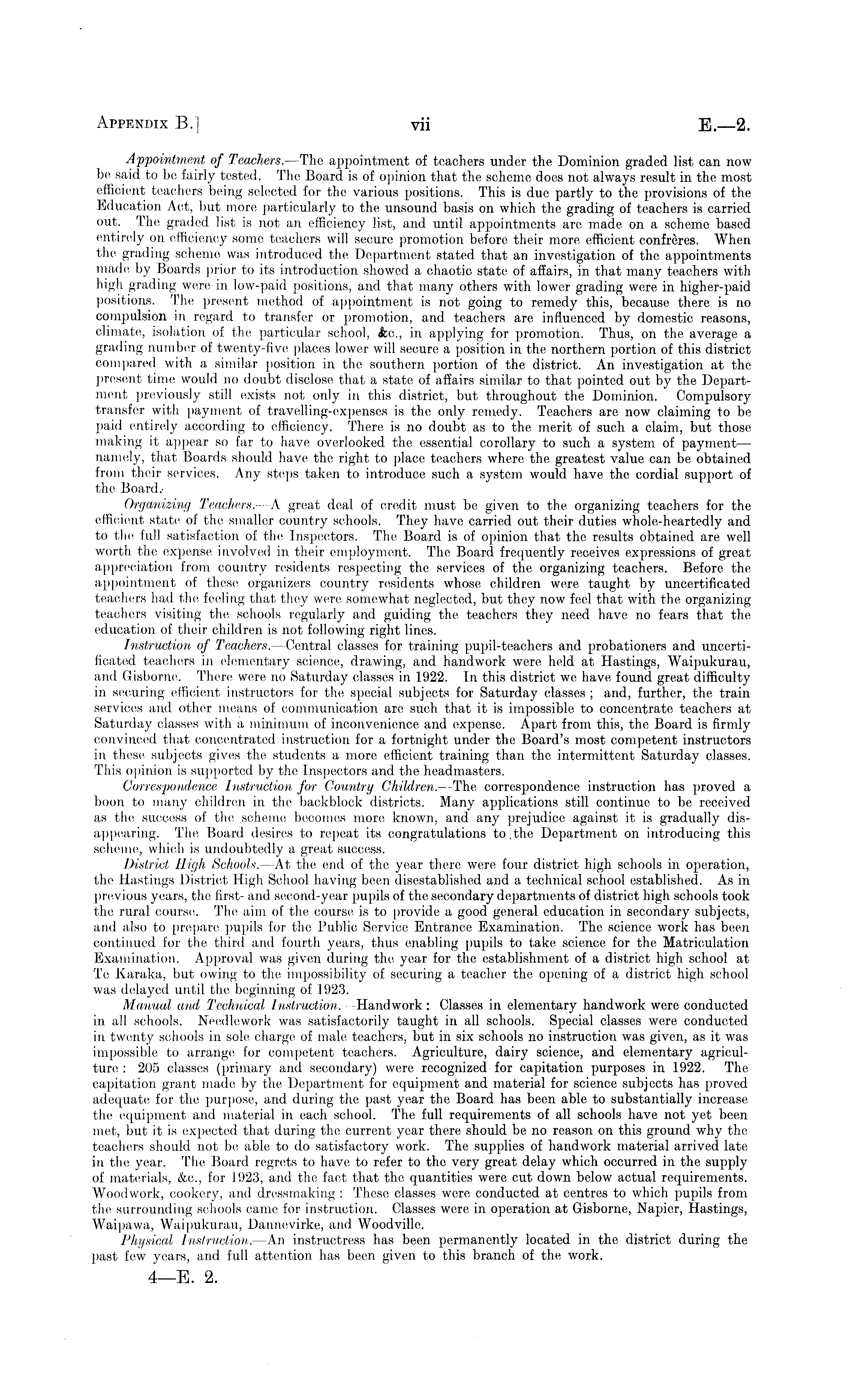 Appointment of Teachers. —The appointment of teachers under the Dominion graded list can now be said to be fairly tested. The Board is of opinion that the scheme does not always result in the most efficient teachers being selected for the various positions. This is due partly to the provisions of the Education Act, but more particularly to the unsound basis on which the grading of teachers is carried out. The graded list is not an efficiency list, and until appointments arc made on a scheme based entirely on efficiency some teachers will secure promotion before their more efficient confreres. When the grading scheme was introduced the Department stated that an investigation of the appointments made, by Boards prior to its introduction showed a chaotic state of affairs, in that many teachers with high grading were in low-paid positions, and that many others with lower grading were in higher-paid positions. The present method of appointment is not going to remedy this, because there is no compulsion in regard to transfer or promotion, and teachers are influenced by domestic reasons, climate, isolation of the particular school, <fee, in applying for promotion. Thus, on the average a grading number of twenty-five places lower will secure a position in the northern portion of this district compared with a similar position in the southern portion of the district. An investigation at the present time would no doubt disclose that a state of affairs similar to that pointed out by the Department previously still exists not only in this district, but throughout the Dominion. Compulsory transfer with payment of travelling-expenses is the only remedy. Teachers are, now claiming to be paid entirely according to efficiency. There is no doubt as to the merit of such a claim, but those making it appear so far to have overlooked the essential corollary to such a system of payment — namely, that Boards should have the right to place teachers where the greatest value can be obtained from their services. Any steps taken to introduce such a system would have the cordial support of the Board.Organizing Teachers.—A great deal of credit must be given to the organizing teachers for the efficient state of the smaller country schools. They have carried out their duties whole-heartedly and to the full satisfaction of the Inspectors. The Board is of opinion that the results obtained are well worth the expense involved in their employment. The Board frequently receives expressions of great appreciation from country residents respecting the services of the organizing teachers. Before the appointment of these organizers country residents whose children were taught by uncertificated teachers had the feeling that they were somewhat neglected, but they now feel that with the organizing teachers visiting the schools regularly and guiding the teachers they need have no fears that the, education of their children is not following right lines. Instruction of Teachers. —Central classes for training pupil-teachers and probationers and uncertificated teachers in elementary science, drawing, and handwork were held at Hastings, Waipukurau, and Gisborne. There were no Saturday classes in 1922. In this district we have, found great difficulty in securing efficient instructors for the special subjects for Saturday classes ; and, further, the train services and other means of communication are such that it is impossible to concentrate teachers at Saturday classes with a minimum of inconvenience and expense. Apart from this, the Board is firmly convinced that concentrated instruction for a fortnight under the Board's most competent instructors in these subjects gives the students a more efficient training than the intermittent Saturday classes. This opinion is supported by the Inspectors and the headmasters. Correspondence Instruction for Country Children. —The correspondence instruction has proved a boon to many children in the backblock districts. Many applications still continue to be received as the success of the scheme becomes more known, and any prejudice against it is gradually disappearing. The, Board desires to repeat its congratulations to.the Department on introducing this scheme, which is undoubtedly a great success. District High Schools. —At the end of the year there were, four district high schools in operation, the Hastings District High School having been disestablished and a technical school established. As in previous years, the first- and second-year pupils of the secondary departments of district high schools took the rural course. The aim of the, course is to provide a good general education in secondary subjects, and also to prepare pupils for the Public Service Entrance Examination. The science work has been continued for the third and fourth years, thus enabling pupils to take science for the Matriculation Examination. Approval was given during the, year for the establishment of a district high school at Te Karaka, but owing to the impossibility of securing a teacher the opening of a district high school was delayed until the beginning of 1923. Manual and Technical Instruction. -Handwork: Classes in elementary handwork were conducted in all schools. Needlework was satisfactorily taught in all schools. Special classes were conducted in twenty schools in sole charge of male teachers, but in six schools no instruction was given, as it was impossible, to arrange for competent teachers. Agriculture, dairy science, and elementary agriculture : 205 classes (primary and secondary) were recognized for capitation purposes in 1922. The capitation grant made by the Department for equipment and material for science subjects has proved adequate for the purpose, and during the past year the Board has been able to substantially increase the equipment and material in each school. The full requirements of all schools have not yet been met, but it is expected that during the current year there should be no reason on t