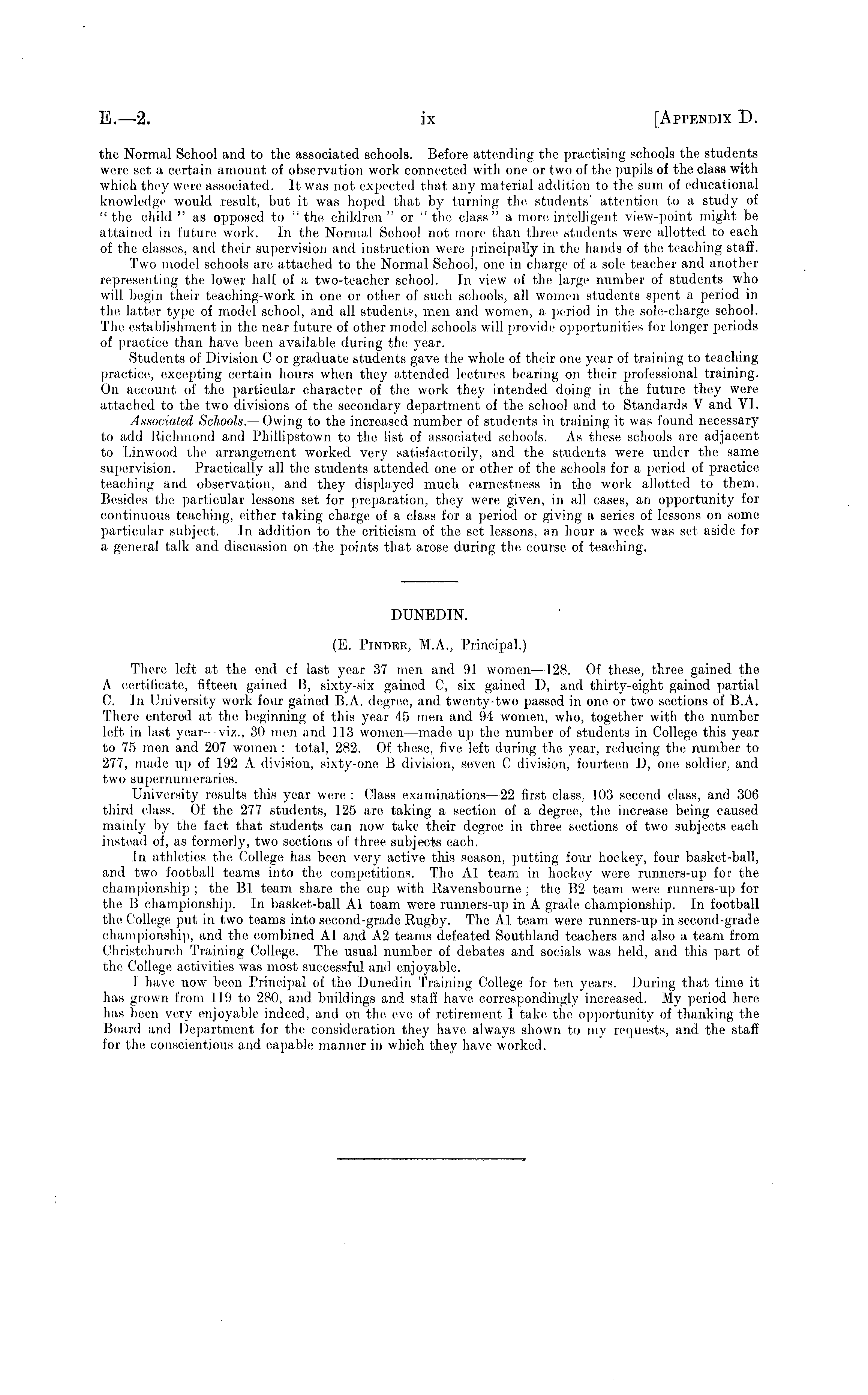 DUNEDIN. (E. Piniier, M.A., Principal.) There left at the end cf last year 37 men and 91 women —128. Of these, three gained the A certificate, fifteen gaine;d B, sixty-six gained C, six gained 1), and thirty-eight gained partial C. In University work four gained B.A. degree, and twenty-two passed in one or two sections of B.A. There entered at the beginning of this year 45 men and 94 women, who, together with the number left in last year —viz., 30 mem and 113 women —made up the number of students in College this year to 75 men and 207 women : total, 282. Of these, five left during the year, reducing the number to 277, made up of 192 A division, sixty-cmc B elivision, seven C division, fourteen D, one soldier, anel two supernumeraries. University results this year were : Class examinations- -22 first class, 103 second class, and 306 thirel e-lass. Of the 277 students, 125 are taking a section of a degree, the increase being caused mainly by the fact that students can now take their degree in three sections of two subjects each instead of, as formerly, two sections of three subjects each. In athletics the College has been very active this season, putting four hockey, four basket-ball, and two football teams into the competitions. The Al team in hockey were runners-up for the championship ; the Bl team share the cup with Ravensbourne ; the B2 team were runners-up for the B championship. In basket-ball Al team were runners-up in A grade championship. In football the College put in two teams into second-graeie Rugby. The Al team wore runners-up in second-grade championship, and the combined Al and A 2 teams defeated Southland teachers and also a team from Christchurch Training College. The usual number of debates and socials was held, and this part of the College activities was most successful and enjoyable. 1 have now been Principal of the Dunedin Training College for ten years. During that time it has grown from 119 to 280, and buildings and staff have correspondingly increased. My period here lias been very enjoyable indeed, and on the eve of retirement 1 take the opportunity of thanking the Board anel Department for the consideration they have always shown to my requests, and the staff for the conscientious and capable manner in which they have worked.
