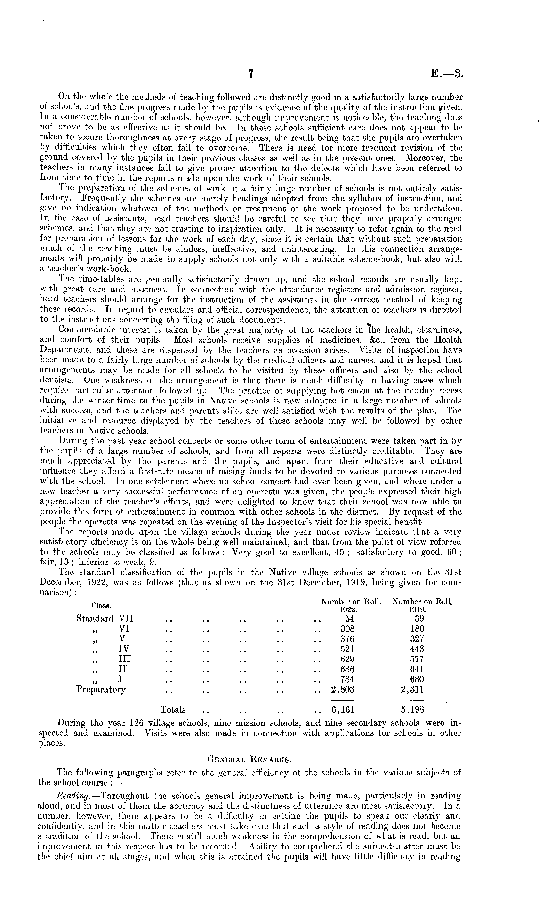 On the whole the methods of teaching followed are distinctly good in a satisfactorily large number of schools, and the fine progress made by the pupils is evidence of the quality of the instruction given. In a considerable number of schools, however, although improvement is noticeable, the teaching does not prove to be as effective as it should be. In these schools sufficient care does not appear to be taken to secure thoroughness at every stage of progress, the result being that the pupils are overtaken by difficulties which they often fail to overcome. There is need for more frequent revision of the ground covered by the pupils in their previous classes as well as in the present ones. Moreover, the teachers in many instances fail to give proper attention to the defects which have been referred to from time to time in the reports made upon the work of their schools. The preparation of the schemes of work in a fairly large number of schools is not entirely satisfactory. Frequently the schemes are merely headings adopted from the syllabus of instruction, and give no indication whatever of the methods or treatment of the work proposed to be undertaken. In the case of assistants, head teachers should bo careful to see that they have properly arranged schemes, and that they are not trusting to inspiration only. It is necessary to refer again to the need lor preparation of lessons for the work of each day, since it is certain that without such preparation much of the teaching must be aimless, ineffective, and uninteresting. In this connection arrangements will probably be made to supply schools not only with a suitable scheme-book, but also with a teacher's work-book. The time-tables are generally satisfactorily drawn up, and the school records are usually kept with great care and neatness. In connection with the attendance registers and admission register, head teachers should arrange for the instruction of the assistants in the correct method of keeping these records. In regard to circulars and official correspondence, the attention of teachers is directed to the instructions concerning the filing of such documents. Commendable interest is taken by the great majority of the teachers in the health, cleanliness, and comfort of their pupils. Most schools receive supplies of medicines, &c, from the Health Department, and these are dispensed by the teachers as occasion arises. Visits of inspection have been made to a fairly large number of schools by the medical officers and nurses, and it is hoped that arrangements may be made for all schools to be visited by these officers and also by the school dentists. One weakness of the arrangement is that there is much difficulty in having cases which, require particular attention followed up. The practice of supplying hot cocoa at the midday recess during the winter-time to the pupils in Native schools is now adopted in a large number of schools with success, and the teachers and parents alike are well satisfied with the results of the plan. The initiative and resource displayed by the teachers of these schools may well be followed by other teachers in Native schools. During the past year school concerts or some other form of entertainment were taken part in by the pupils of a large number of schools, and from all reports were distinctly creditable. They are much appreciated by the parents and the pupils, and apart from, their educative and cultural influence they afford a first-rate means of raising funds to be devoted to various purposes connected with the school. In one settlement whore no school concert had ever been given, and where under a new teacher a very successful performance of an operetta was given, the people expressed their high appreciation of the teacher's efforts, and were delighted to know that their school was now able to provide this form of entertainment in common with other schools in the district. By request of the people the operetta was repeated on the evening of the Inspector's visit for his special benefit. The reports made upon the village schools during the year under review indicate that a very satisfactory efficiency is on the whole being well maintained, and that from the point of view referred to the schools may be classified as follows : Very good to excellent, 45 ; satisfactory to good, 60 ; fair, 13 ; inferior to weak, 9. The standard classification of the pupils in the Native village schools as shown on the 31st December, 1922, was as follows (that as shown on the 31st December, 1919, being given for comparison) : — p] Number on Roll. Number on Roll, mss - 1922. 1919. Standard VII .. .. .. .. 54 39 VI .. .. .. .. ..308 180 V .. .. .. .. ..376 327 IV .. .. .. .. ..521 443 111 .. .. .. .. ..629 577 II .. .. .. .. ..686 641 I .. .. .. .. ..784 680 Preparatory .. .. .. .. .. 2,803 2,311 Totals .. .. .. .. 6,161 5,1.98 During the year 126 village schools, nine mission schools, and nine secondary schools were inspected and examined. Visits were also made in connection with applications for schools in other places. General Remarks. The following paragraphs refer to the general efficiency of the schools in the various subjects of the school course : — Reading. —Throughout the schools general improvement is being made, particularly in reading aloud, and in most of them the accuracy and the distinctness of utterance are most satisfactory. In a number, however, there appears to be a difficulty in getting the pupils to speak out clearly and confidently, and in this matter teachers must take care that such a style of reading does not become a tradition of the school. There is still much weakness in the comprehension of what is read, but an improvement in this respect has to be recorded. Ability to comprehend the subject-matter must be the chief aim at all stages, and when this is attained the pupils will have little difficulty in reading